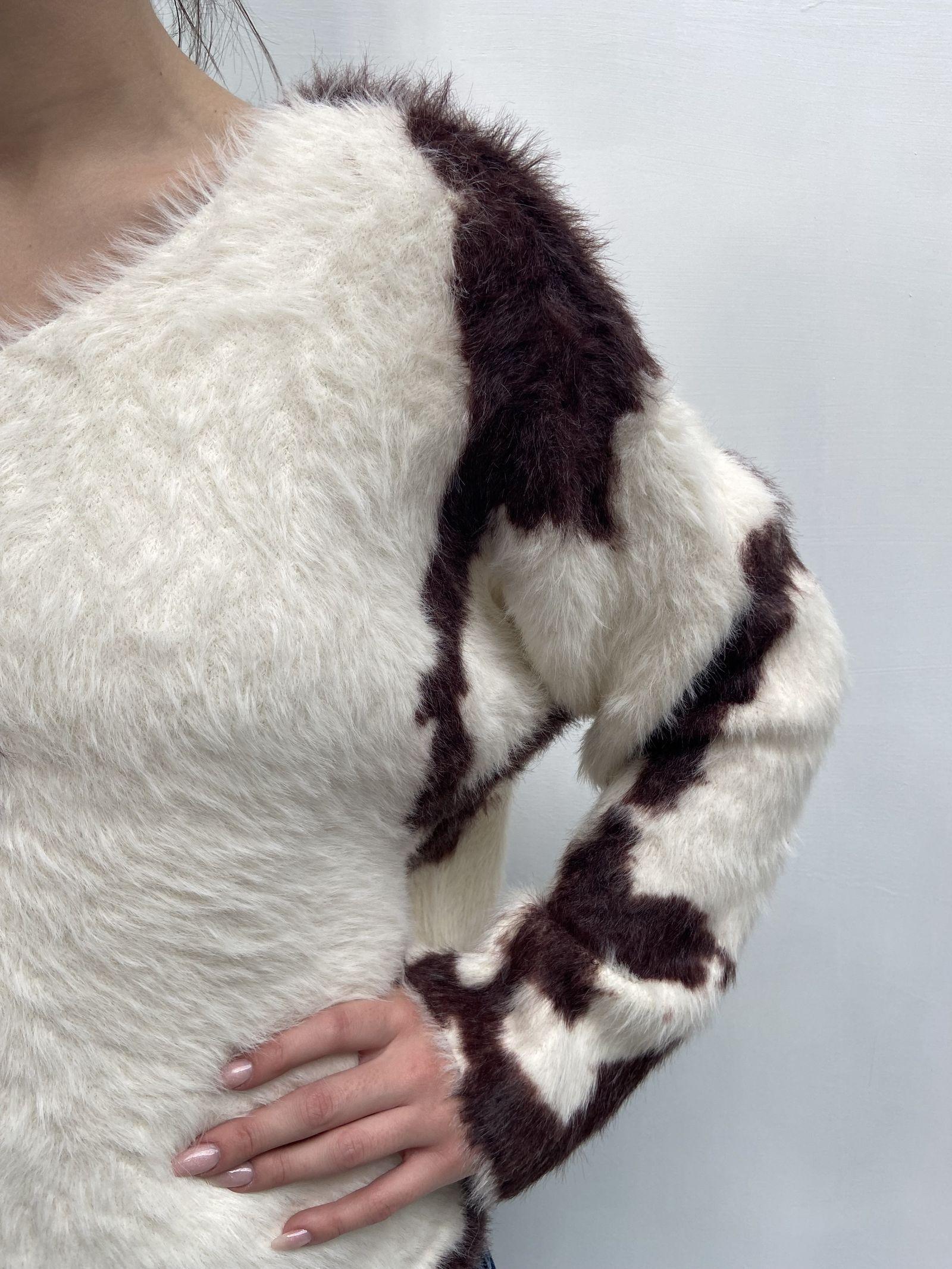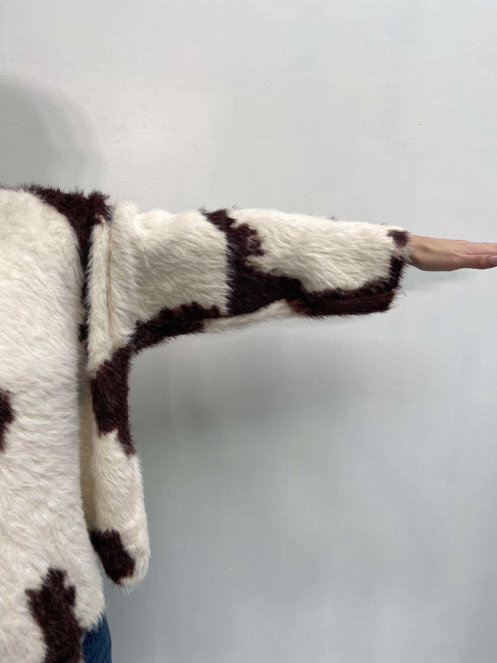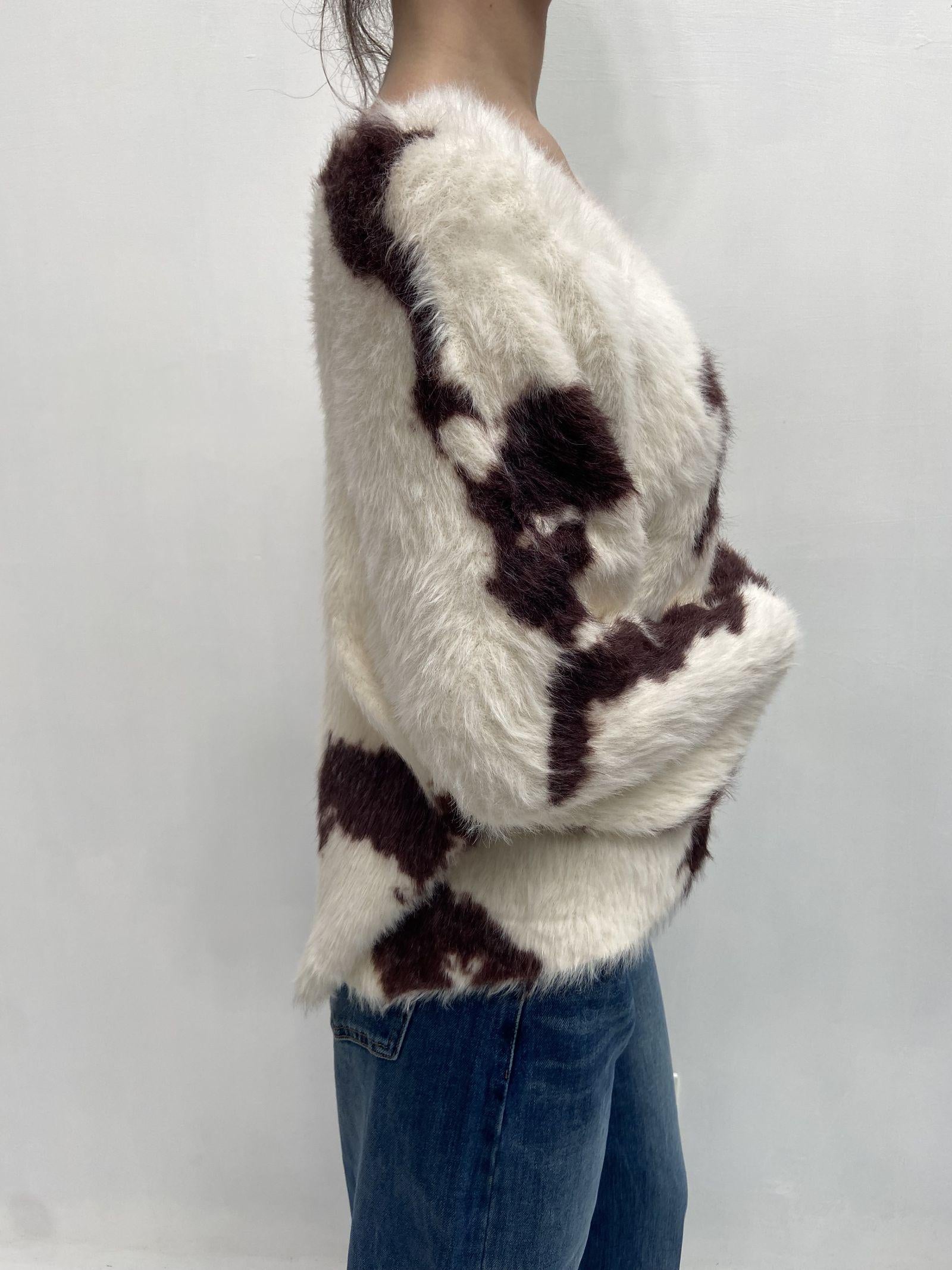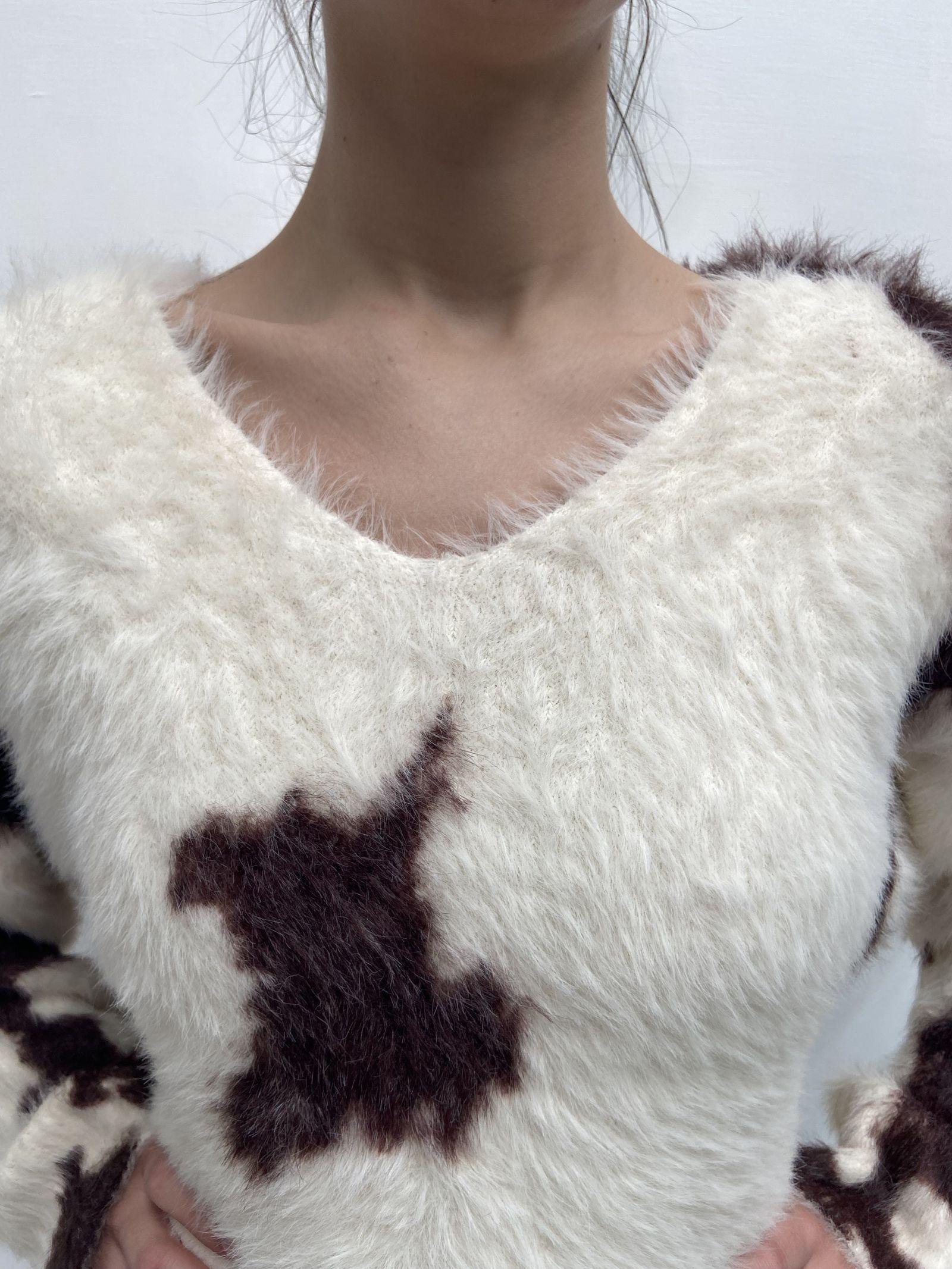 Comoda e originale, questa maglia scollo a V dalla vestibilità ampia è realizzata in un tessuto soffice dalla texture effetto peluche, piacevole al tatto e visivamente accattivante. Il motivo a macchie dona carattere al capo, perfetto per aggiungere un tocco di personalità ai tuoi look quotidiani.