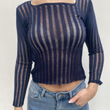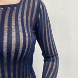 Questa maglia a maniche lunghe è l’equilibrio perfetto tra eleganza minimale e carattere deciso. Realizzata in un tessuto leggero e trasparente, si adatta perfettamente al corpo grazie al taglio aderente, valorizzando le forme con naturalezza. Il girocollo leggermente squadrato dona un tocco moderno e raffinato, rendendola un capo versatile da indossare sia da sola per un look audace, sia come base sotto giacche, abiti o top strutturati.