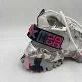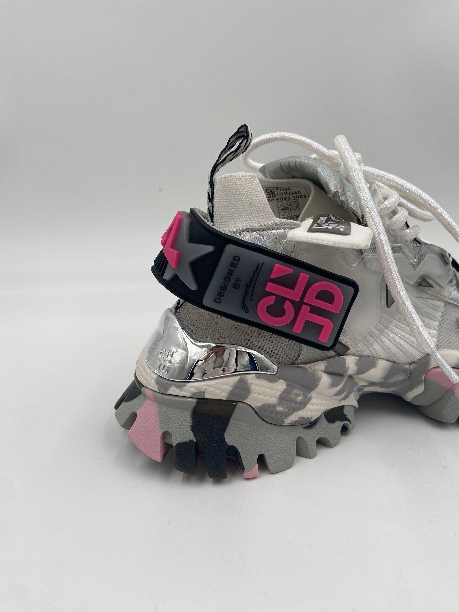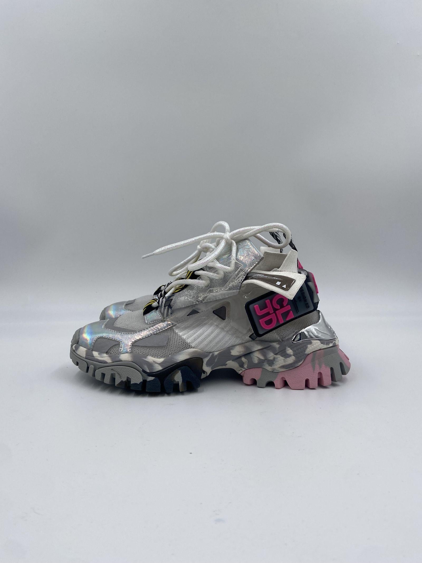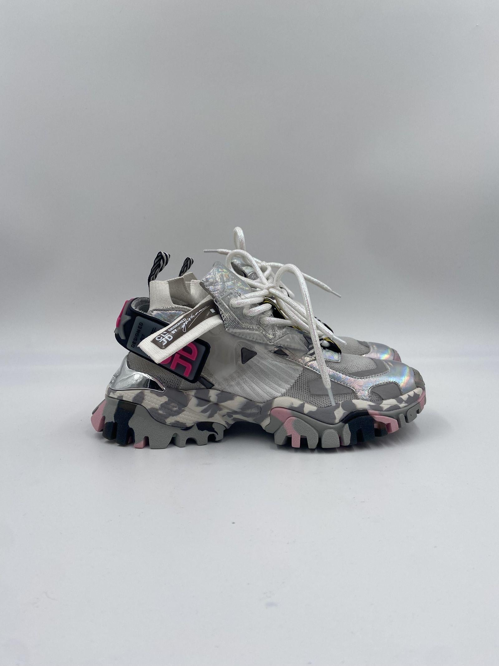 Sneakers multipatch in pelle, con stampa grigio e rosa, impreziosite da applicazioni in PVC ed airbag laterale, ed occhielli rinforzati in PVC. Hanno una fodera in tessuto, suola in gomma outdoor e inserti in mesh e pvc e un altezza suola 40 mm, un plantare estraibile e lavabile. Con queste sneakers puoi vivere le tue avventure quotidiane con una marcia in più. Un disegn sofisticato che gioca con le palette di colore, materiali e forme unici per rendere il tuo street outfit sensazionale.