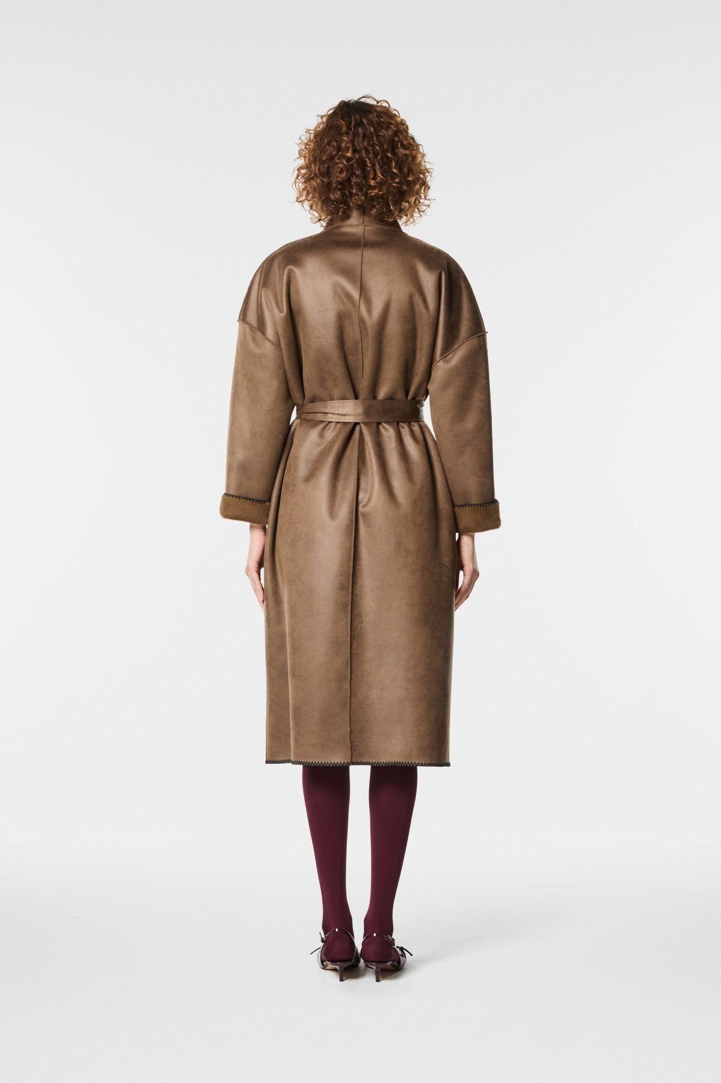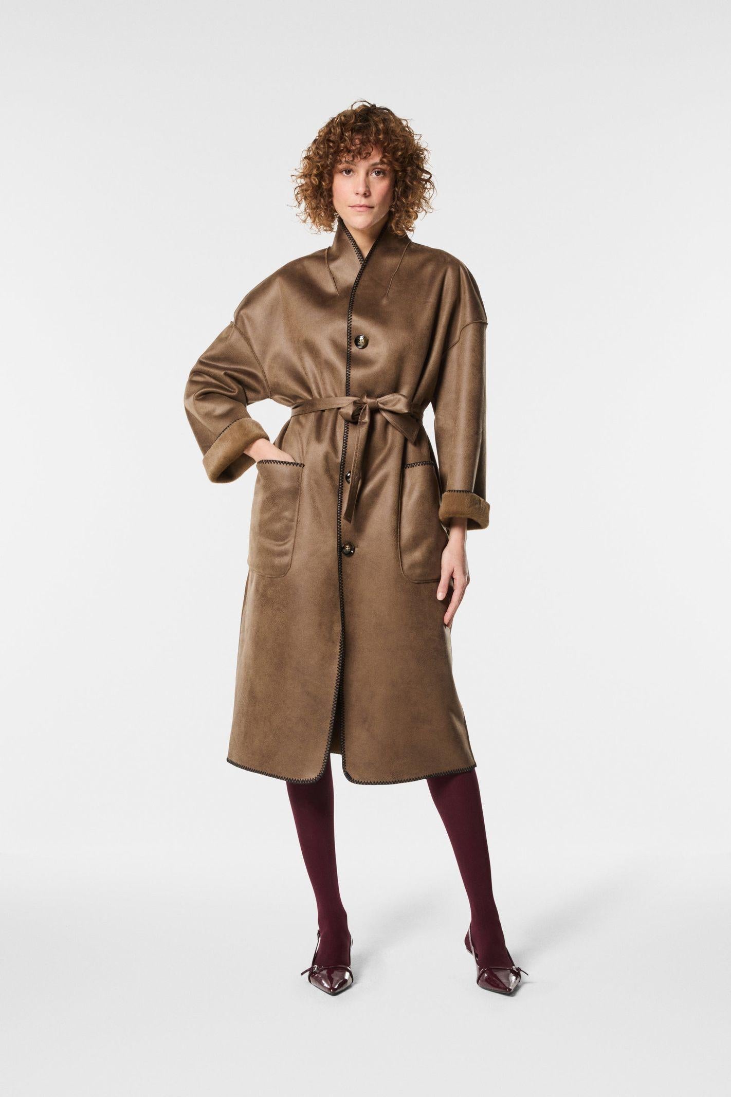 Elegante cappotto in ecovisone con cintura, ideale per chi ama unire comfort e femminilità. Morbido e avvolgente, sottolinea la vita con un tocco sofisticato. Perfetto da indossare per un outfit sofisticato con un tocco contemporaneo.