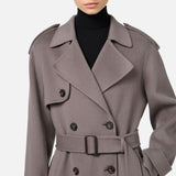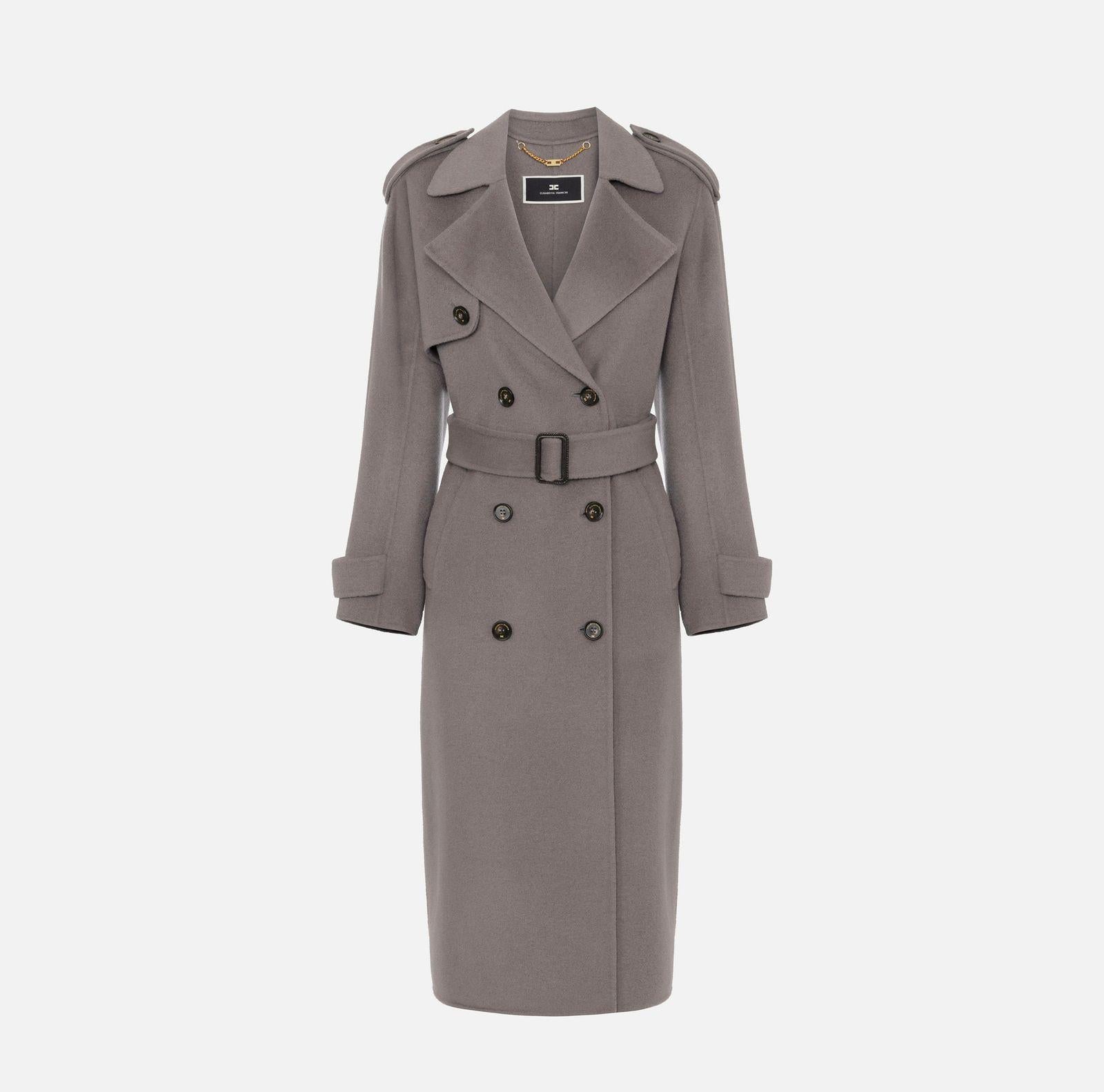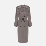 Trench cappotto in pura lana, con punto vita enfatizzato da una cintura staccabile nello stesso colore e tessuto, con fibbia ricoperta in materiale sintetico effetto pelle,chiusura doppiopetto con bottoni effetto corno e due tasche frontali a filetto.