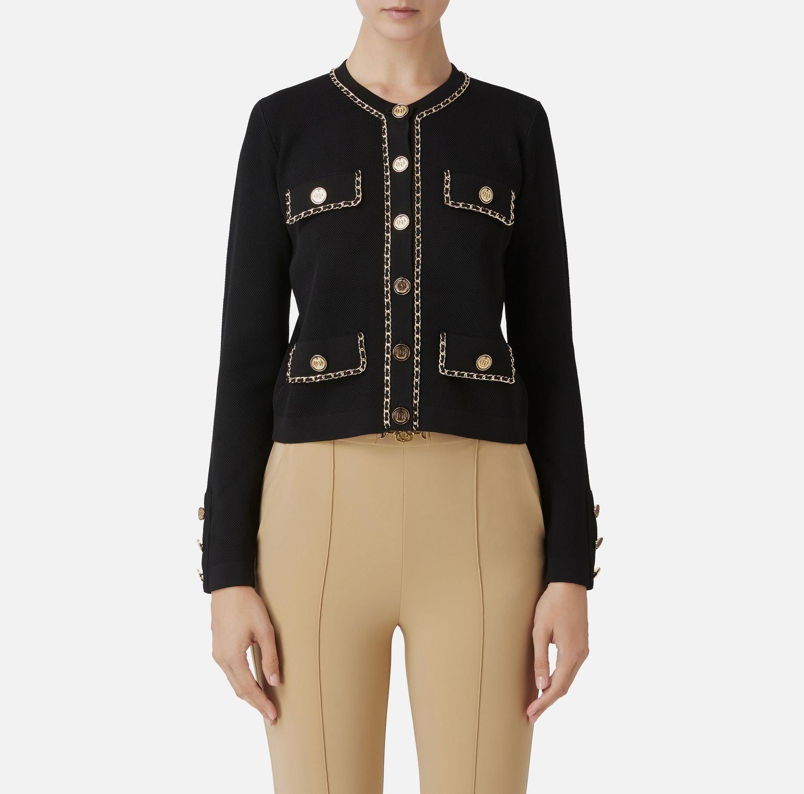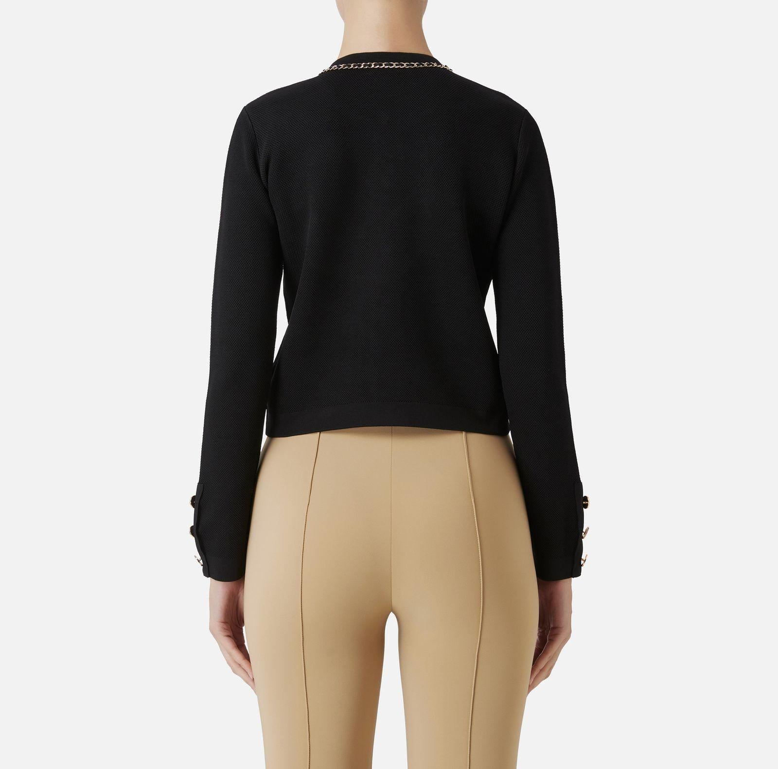 Maglia giacca realizzata in viscosa punto nido d'ape, modello cropped, con chiusura monopetto con bottoni in metallo dorato, caratterizzata da patte e scollo profilati da catena oro infilata.
