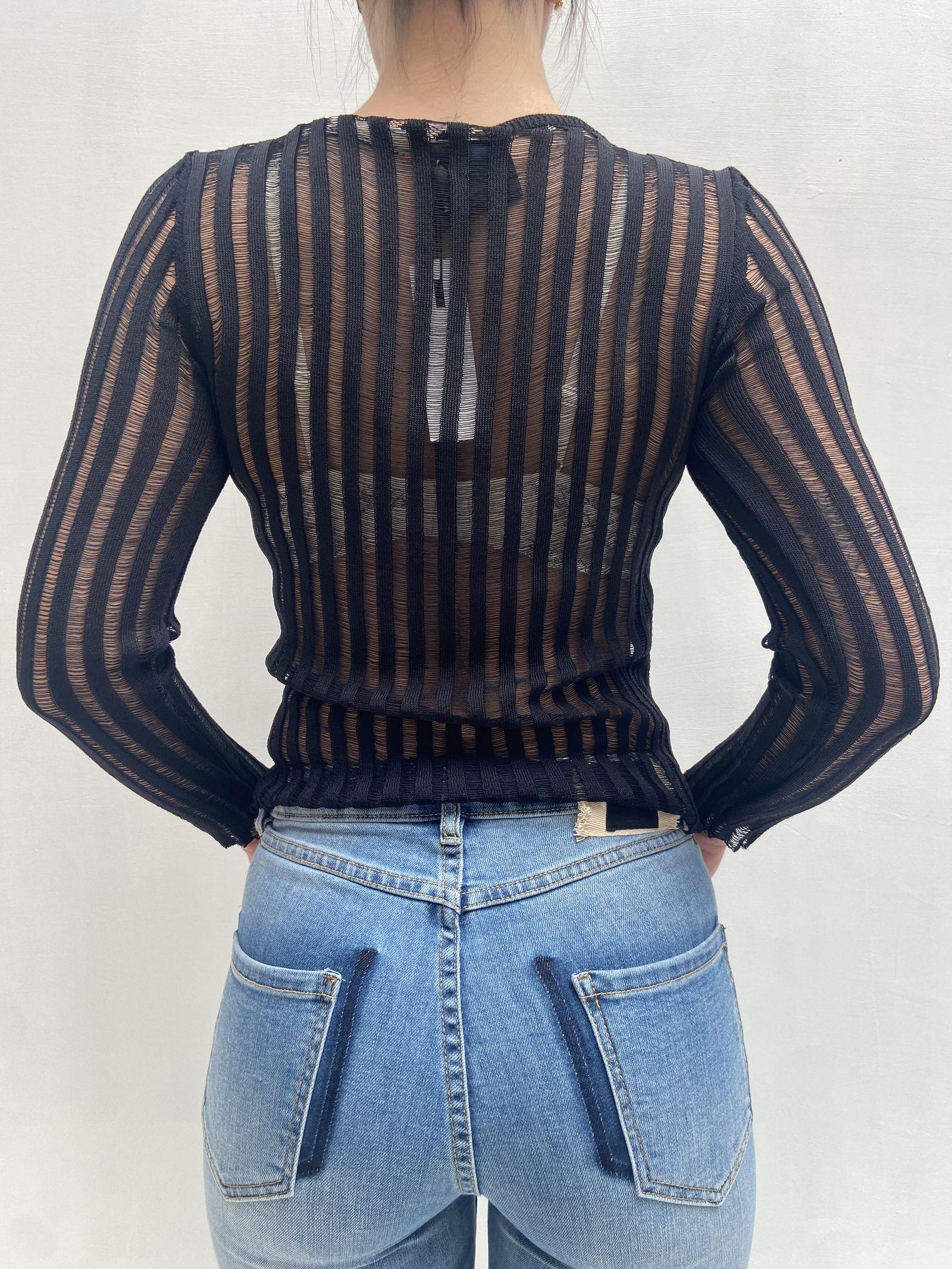Questa maglia a maniche lunghe è l’equilibrio perfetto tra eleganza minimale e carattere deciso. Realizzata in un tessuto leggero e trasparente, si adatta perfettamente al corpo grazie al taglio aderente, valorizzando le forme con naturalezza. Il girocollo leggermente squadrato dona un tocco moderno e raffinato, rendendola un capo versatile da indossare sia da sola per un look audace, sia come base sotto giacche, abiti o top strutturati.