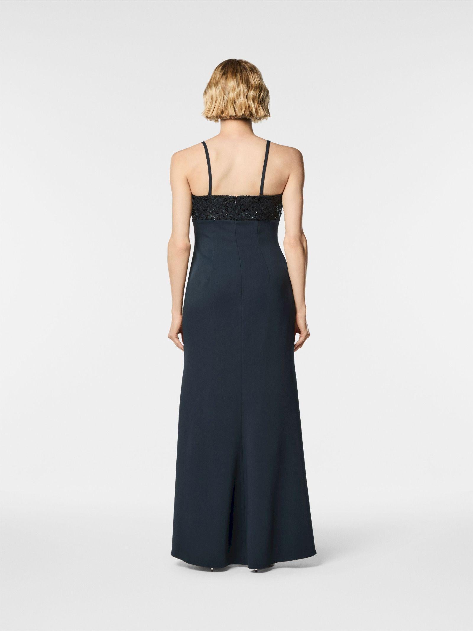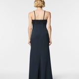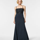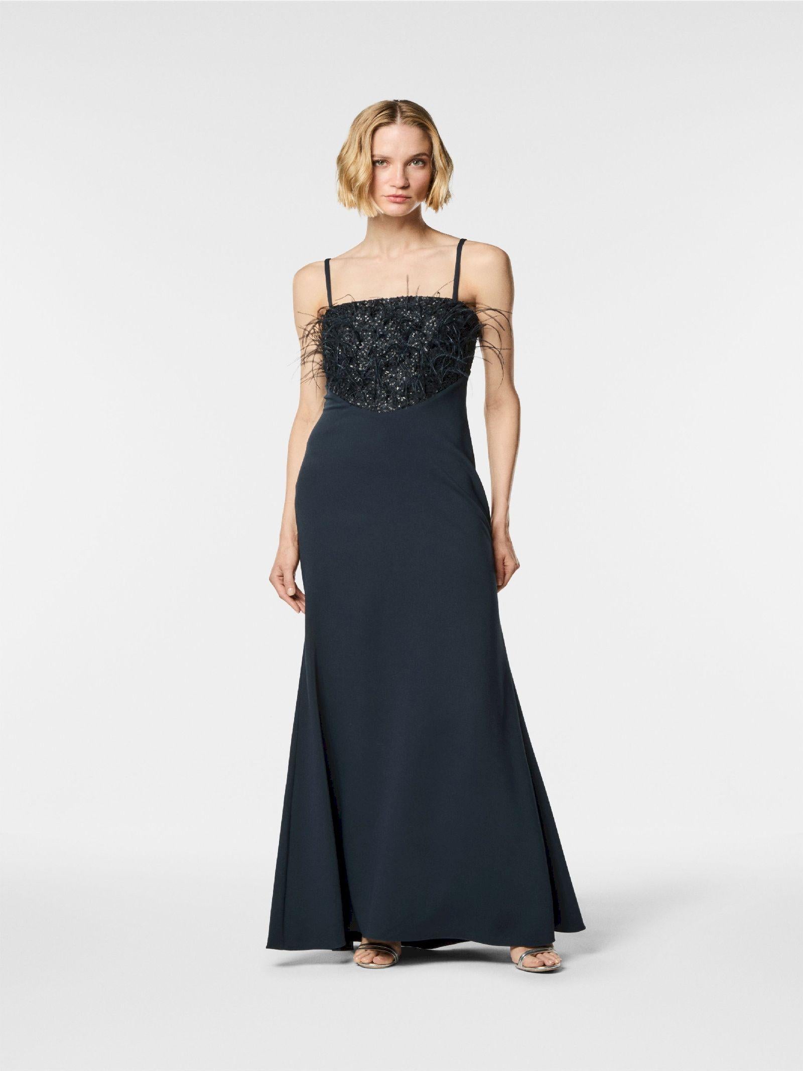 Abito lungo con spalline sottili, dal fascino sofisticato.Ha la silhouette slanciata e il design ricercato che lo rendono perfetto per eventi esclusivi e serate indimenticabili. Il busto è impreziosito da un ricamo scintillante di paillettes e delicate piume applicate, che donano movimento e eleganza.