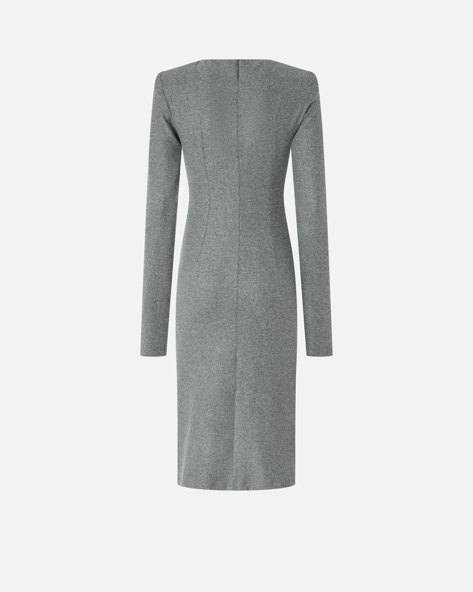 Vestito midi aderente a maniche lunghe con spalle strutturate e collo con bottoncino e apertura a goccia sul retro, realizzato in flanella di jersey di misto lana tinto in filo, un tessuto perfetto per combinare morbidezza, elasticità e comfort. Il modello mostra un'estetica essenziale, arricchita però da dettagli d'impatto come i dinamici drappeggi sul davanti e la zip laterale che permette di regolare l'apertura dello spacco. Questo abito è ideale per creare un outfit quotidiano dal touch femminile e personale, da indossare anche in ufficio.
