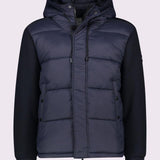 Piumino in nylon con trapuntatura a righe, caratterizzato da cappuccio con coulisse e maniche in maglia a coste elasticizzata, tasche laterali con bottoni a pressione, logo sulla manica, chiusura coperta con bottoni a pressione euna zip, fodera interna.