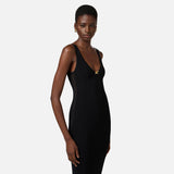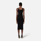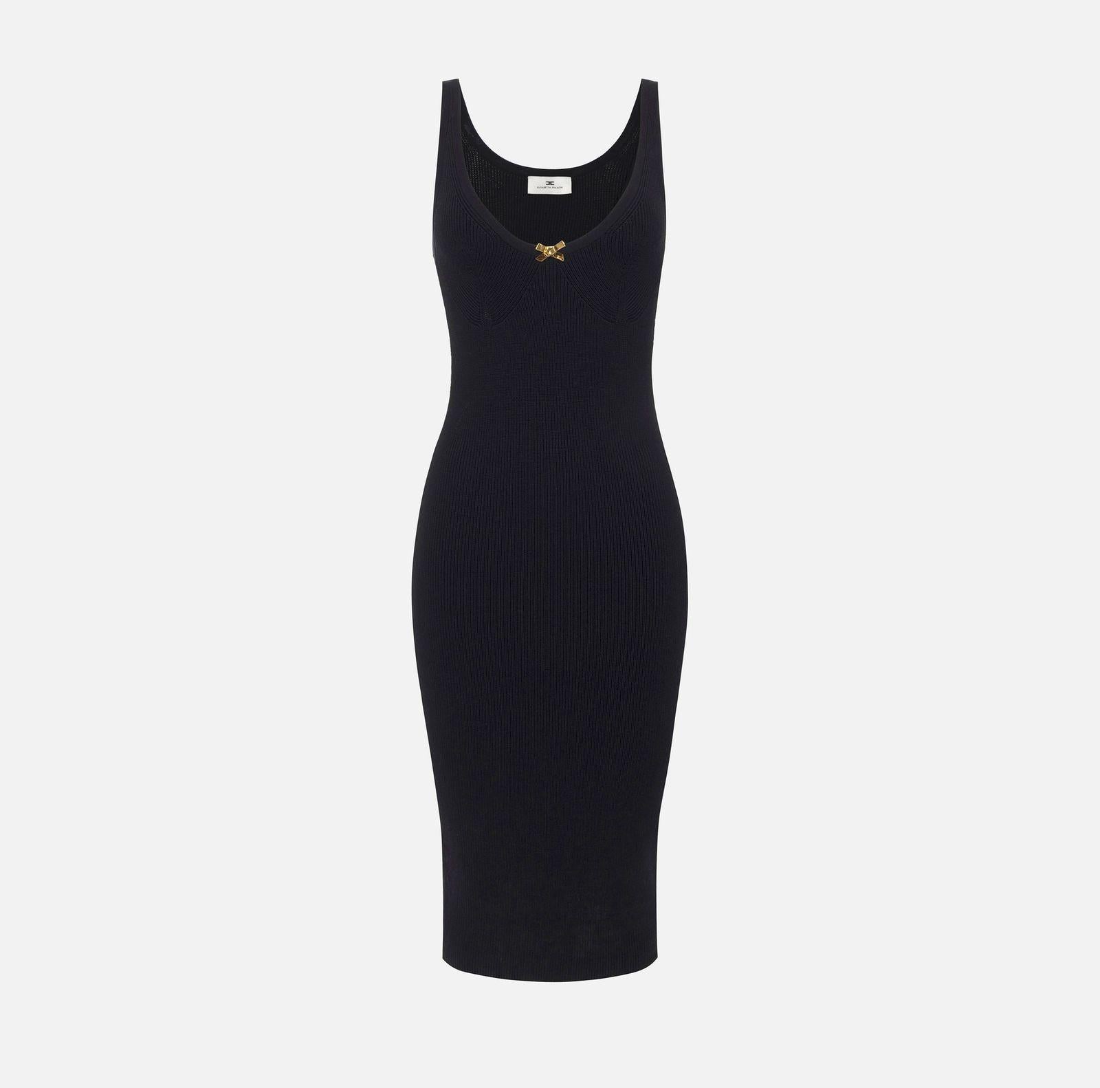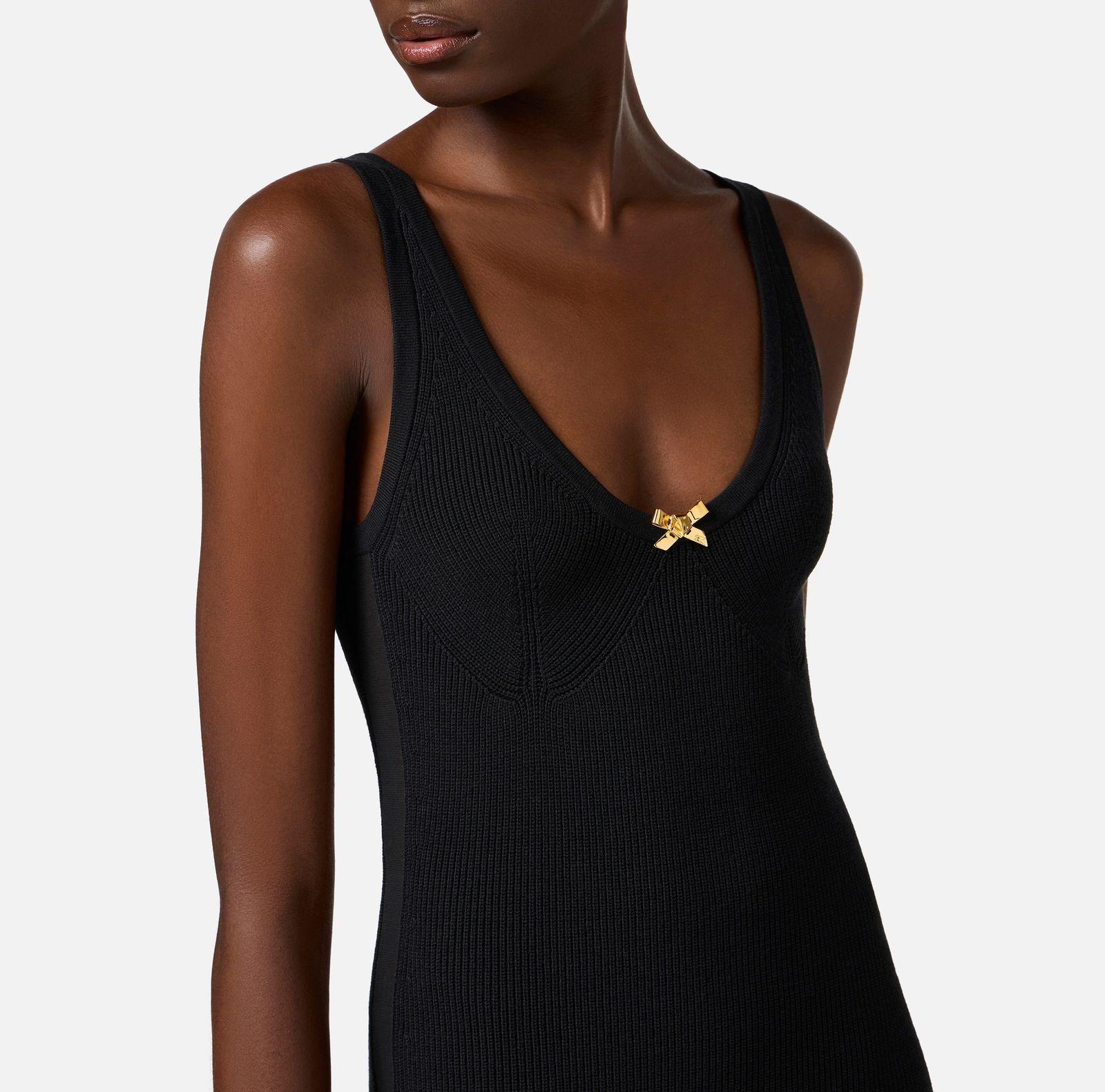 Abito smanicato in maglia punto pannocchia con gonna longuette e vestibilità aderente. Inserti in tulle elasticizzato decorano i fianchi, mentre il busto presenta lavorazione a ventaglio e un fiocco in metallo dorato con logo.
