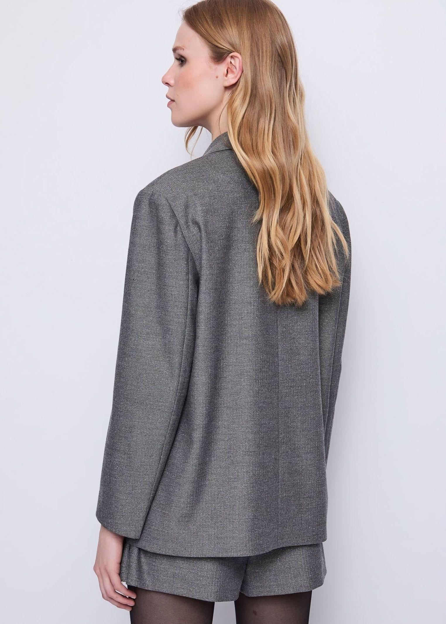 Illumina il tuo stile con questo blazer in misto viscosa e lurex elasticizzato, definito da un elegante motivo chevron che conferisce carattere e raffinatezza al design. Il revers classico e la costruzione monopetto valorizzano la linea con uneleganza minimal chic, mentre le tasche con patta aggiungono un tocco di praticità. La relaxed fit dona comfort e fluidità, rendendo questo blazer il capo ideale per completare look moderni e femminili con una nota sofisticata e senza tempo.