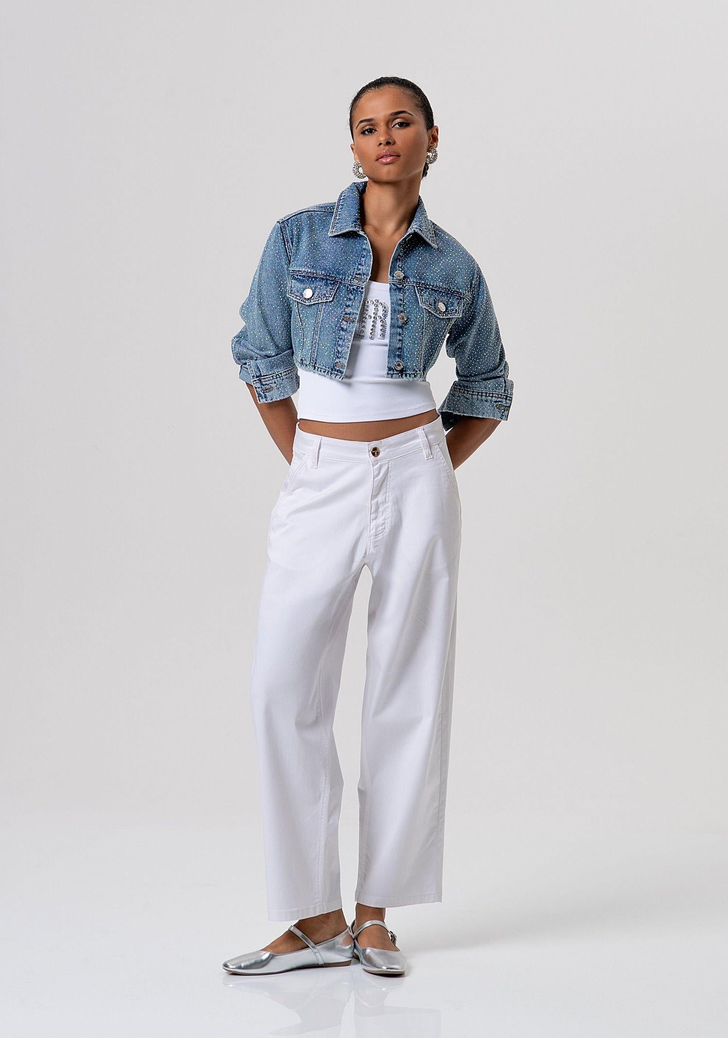 Giacca cropped in denim con lavaggio medio, ideale per completare outfit casual e casual chic. Il modello è impreziosito da strass decorativi che donano luminosità e un tocco glamour, rendendola perfetta anche per look serali, aperitivi o occasioni informali. Il taglio corto e moderno valorizza la silhouette e si abbina facilmente a jeans, pantaloni a vita alta, gonne o abiti. Realizzata in denim confortevole, è una giacca versatile pensata per la mezza stagione e adatta a uno stile urbano e contemporaneo.