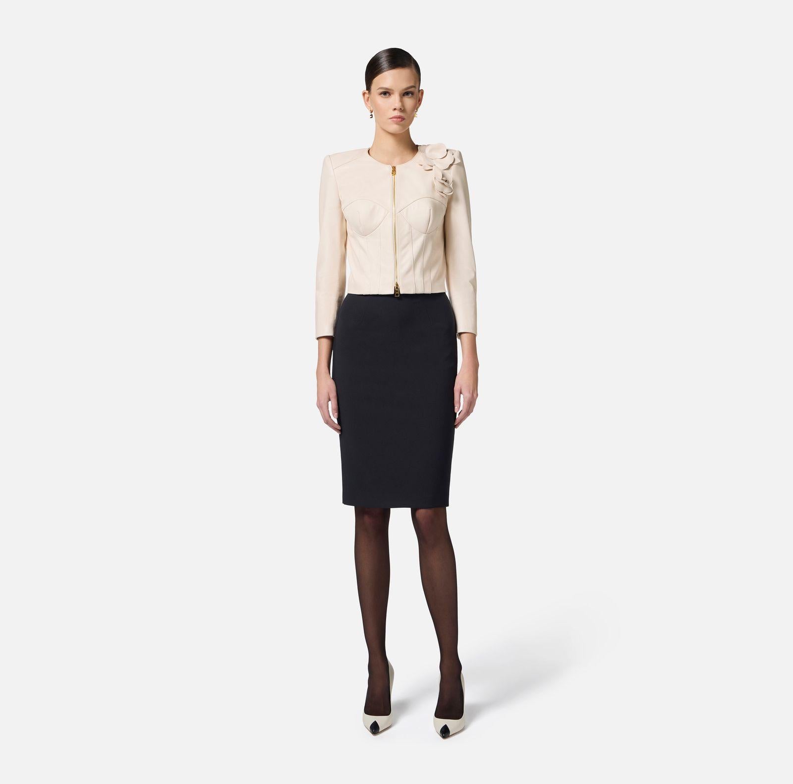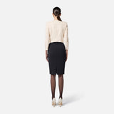 Gonna realizzata in tessuto doppio crepe stretch con taglio longuette e spacco sul retro, caratterizzata dal dettaglio del fiocco in gros-grain centrale posizionato sul fascione e dallo smerlo ricamato in vita, vestibilità slim, zip invisibile e fodera in raso.