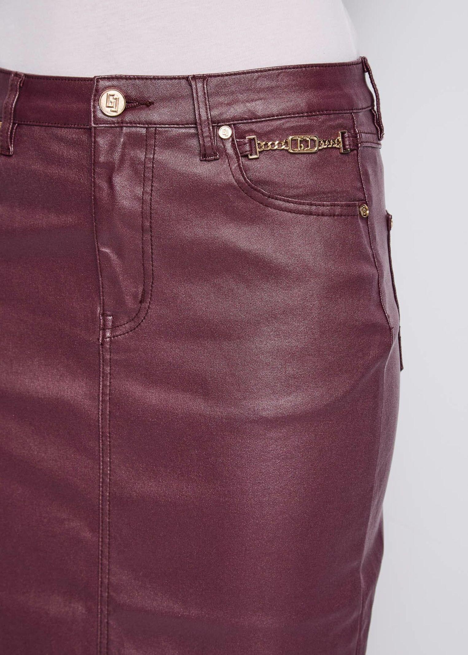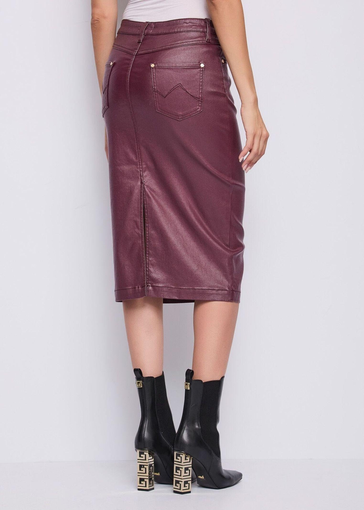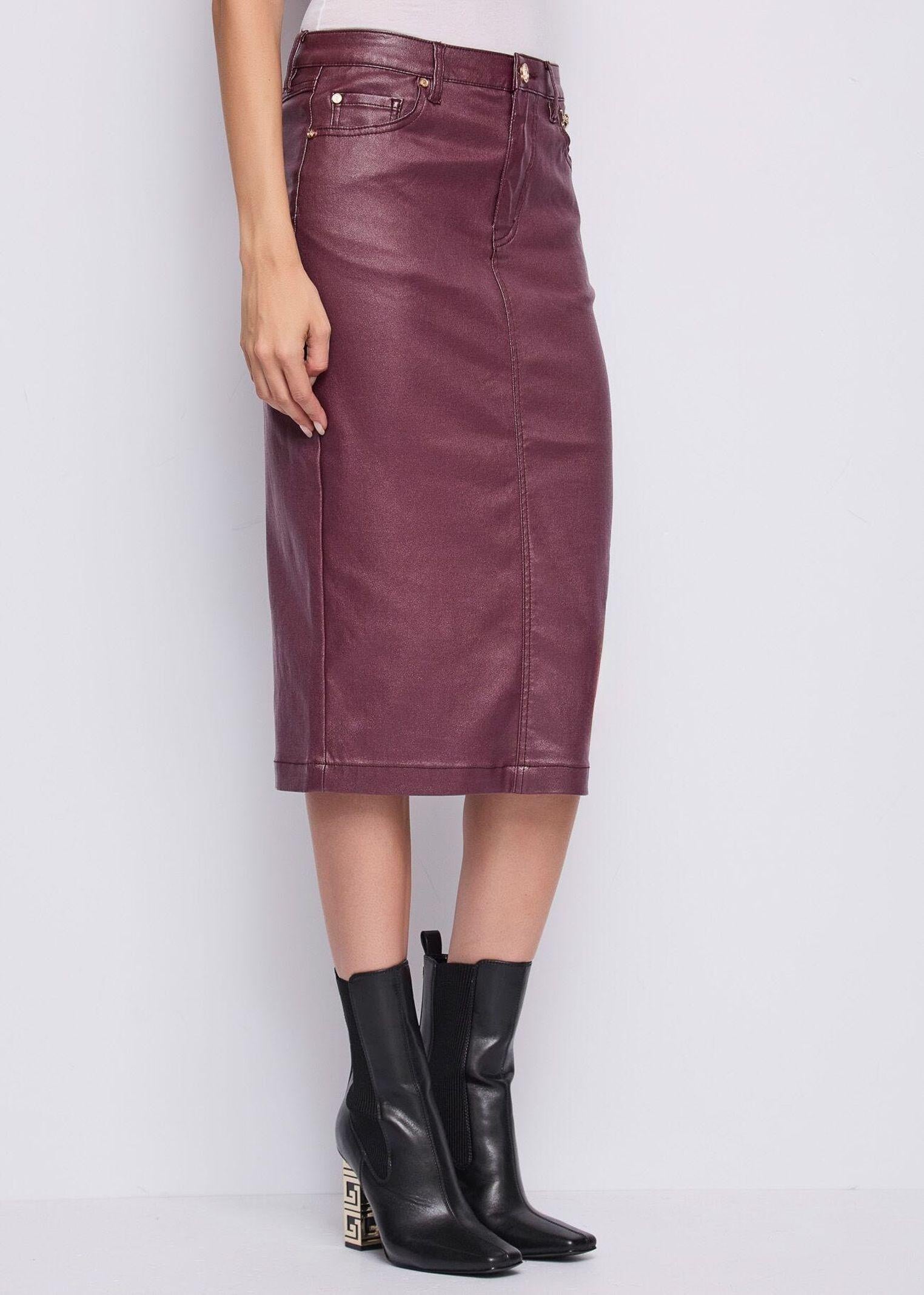 Aggiungi carattere al tuo look con questa gonna longuette in denim effetto similpelle, pensata per chi ama uno stile deciso e contemporaneo. Il dettaglio gioiello in metallo dorato illumina la silhouette, mentre il classico modello a cinque tasche dona un tocco autentico e versatile. La vestibilità aderente valorizza le forme senza rinunciare al comfort, per un capo che si distingue in ogni occasione.