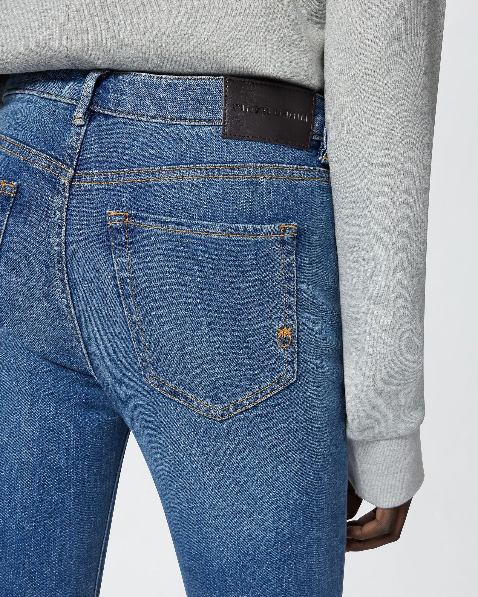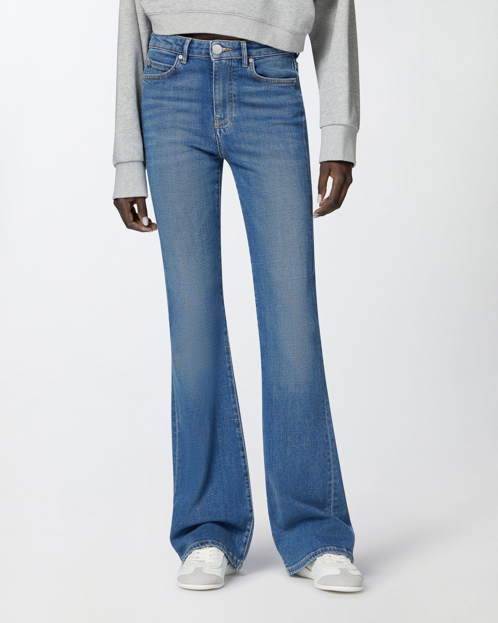 Jeans cinque tasche realizzato in denim comfort di cotone lavaggio vintage dal colore medio scuro. Caratterizzato da gamba dalla linea aderente fino al ginocchio e svasata verso il fondo, che costruisce la classica e iconica silhouette a zampa d'elefante, di ispirazione anni 70. Il design di questo modello e la vita alta valorizzano la tua figura, perfetto da indossare nei tuoi outfit quotidiani con un tocco contemporaneo. Chiusura con bottone a chiodo in metallo e zip coperta.