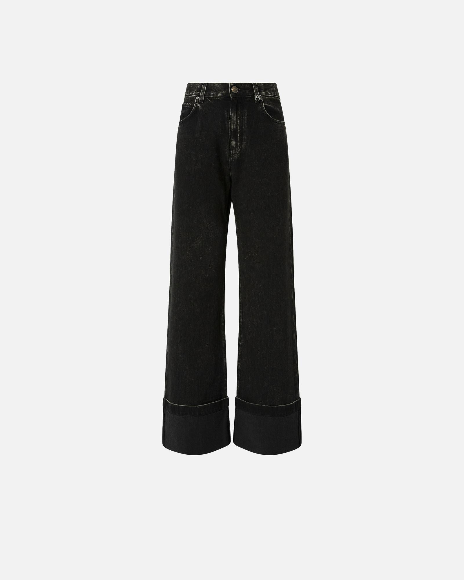 Jeans cinque tasche wide leg, caratterizzato da gamba dritta e ampia con fondo risvoltato fisso. Realizzato in denim black di cotone e lyocell per una mano più fluida ed è trattato con diverse tecniche di lavaggio per raggiungere la tonalità finale. A personalizzare il design in puro stile Pinko troviamo il passante rimovibile con logo Love Birds. Gioca con gli abbinamenti e indossa questi jeans con la vita scesa e il cavallo basso per un look più maschile, oppure combinali con capi più femminili per uno stile che punta sui contrasti. Passanti per cintura e chiusura frontale con bottone e zip nascosta. Il modello veste in modo un po' più ampio rispetto alla taglia abituale.