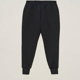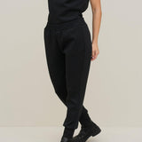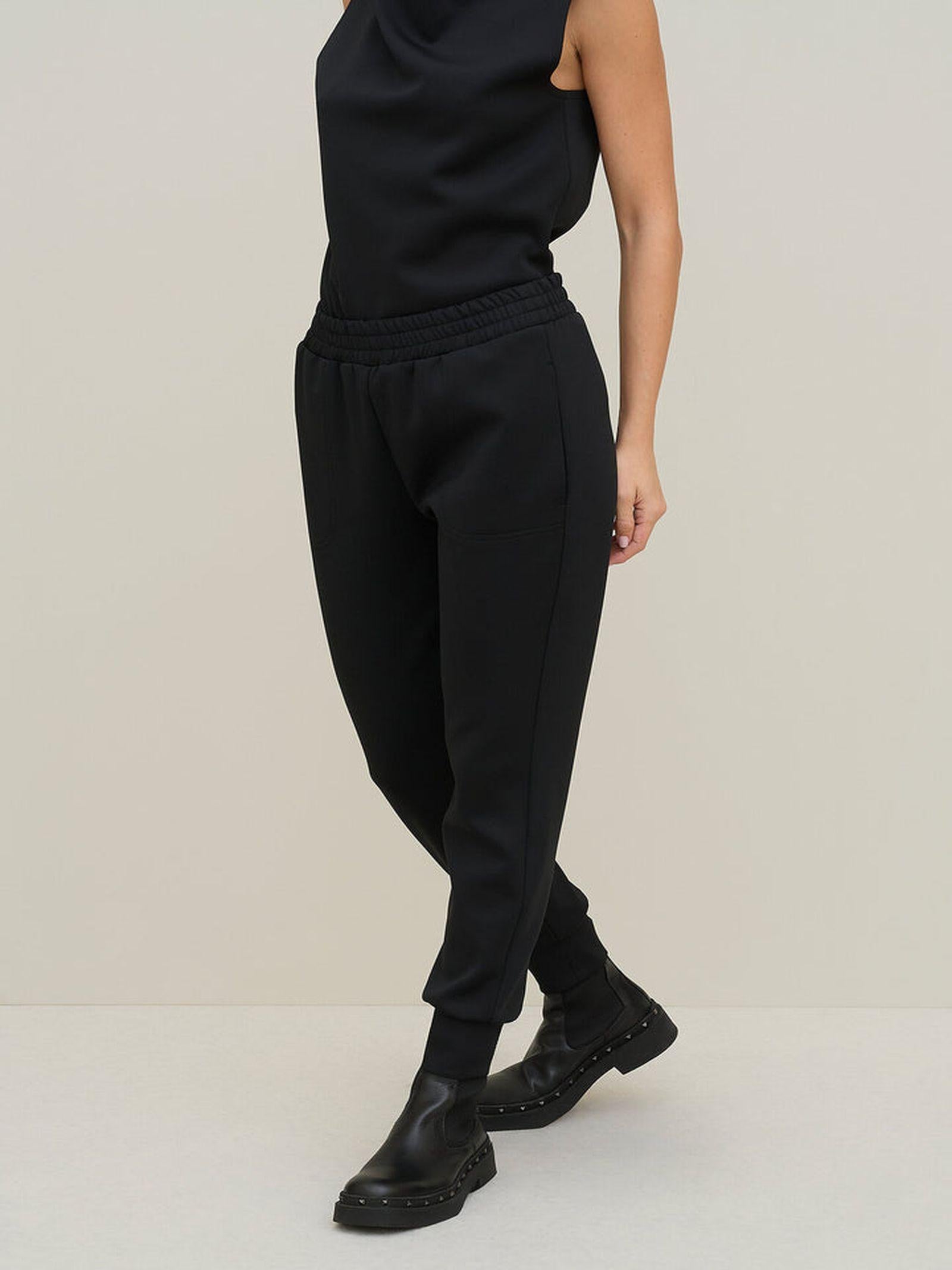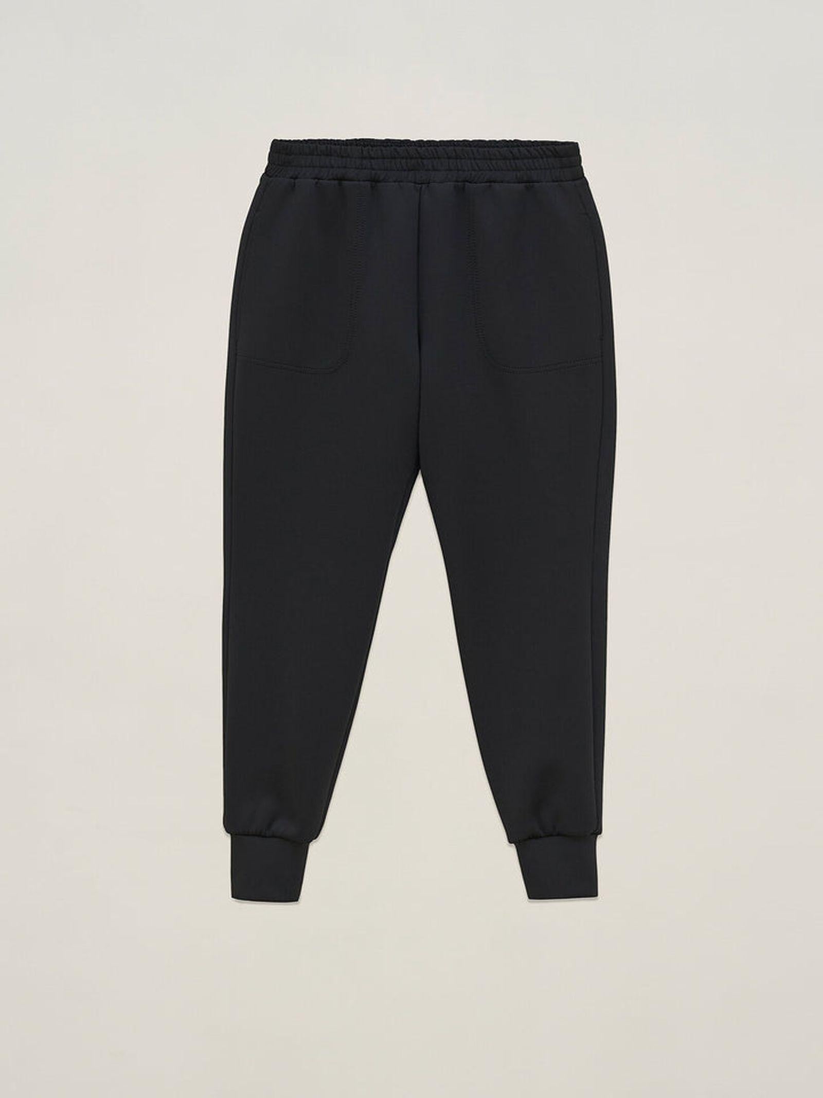 Pantalone jogger con elastico in vita, realizzato in tessuto jersey elasticizzato, due tasche laterali, gamba dritta e con polsino al fondo.