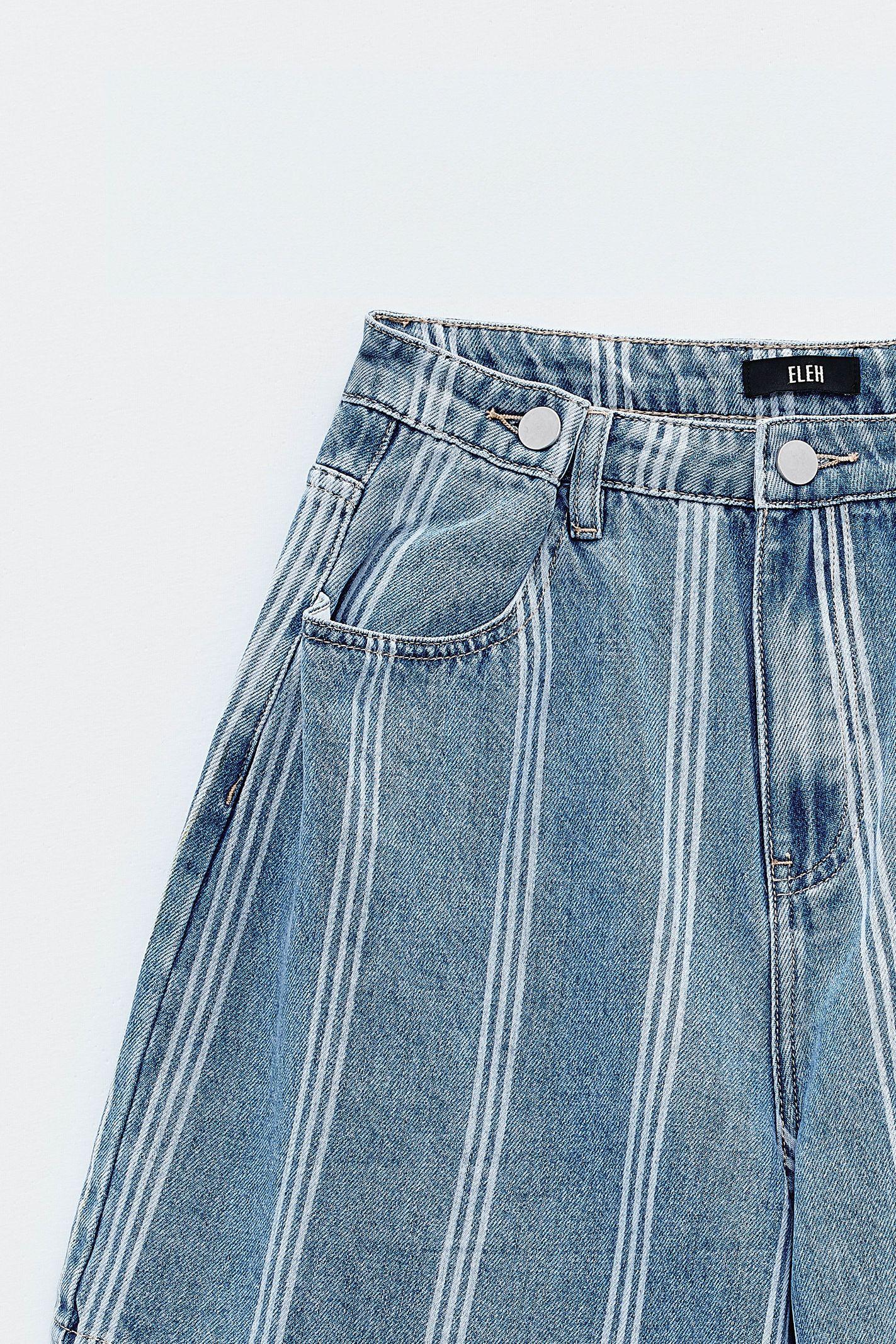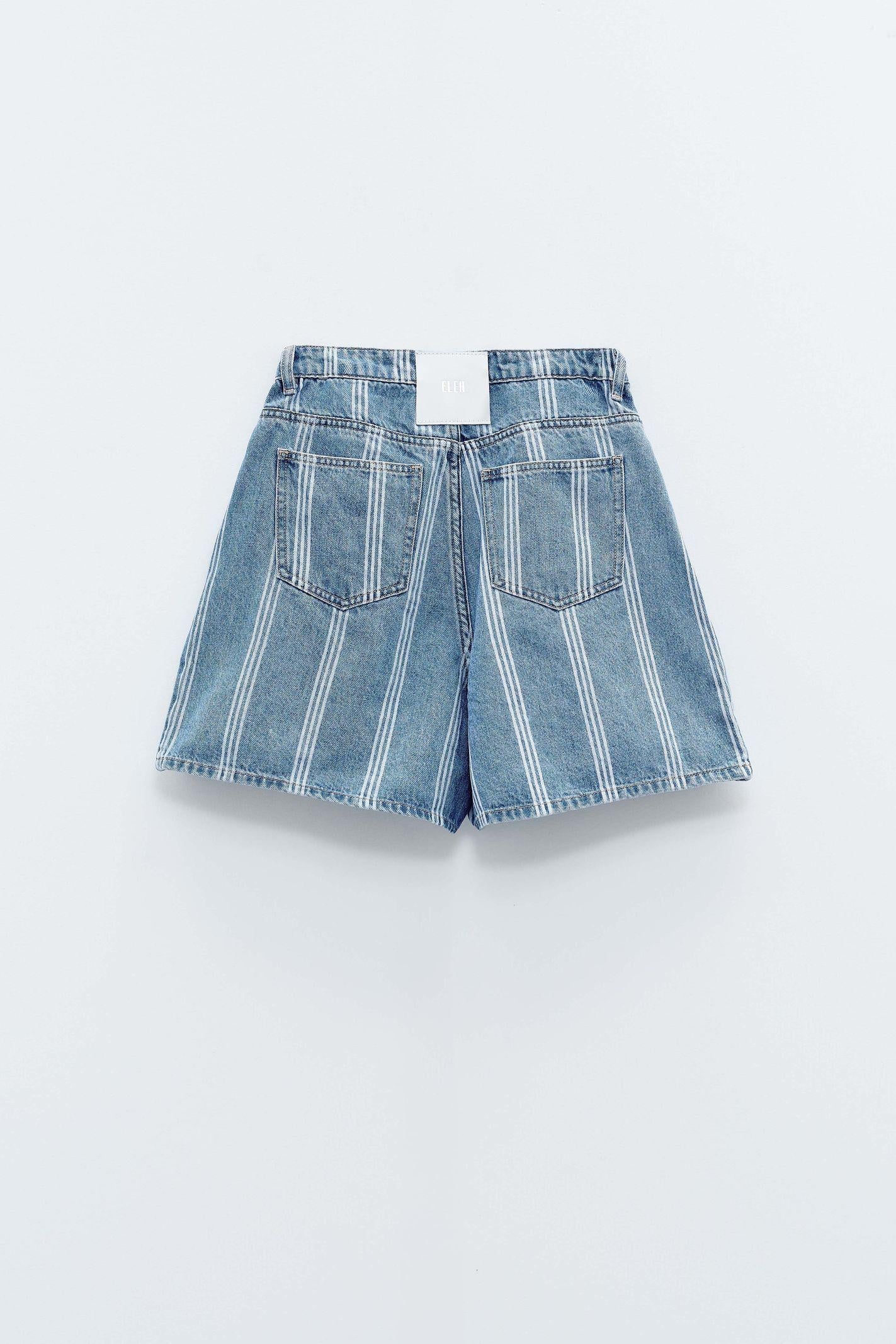 Short realizzato in denim con lavaggio chiaro a righe, caratterizzato da gamba leggermente svasata al fondo, chiusura con zip coperta, bottone metallico e cintura tono su tono, passanti in vita, salpa logata dietro.
