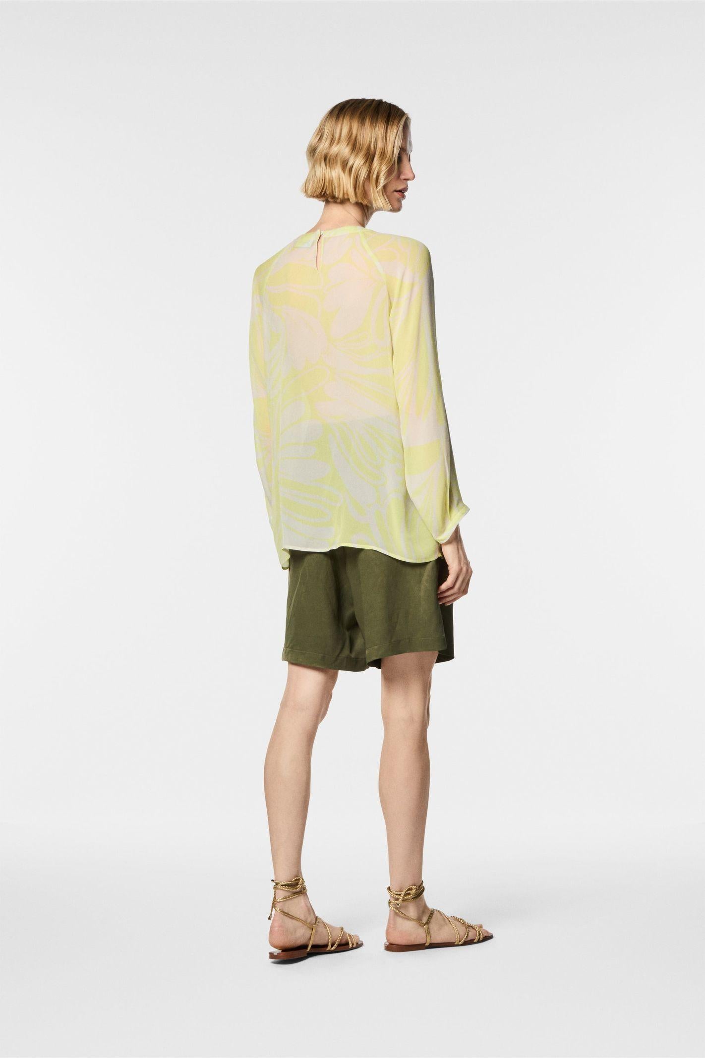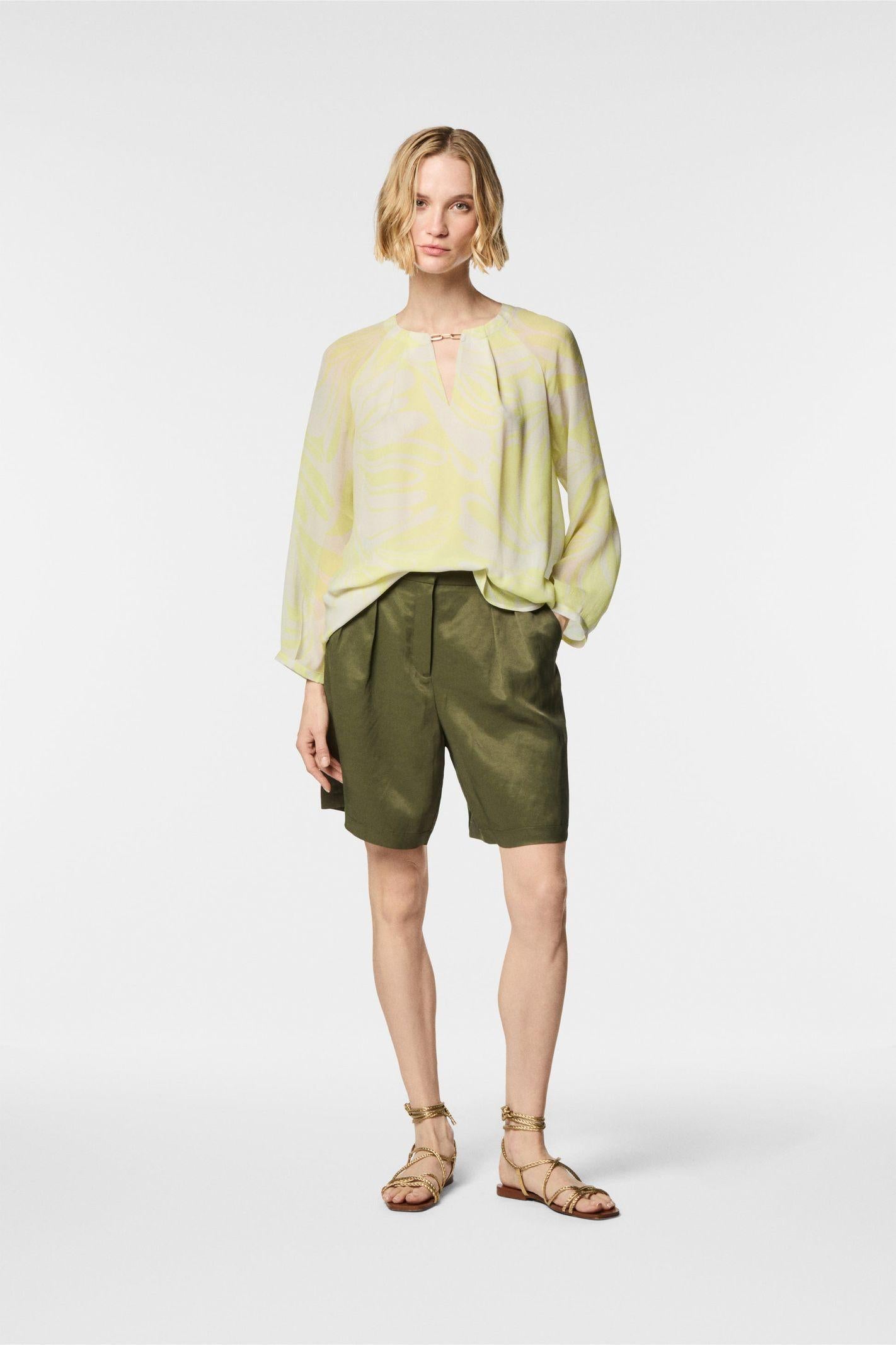 Shorts in lino di viscosa dall'effetto fiammato che offrono una combinazione di freschezza e stile. Il tessuto leggero e traspirante garantisce comfort, mentre l'effetto fiammato aggiunge un tocco di originalità. Ha pence davanti e chiusura con ceniera e bottone in vita, tasche laterali.