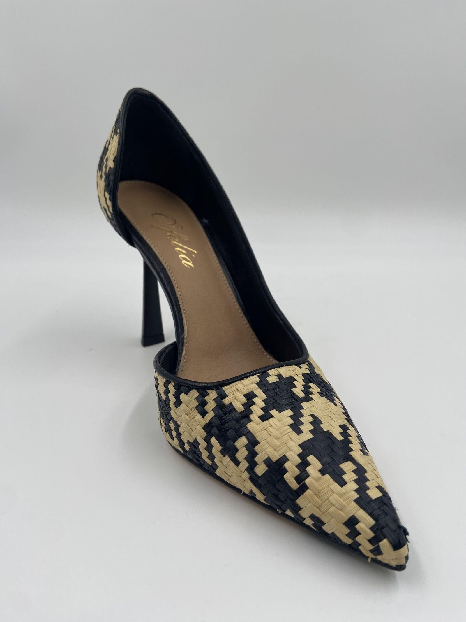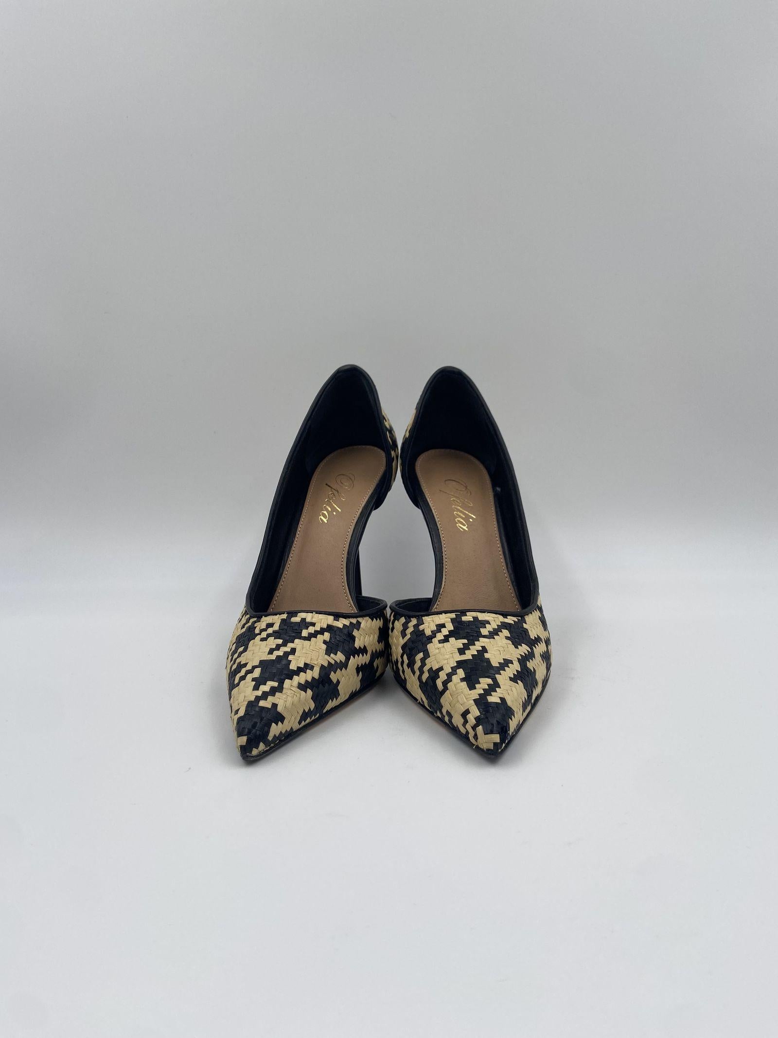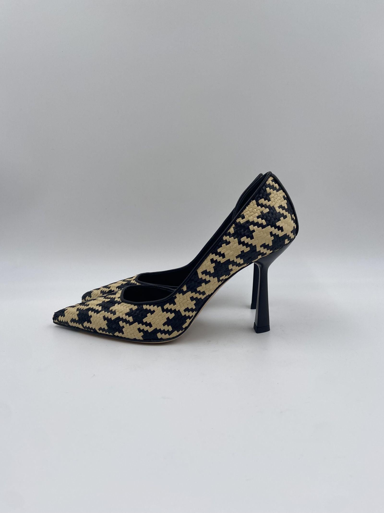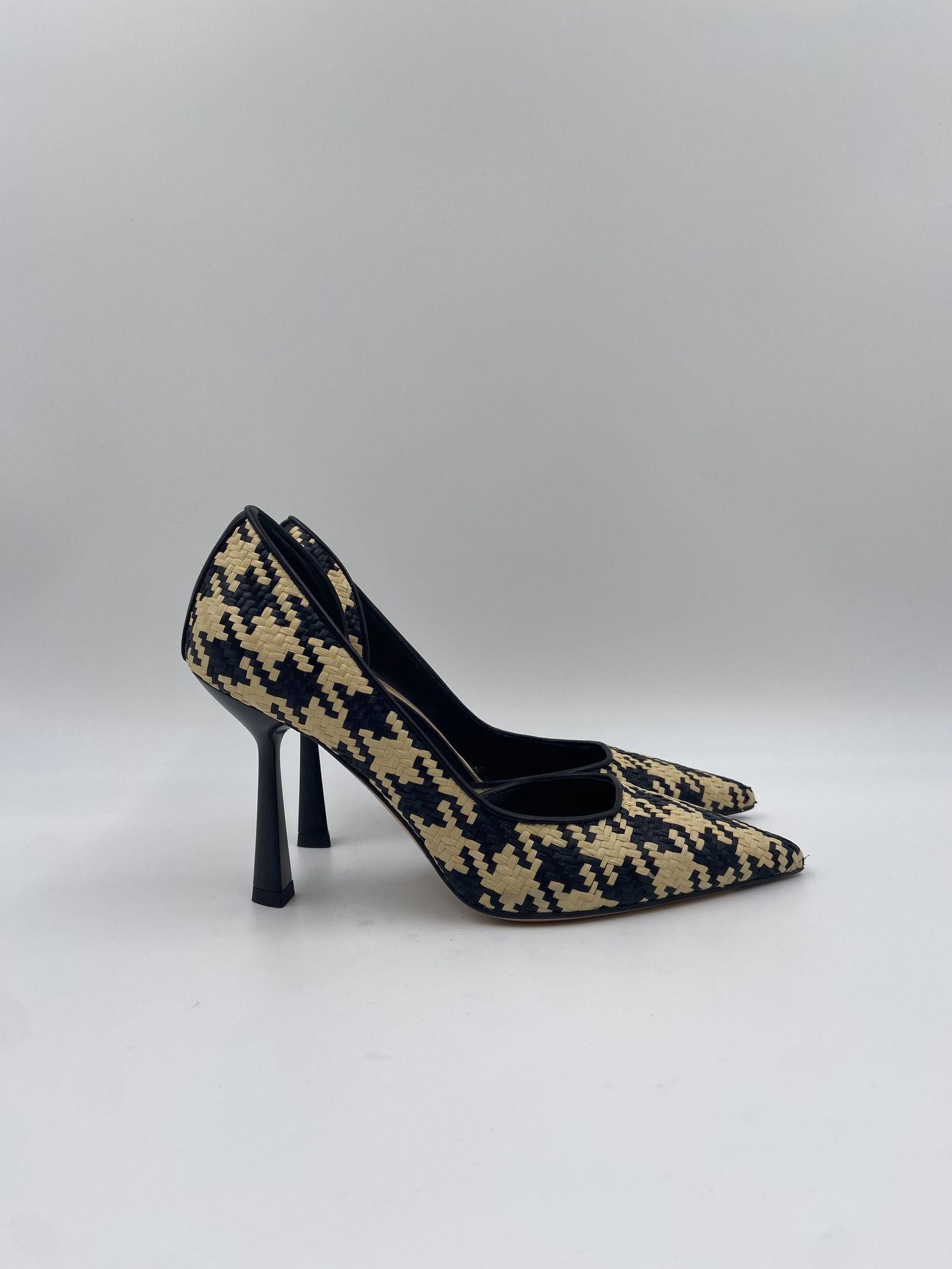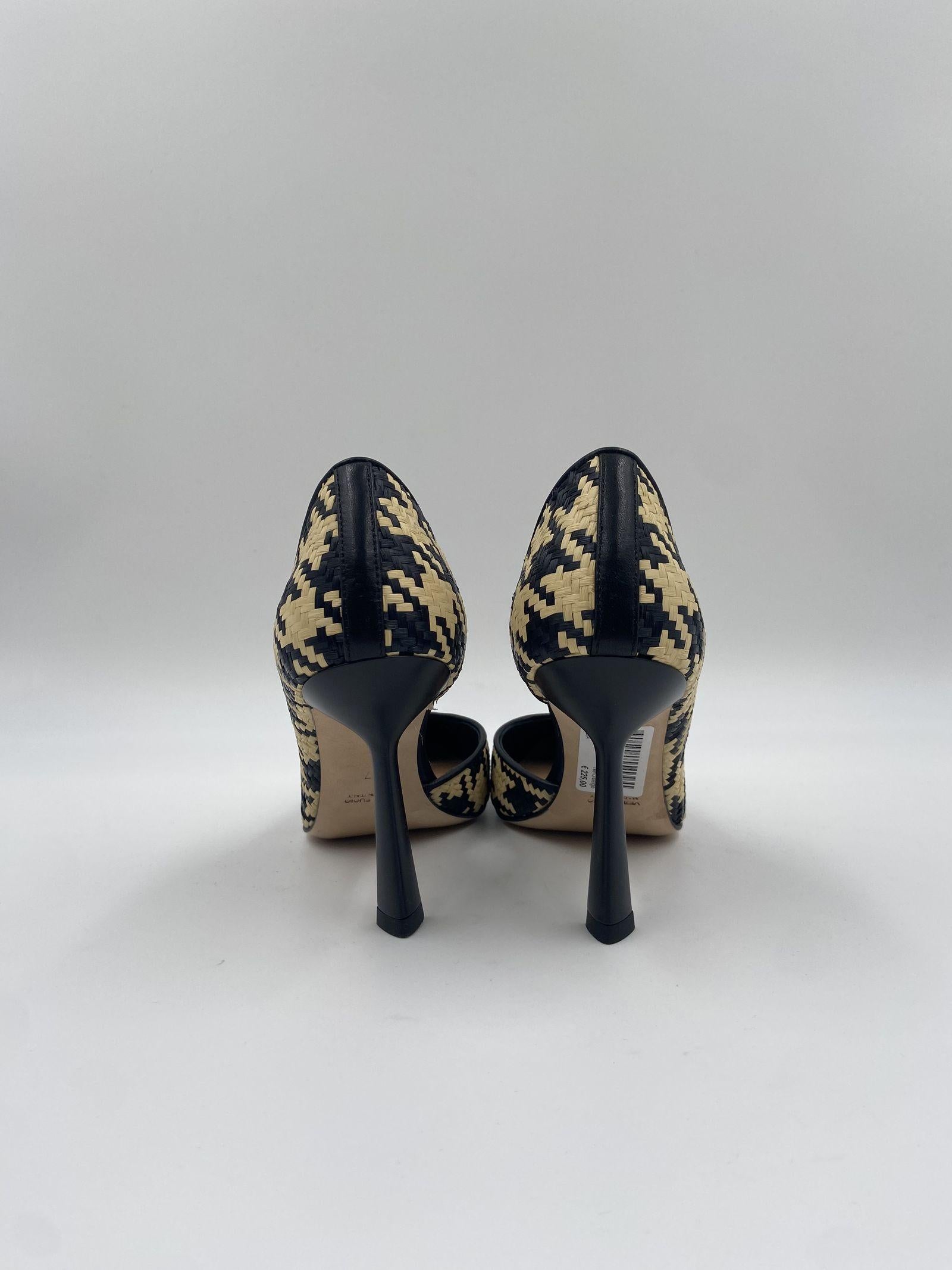 Dècolleté realizzato in morbida rafia intrecciata colore nero e beige dalla punta affusolata e apertura laterale interna, tacco a stiletto alto 8 cm, suola in cuoio. Questa dècolletè dalla silhouette elegante e sinuosa diventa un must-have del guardaroba femminile.