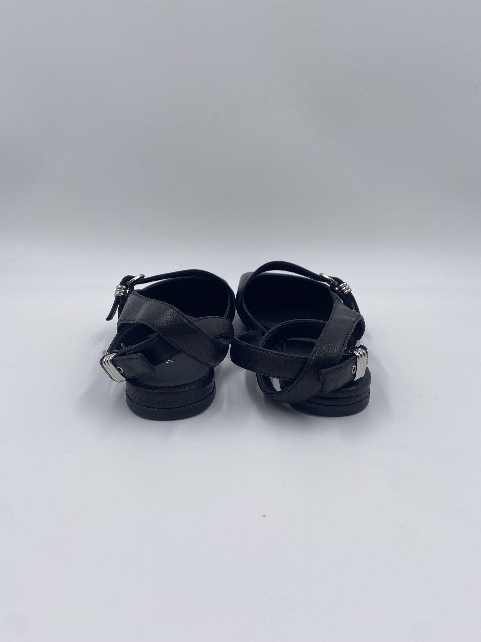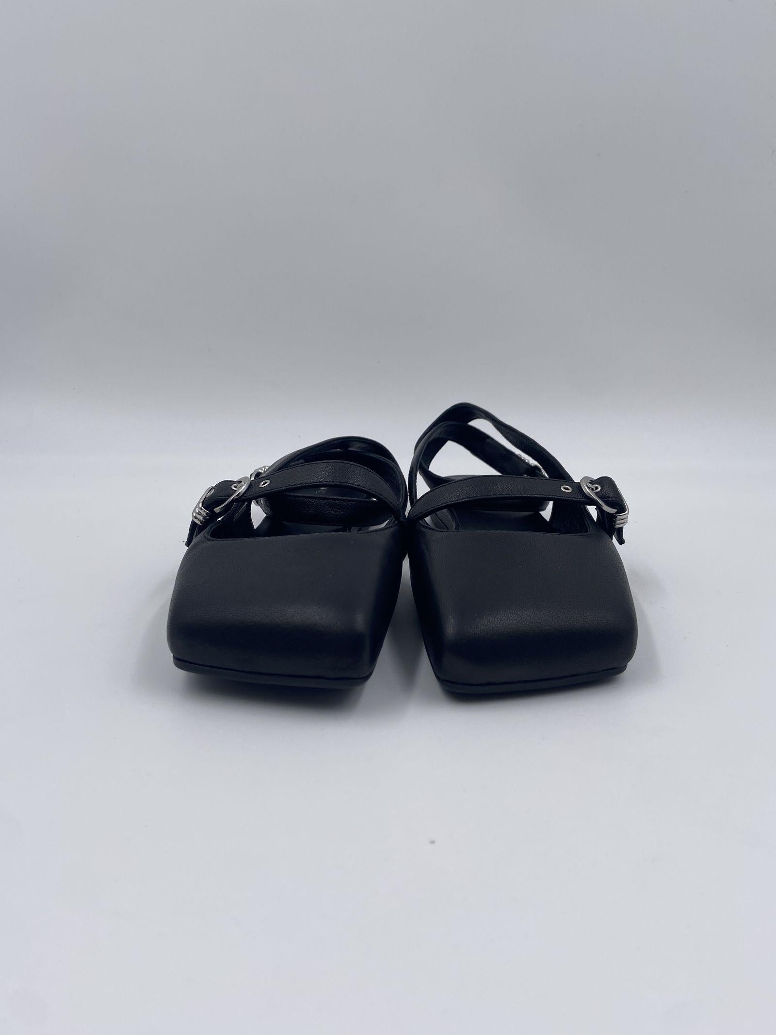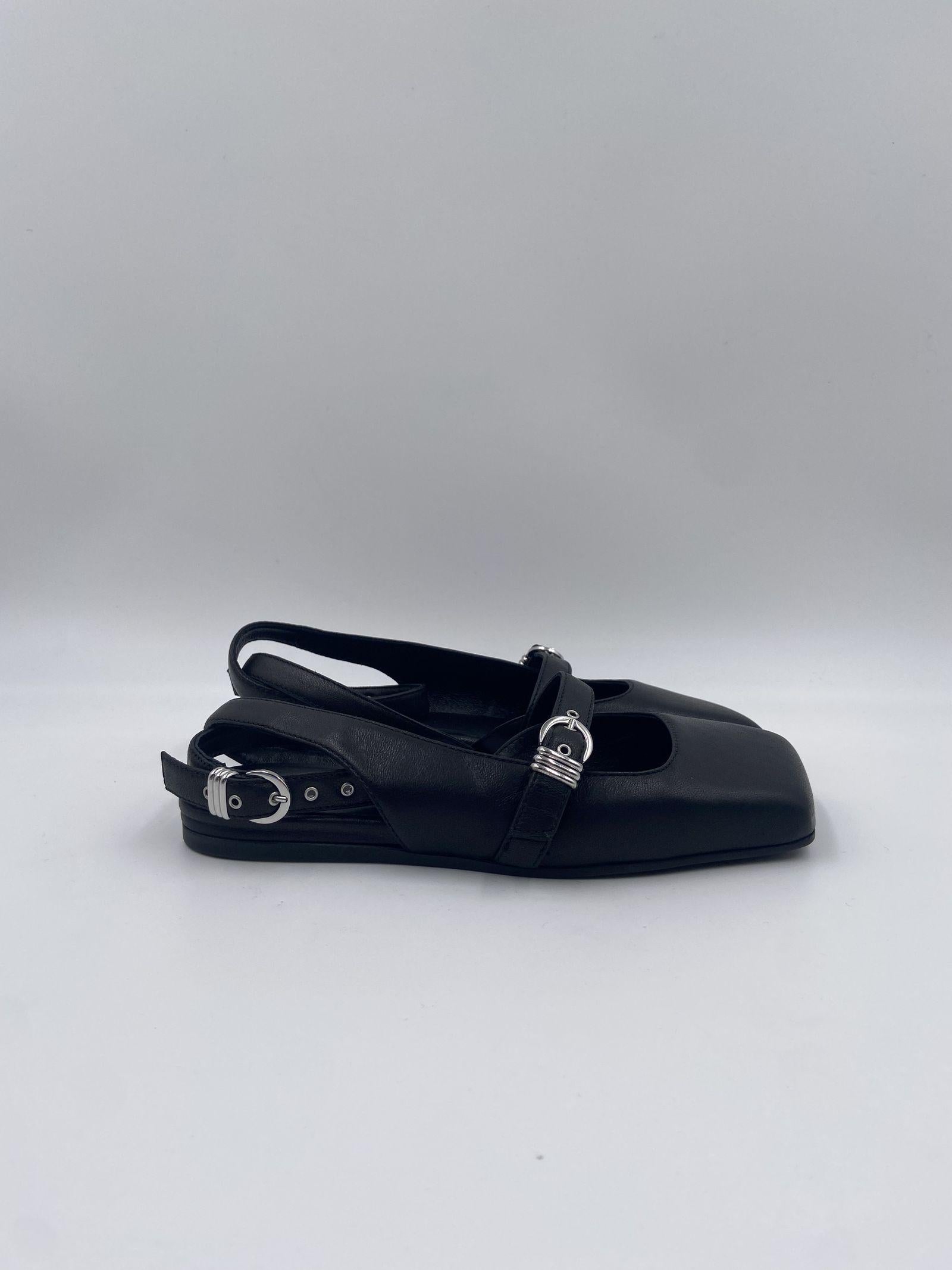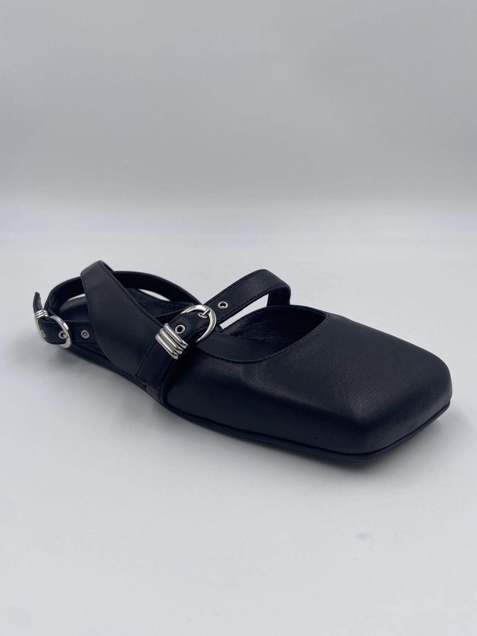 Decolletè nera con tomaia morbida in nappa di vitello, con tre cinturini sul davanti regolabili con fibbie e passantine metalliche. Ha un cinturino alla caviglia estraibile e una suola in gomma antiscivolo con maxi logo dalla punta squadrata obliqua e un sottopiede in pelle confort.