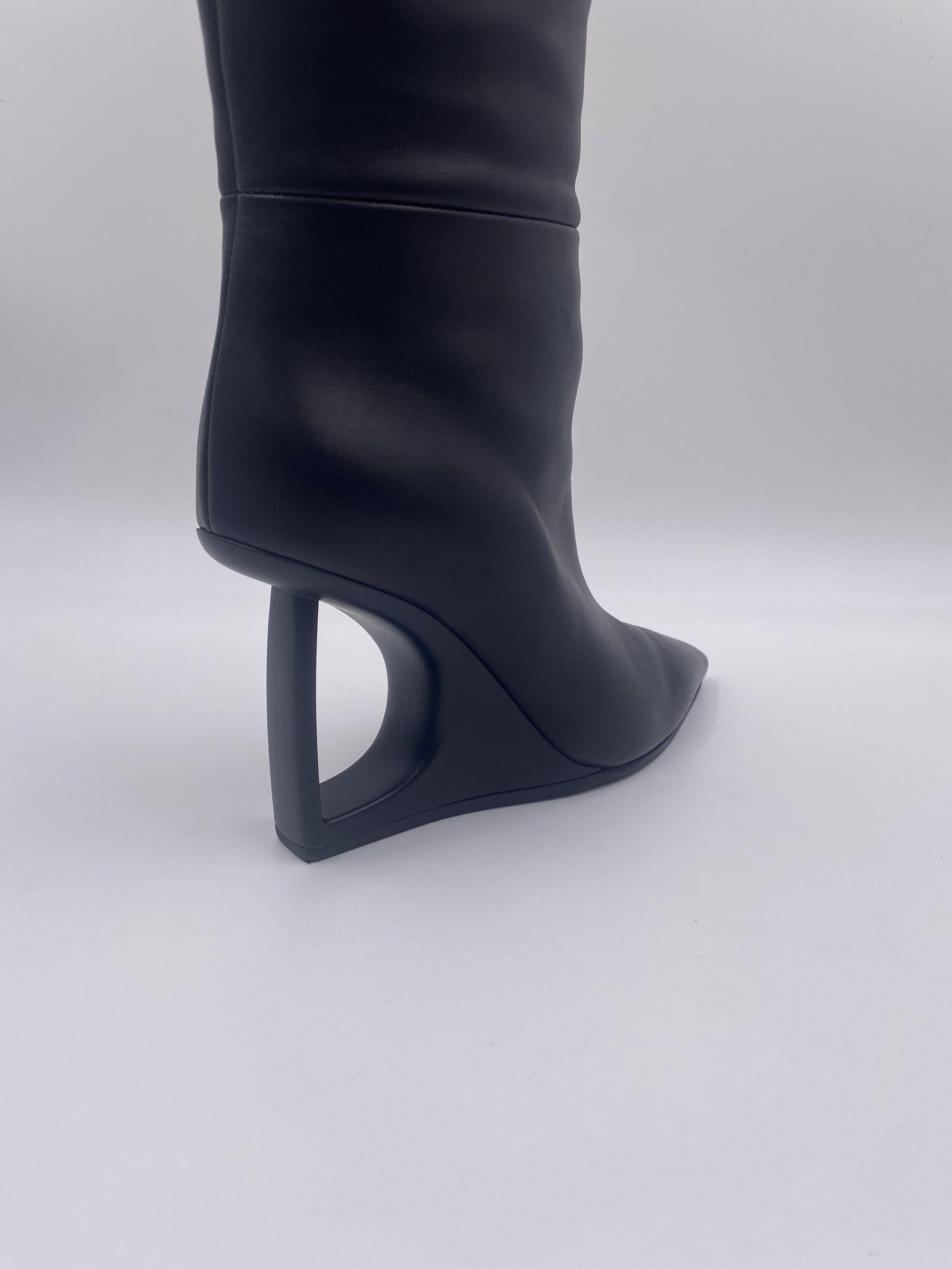 Stivale realizzato in morbida nappa nera stretch, slanciato e aderente, con un tacco zeppa in ABS verniciato dal design che interpreta la lettera "D" di donna. Ha una suola in gomma antiscivolo e altezza tacco di 100 mm.