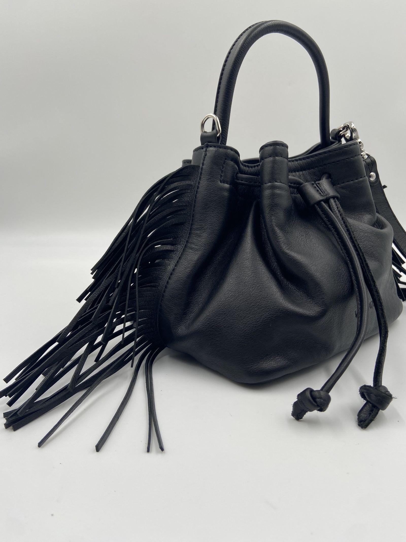 Borsa Vic Matie a secchiello dal design morbido e raffinato, realizzata in pelle liscia nera che dona un aspetto elegante e senza tempo. La struttura è valorizzata dalla chiusura con coulisse in pelle, che permette di regolare lapertura mantenendo praticità e sicurezza, mentre il manico superiore consente di portarla comodamente a mano. I dettagli con frange laterali aggiungono movimento e un tocco contemporaneo al modello, bilanciando perfettamente stile e carattere. Completa il design il logo impresso sul fronte e la finitura curata in ogni dettaglio, rendendo questa borsa ideale per accompagnare sia look quotidiani che outfit più ricercati.