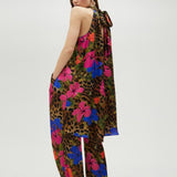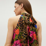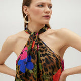 Abito top fresco e morbido, smanicato, con spacco centrale e un elegante collo allacciato. Si distingue per la stampa, un mix floreale con animalier, ideale per un look estivo indossandolo come un top.