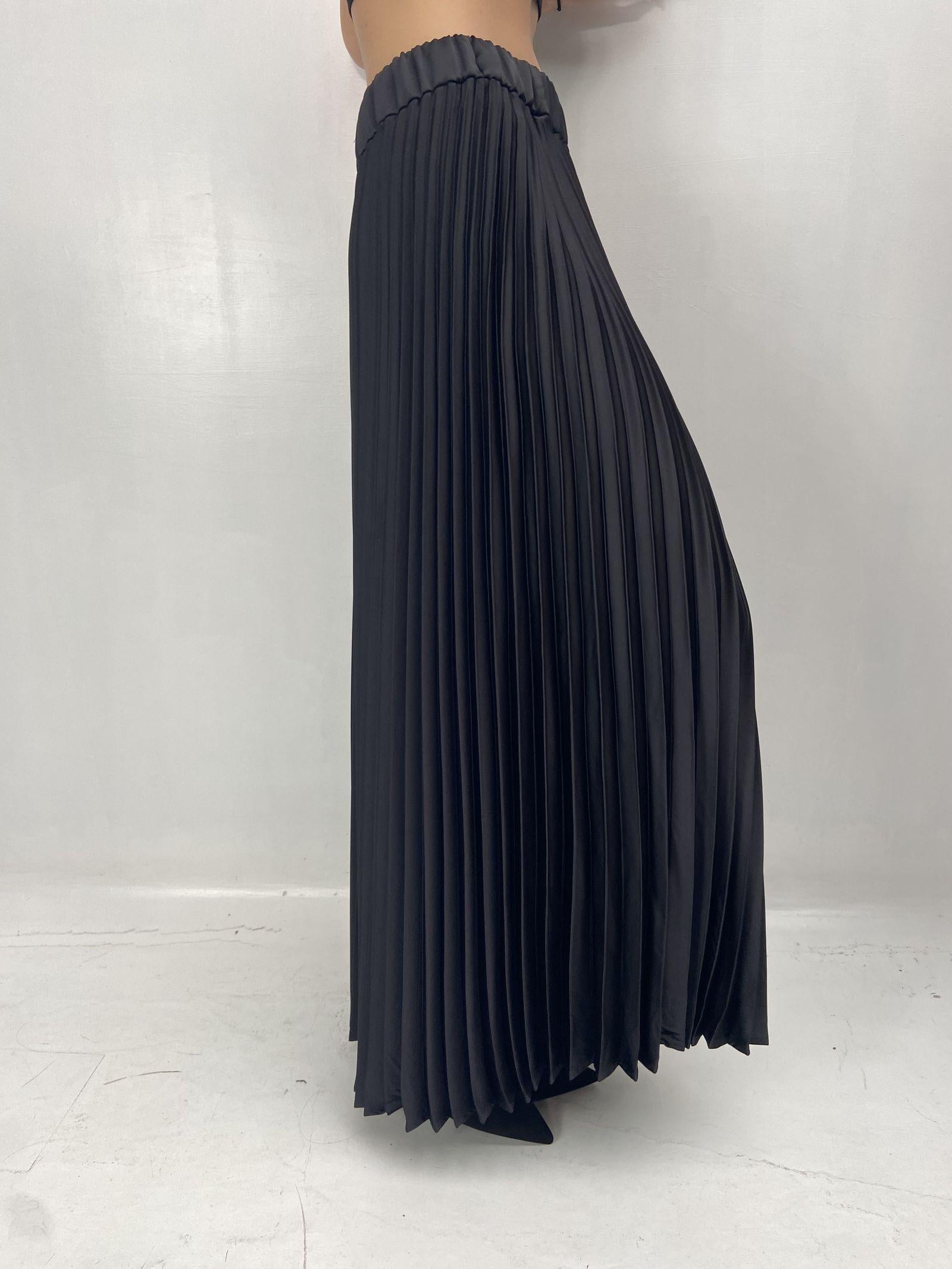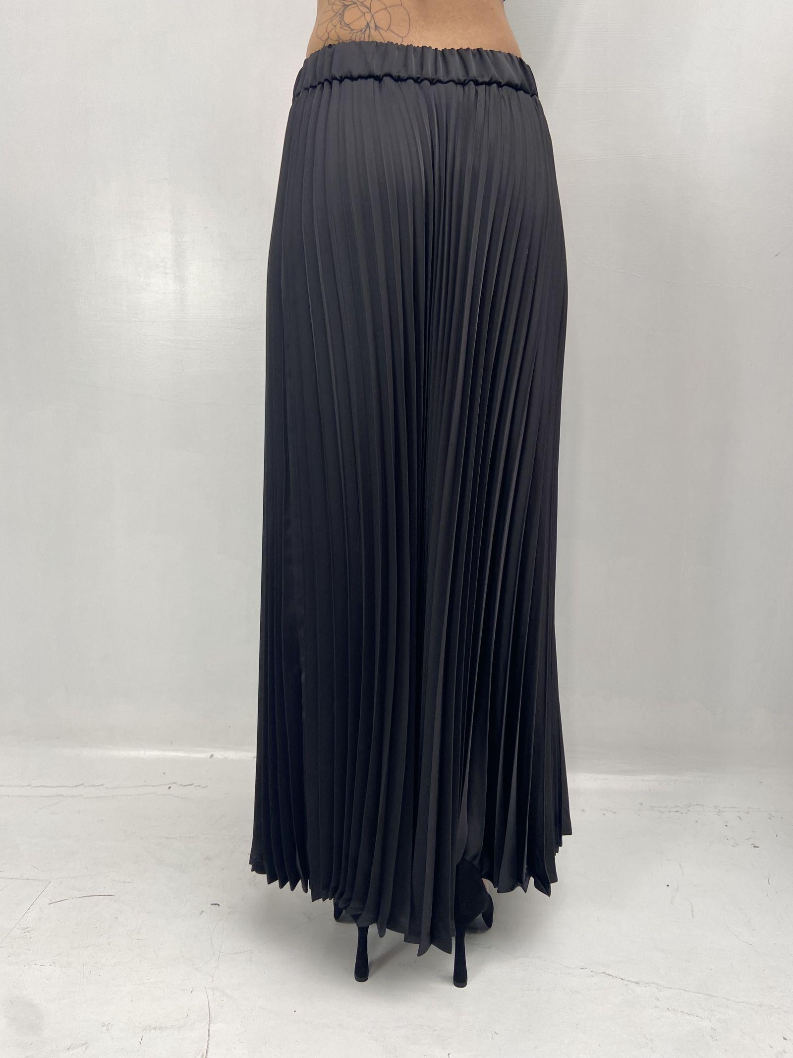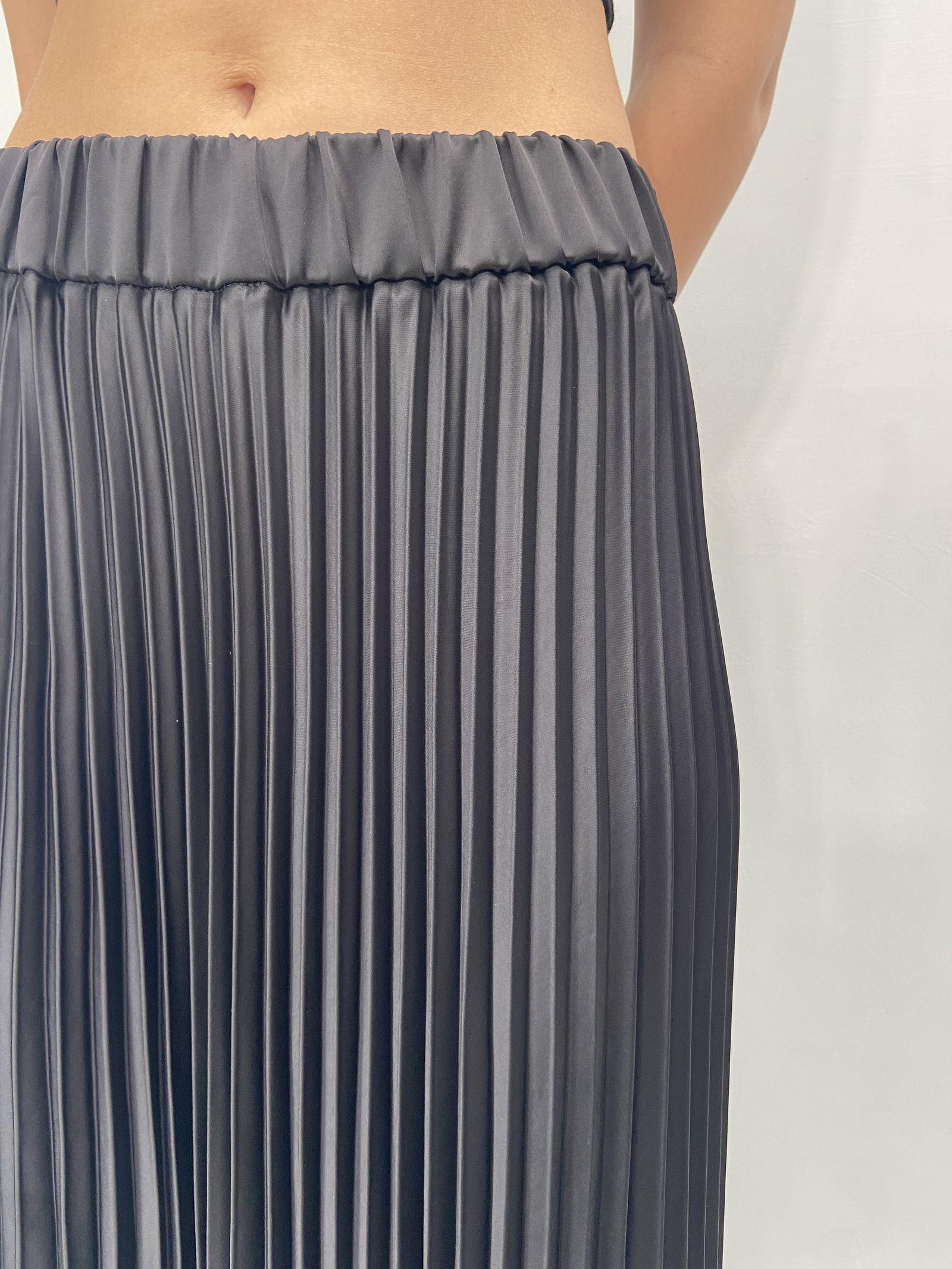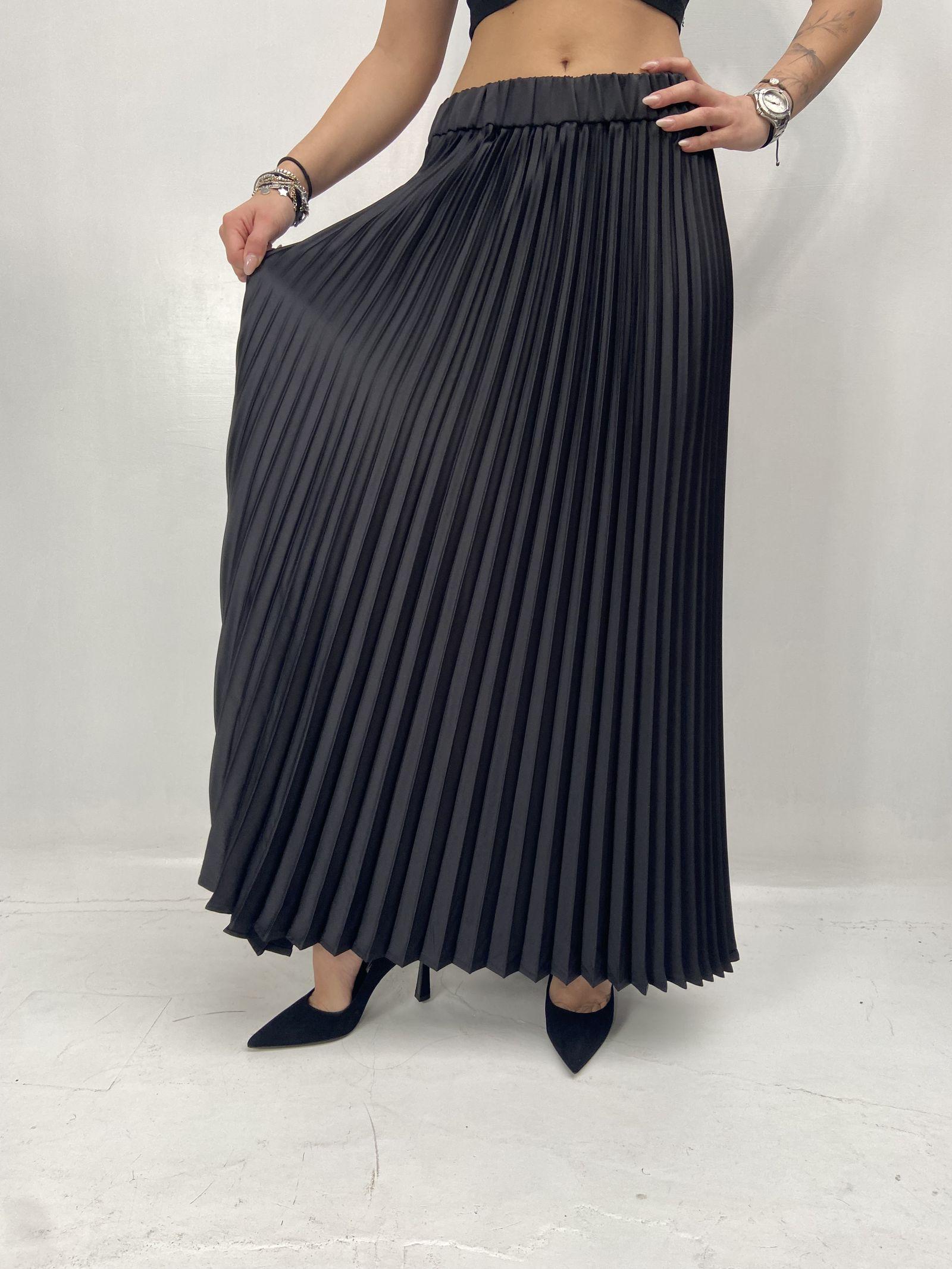 Gonna in raso plissettata dal fascino elegante e senza tempo. Il tessuto fluido e luminoso esalta leffetto dinamico delle pieghe, creando un delicato gioco di movimento e riflessi. La vita con elastico assicura comfort e una vestibilità impeccabile, adattandosi con naturalezza alla silhouette. Leggera e versatile, è il capo ideale per completare look sia casual che più sofisticati, aggiungendo un tocco di femminilità e raffinatezza a ogni occasione.