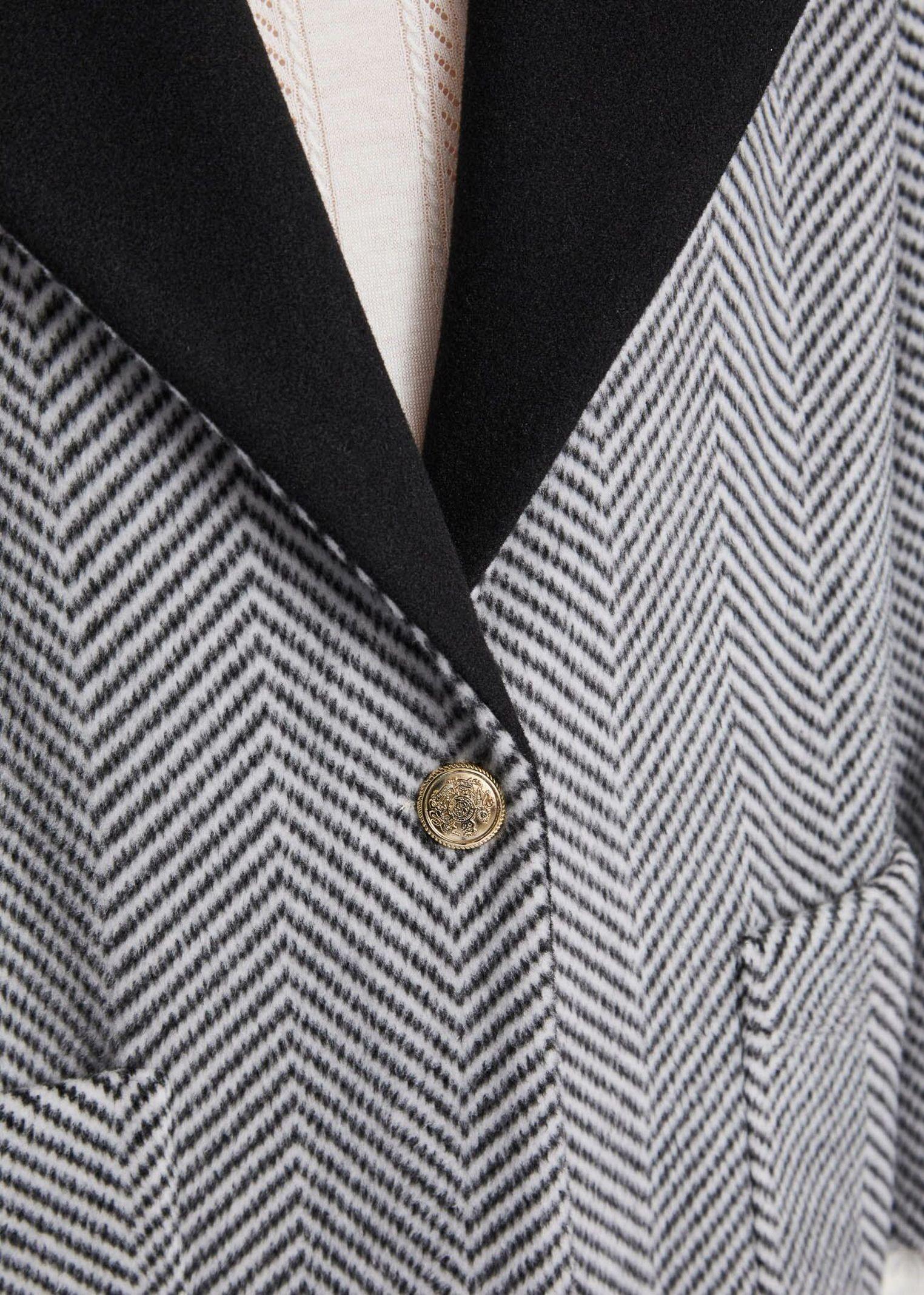 Cappotto di mezza lunghezza in tessuto spigato, dal taglio d’ispirazione sartoriale, foderato. Presenta una chiusura con un unico bottone dorato al centro e ampie tasche applicate sul davanti. Il collo con revers a lancia è impreziosito da un elegante inserto in velluto, che aggiunge un tocco di raffinatezza e carattere. Un capo ideale per affrontare la stagione con stile e personalità.