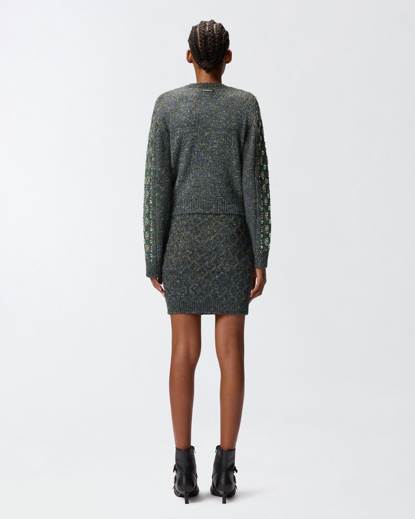 Cardigan girocollo a maniche lunghe realizzato in maglia con filati di colori diversi, caratterizzato da una lavorazione a costine sul retro e dal punto treccia sul davanti e sulle maniche che dona movimento e tridimensionalità al design. Impreziosito dal ricamo di castoni sul davanti, realizzato interamente a mano e capace di creare un contrasto luminoso con il filato, questo modello donerà un tocco di originalità al tuo guardaroba. La parte frontale presenta una classica chiusura con bottoni, mentre l'etichetta con logo lettering Pinko tono su tono sul retro completa l'accessorio con un tocco personalizzato. Il capo è stato sottoposto a prove di finissaggio per ridurre al minimo la possibile formazione di pilling, garantendo una maggiore morbidezza e durabilità del tessuto.