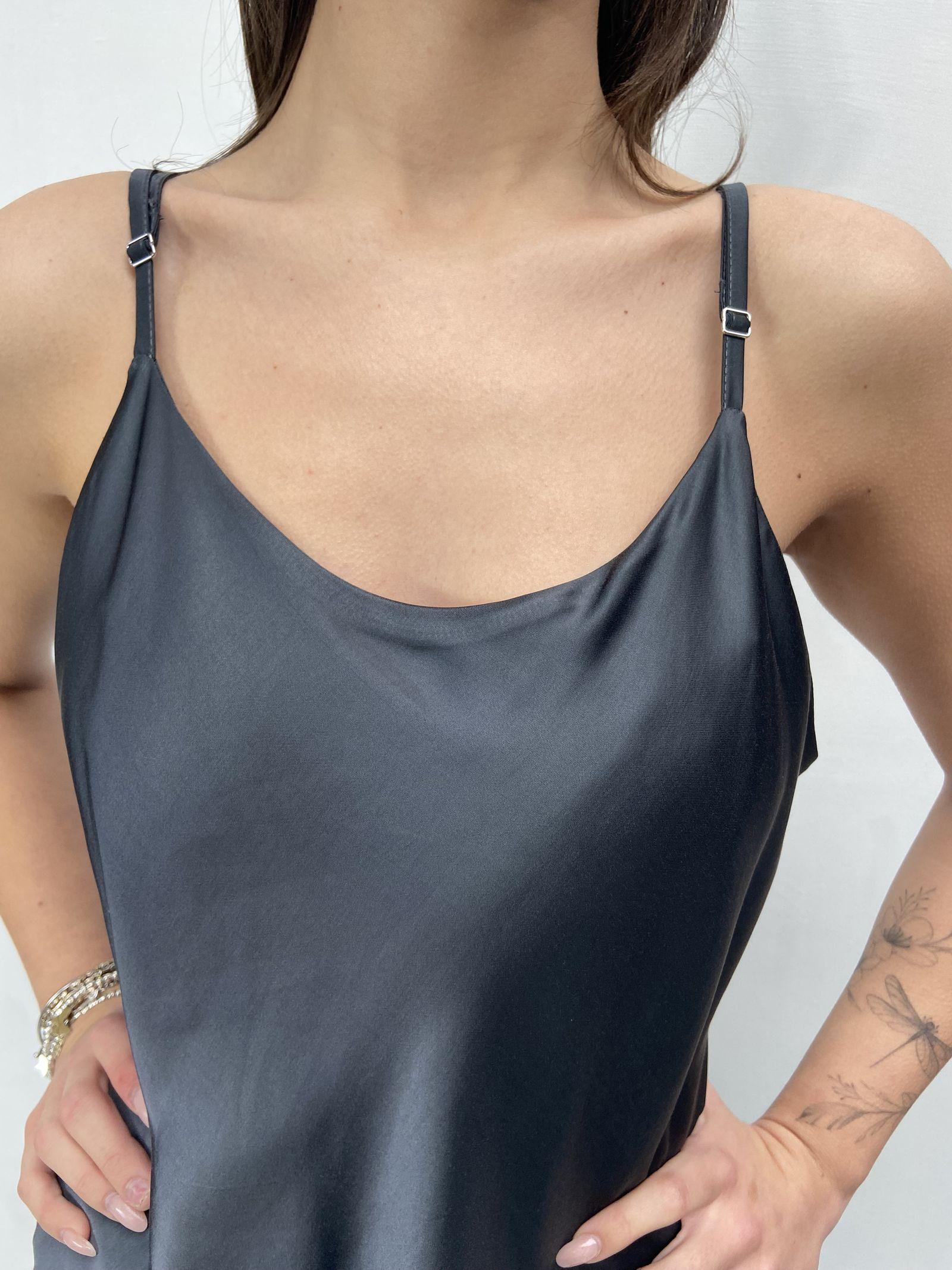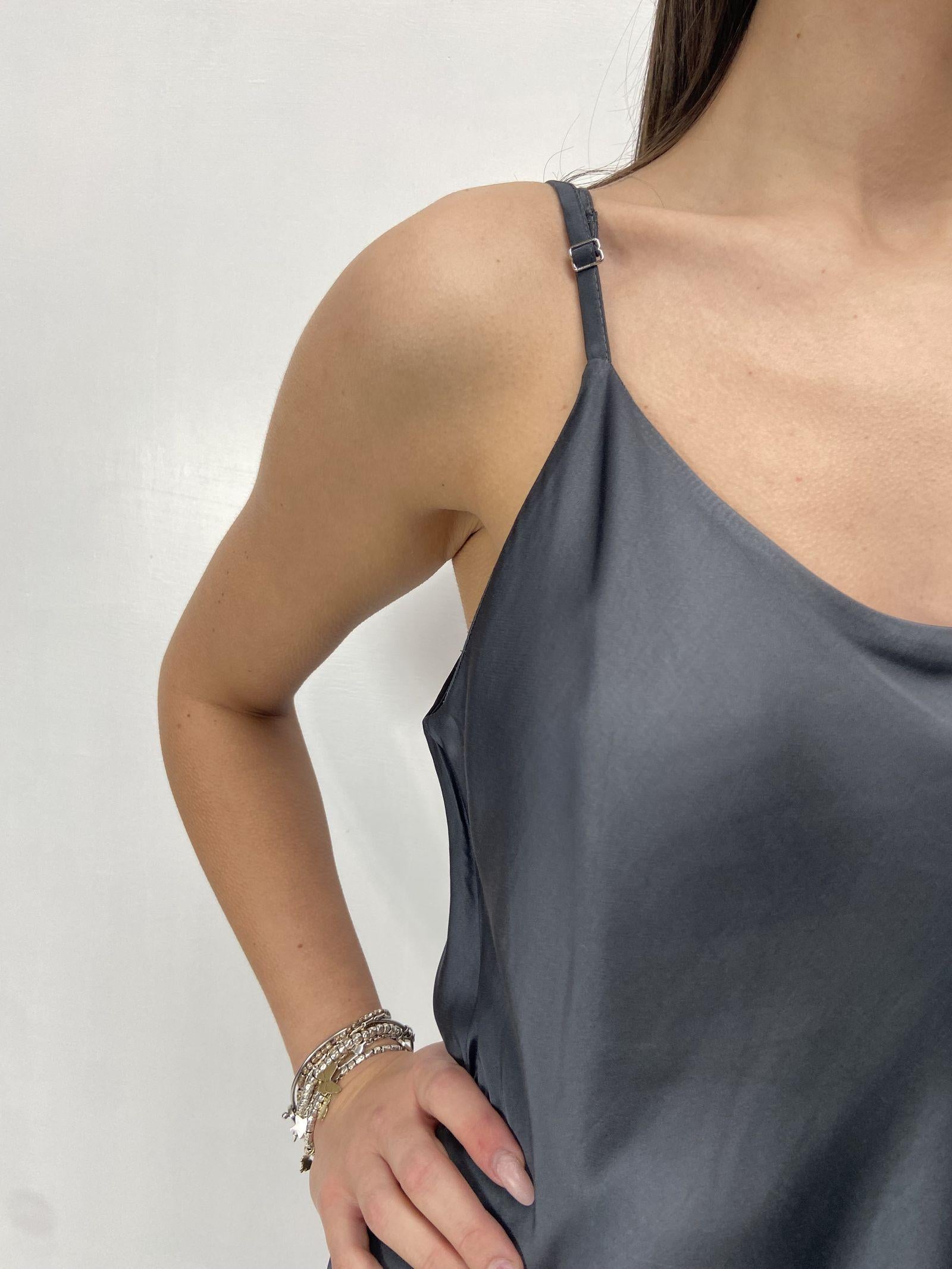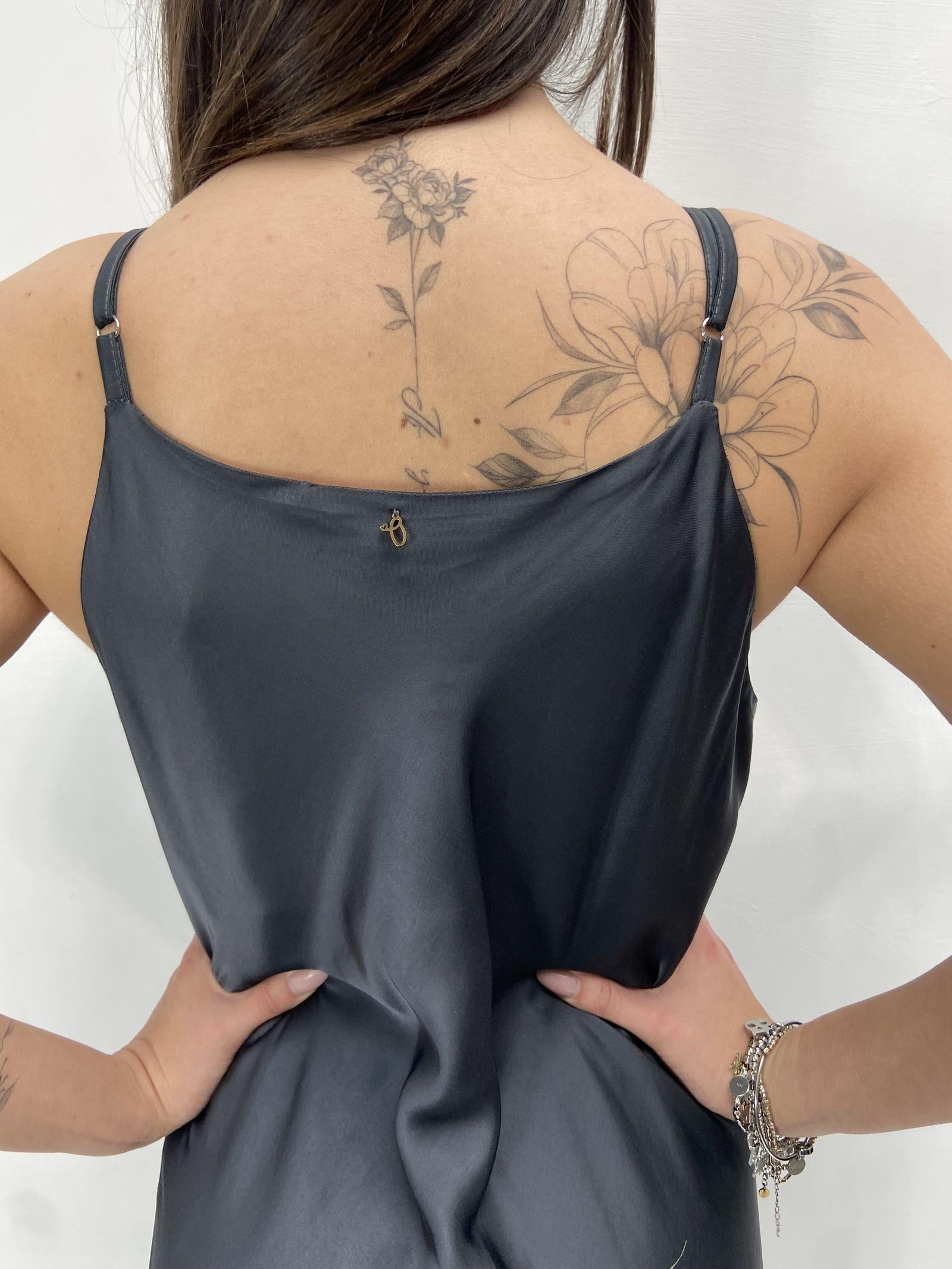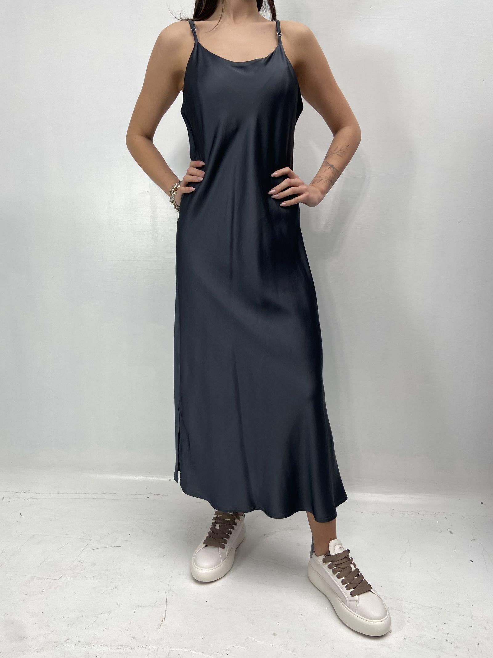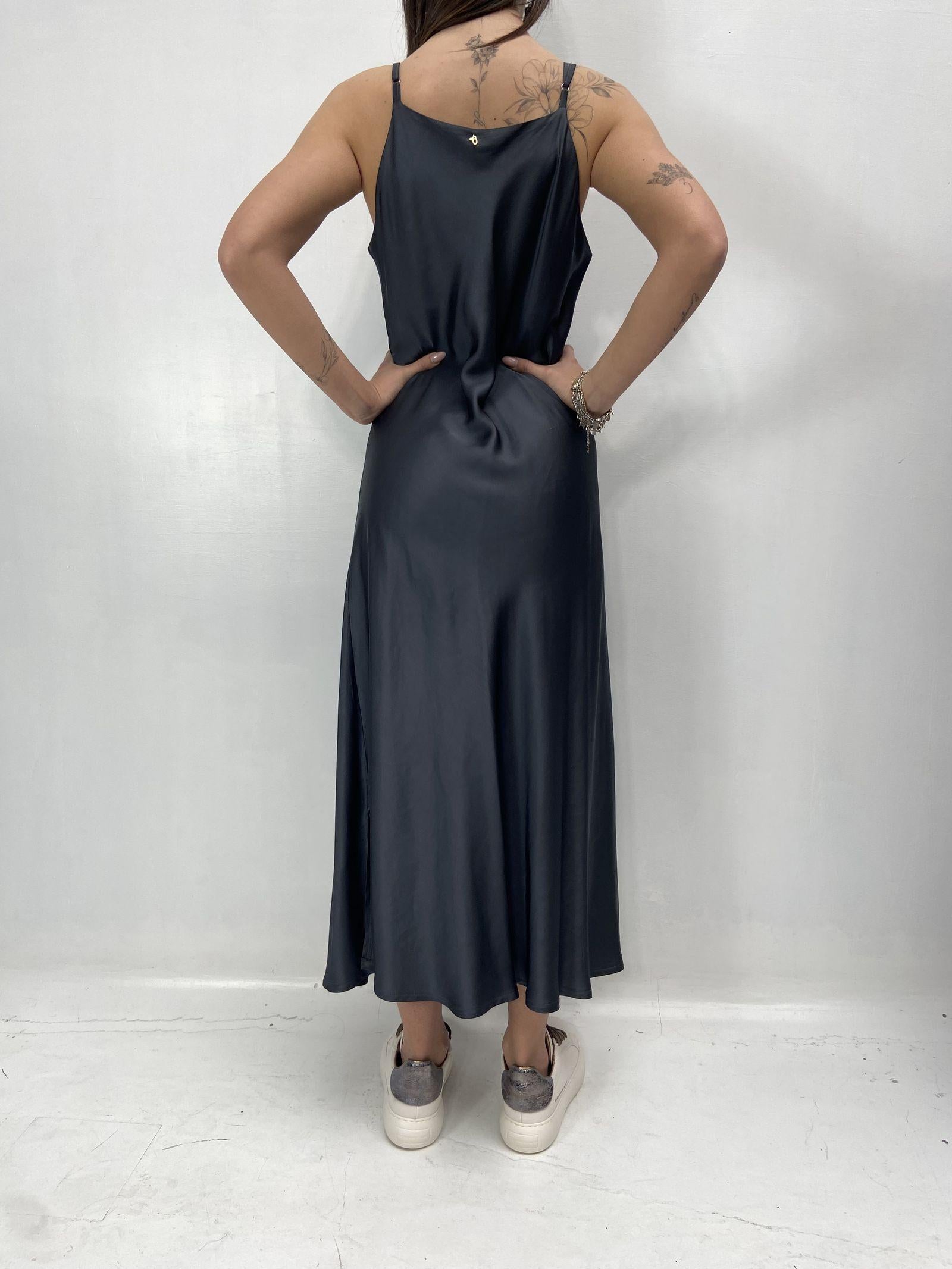 Lasciati avvolgere dalleleganza senza tempo di questo abito lungo in raso, realizzato in morbida viscosa dalla vestibilità aderente che valorizza la silhouette con naturalezza. Le bretelline sottili donano un tocco di femminilità e leggerezza, mentre laccessorio metallico sul retro aggiunge un dettaglio raffinato e moderno. Gli spacchetti laterali sul fondo offrono libertà di movimento e un accenno di sensualità discreta, rendendo questo capo perfetto sia per unoccasione speciale che per una serata elegante. Disponibile in diverse tonalità sofisticate, è labito ideale per chi desidera distinguersi con stile e semplicità.