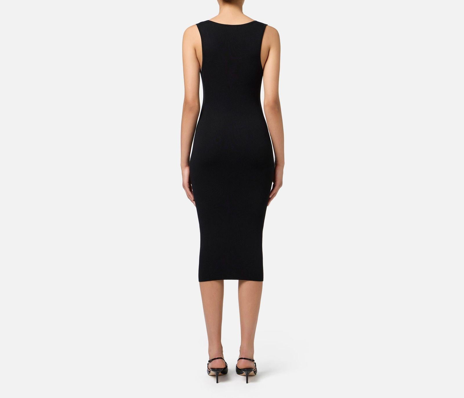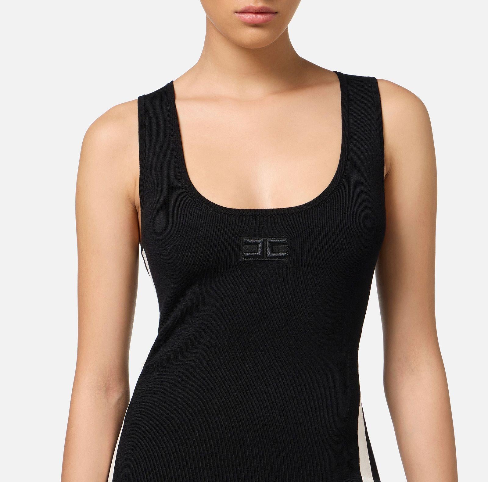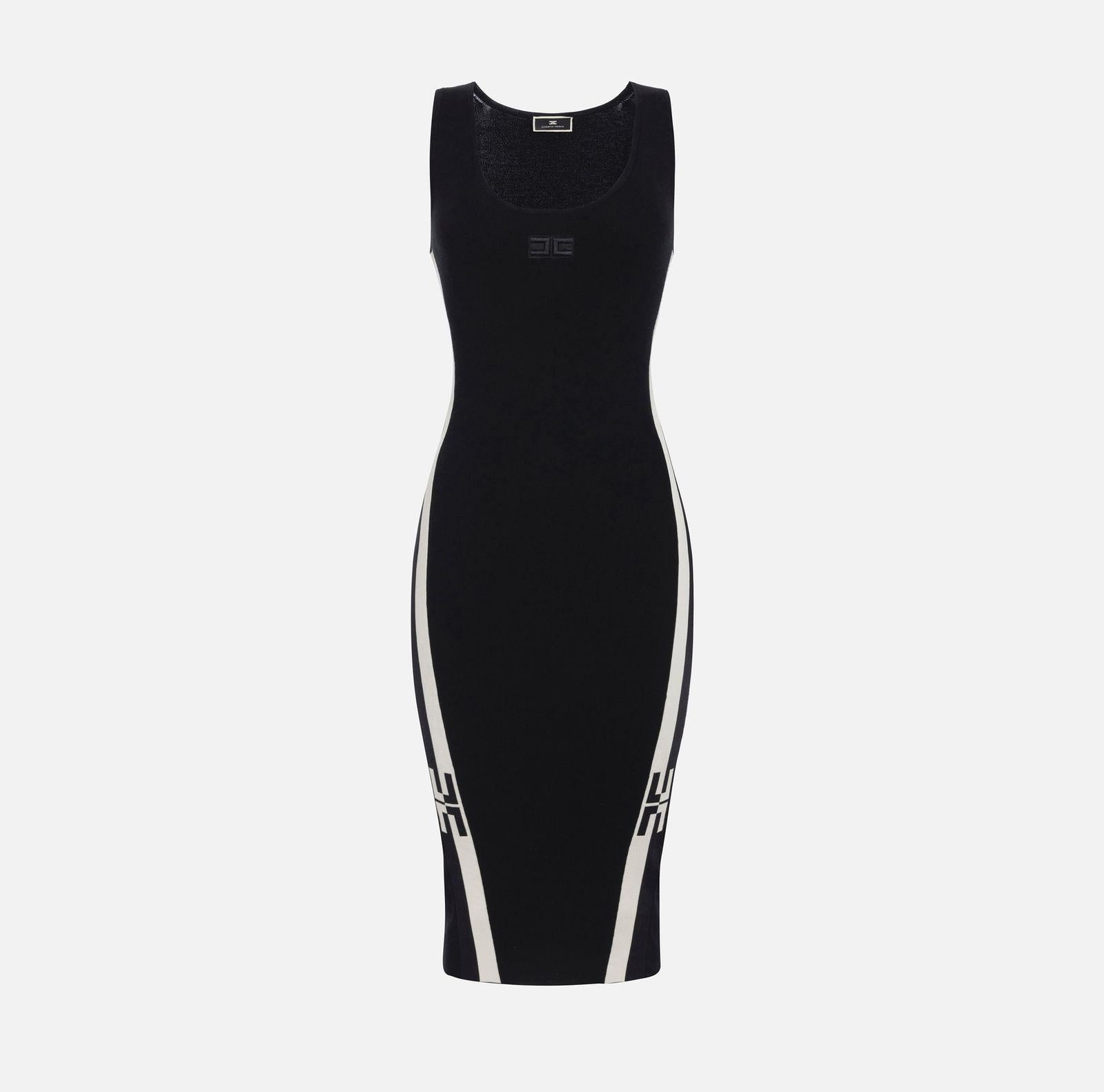 Abito midi smanicato realizzato in viscosa opaca con profonda scollatura rifinita centralmente da ricamo logo in tono, caratterizzato da bande laterali bicolor con logo in contrasto colore.