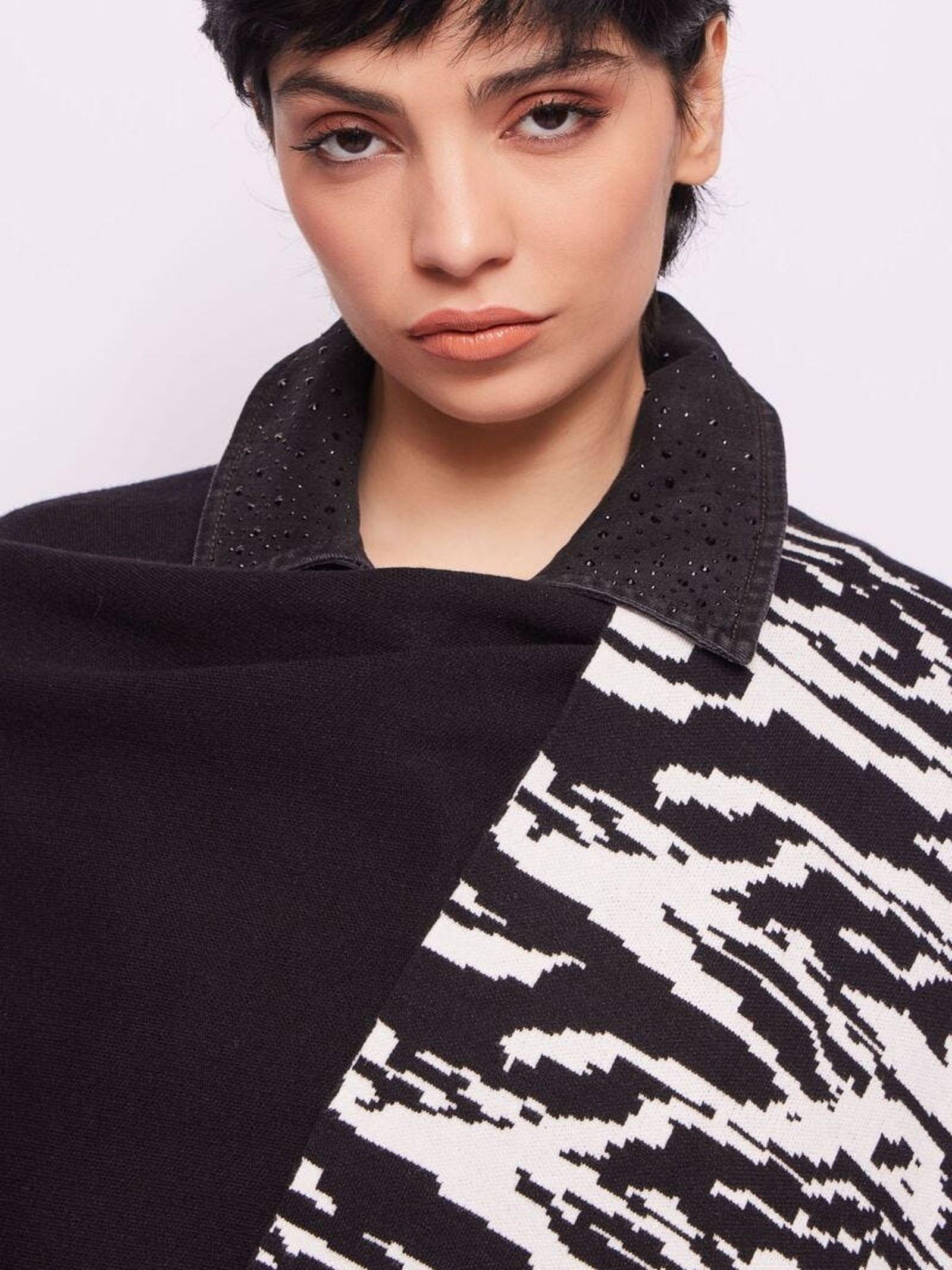 Mantella cappa in tessuto maglia di misto viscosa, con lavorazione motivo animalier jacquard bianco e nero, maniche a kimono. Ideale per completare ogni outift nella stagione invernale.