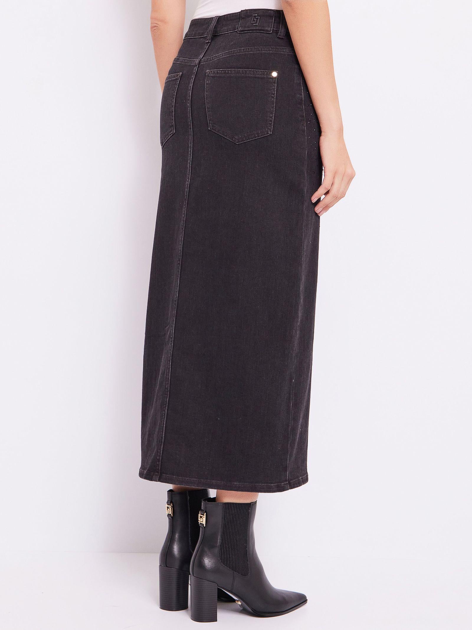 Gonna lunga in denim misto di cotone elasticizzato, impreziosita da applicazioni strass, caratterizzata da uno spacco sul davanti, chiusura con zip coperta e bottone metallico, e una salpa logata dietro.