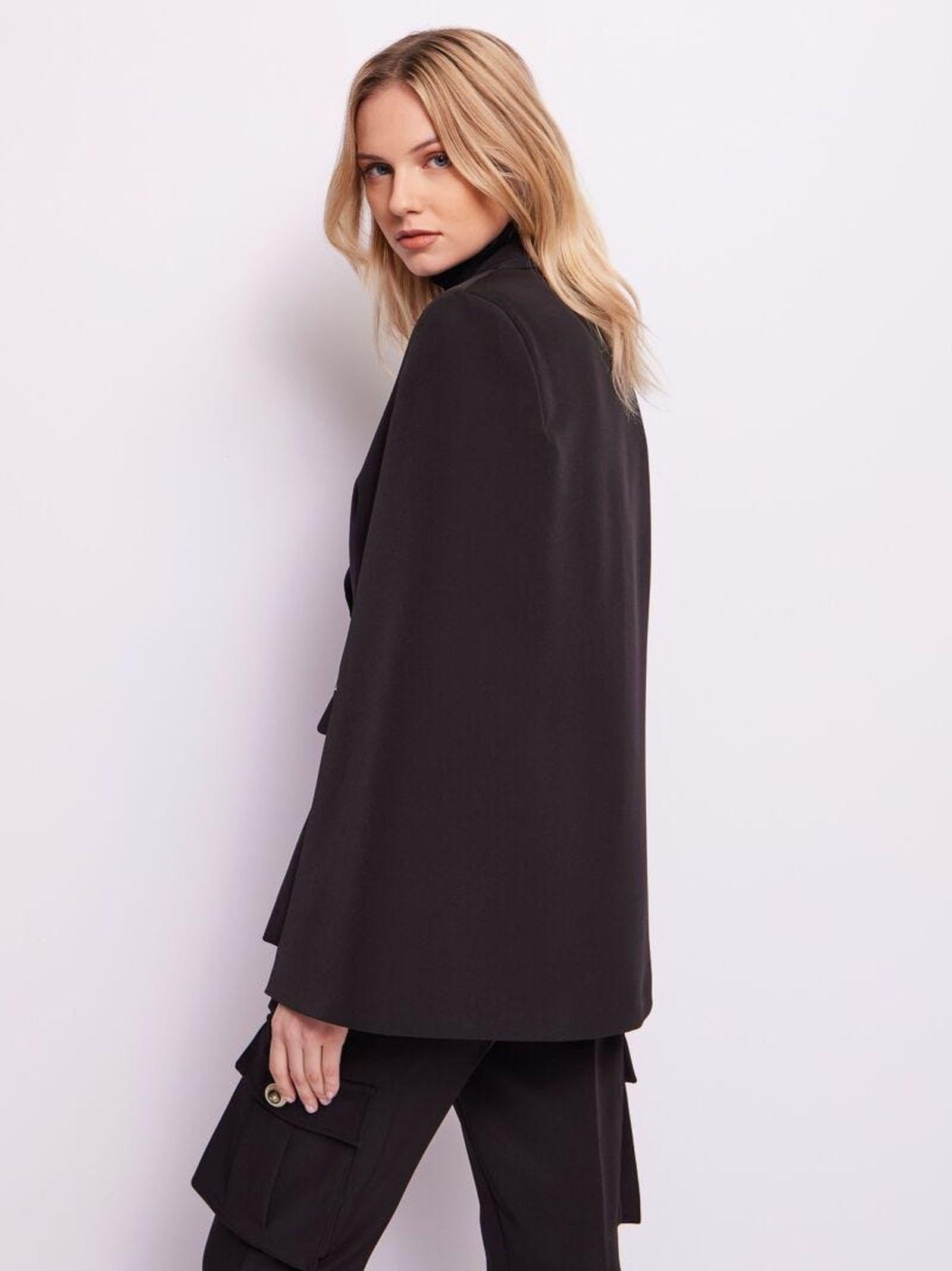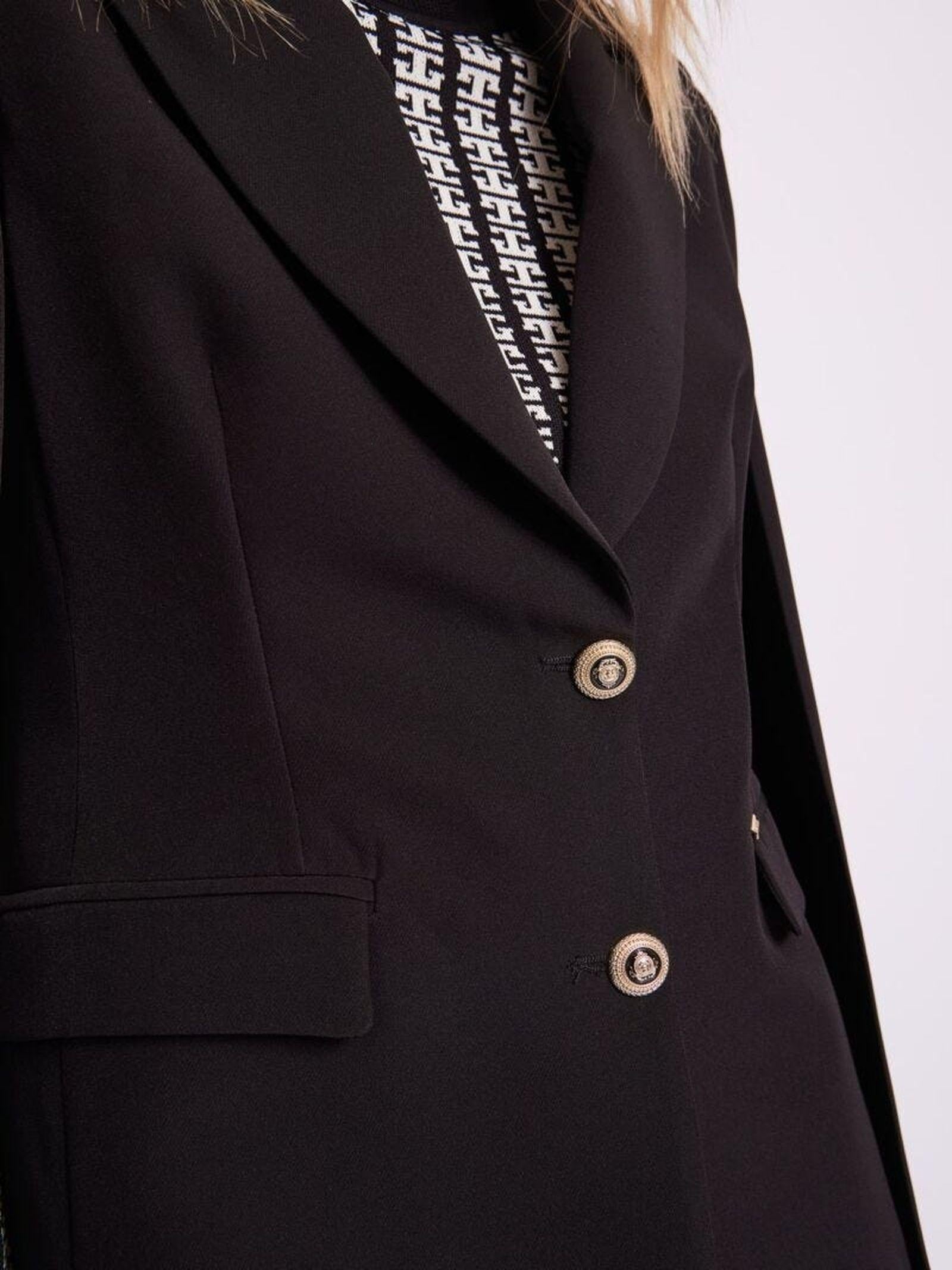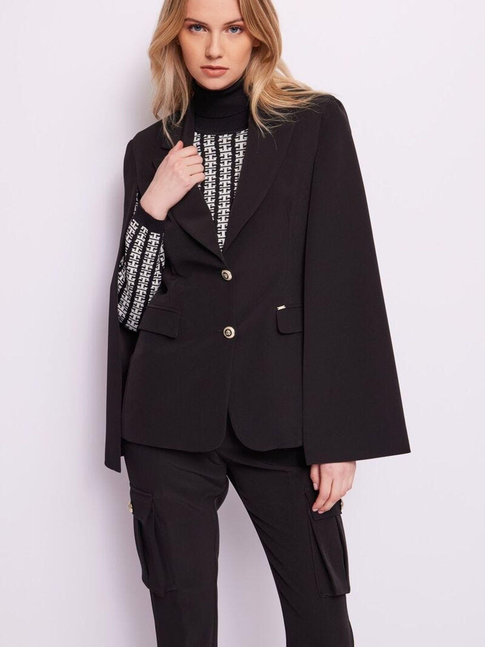 Giacca realizzata in tessuto tecnico elasticizzato, caratterizzata da collo revers a lancia, due tasche con patta sui lati, una chiusura monopetto con bottoni logati, fodera interna, ed un'etichetta logata. Si distingue per le maniche, con aperture interne, modello copribraccia.