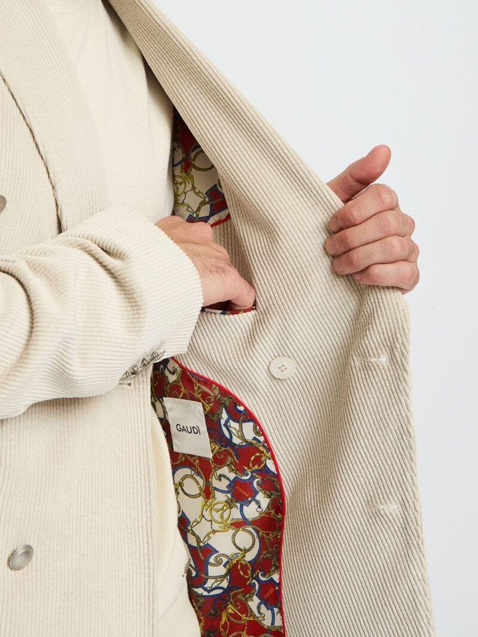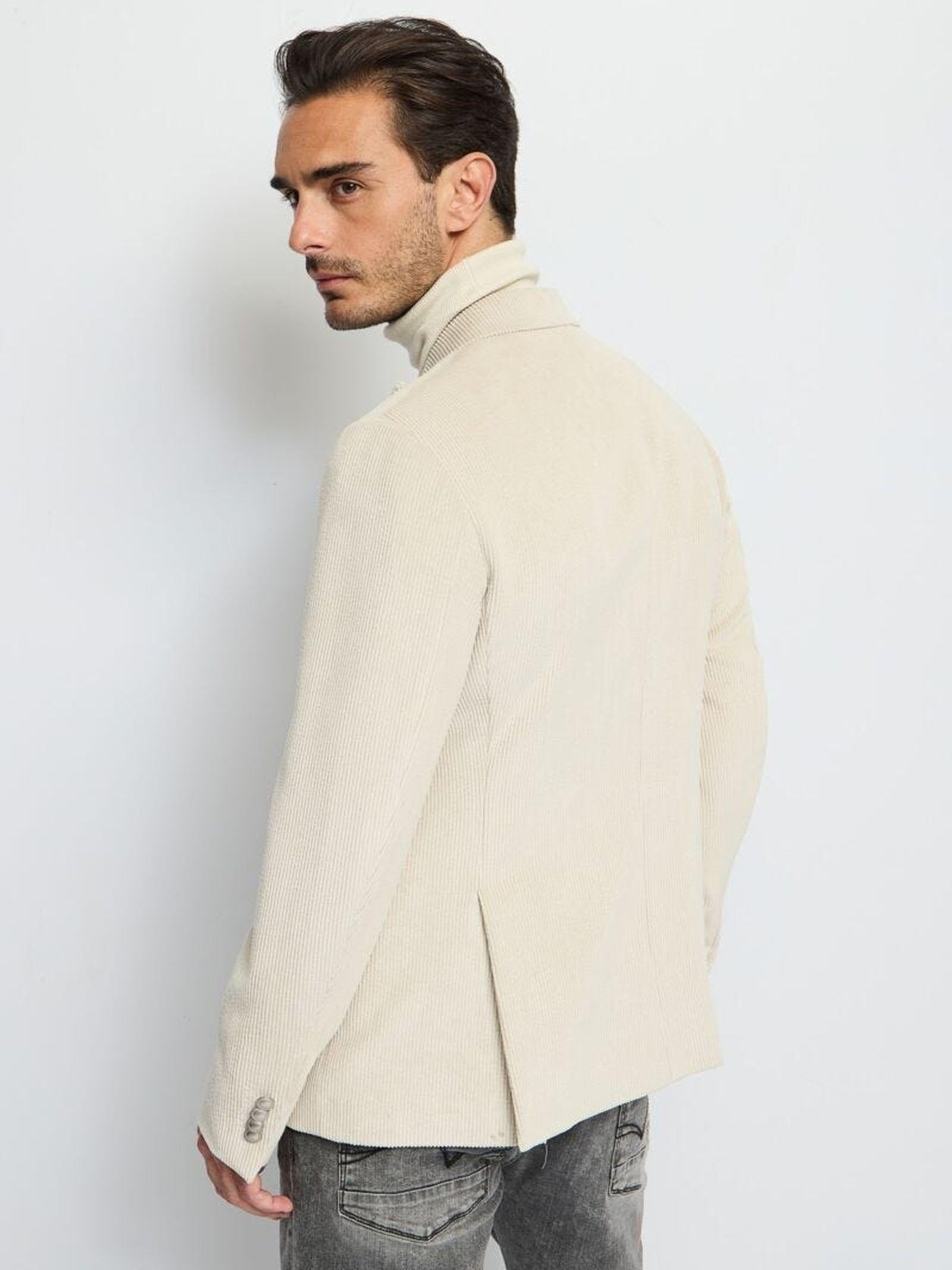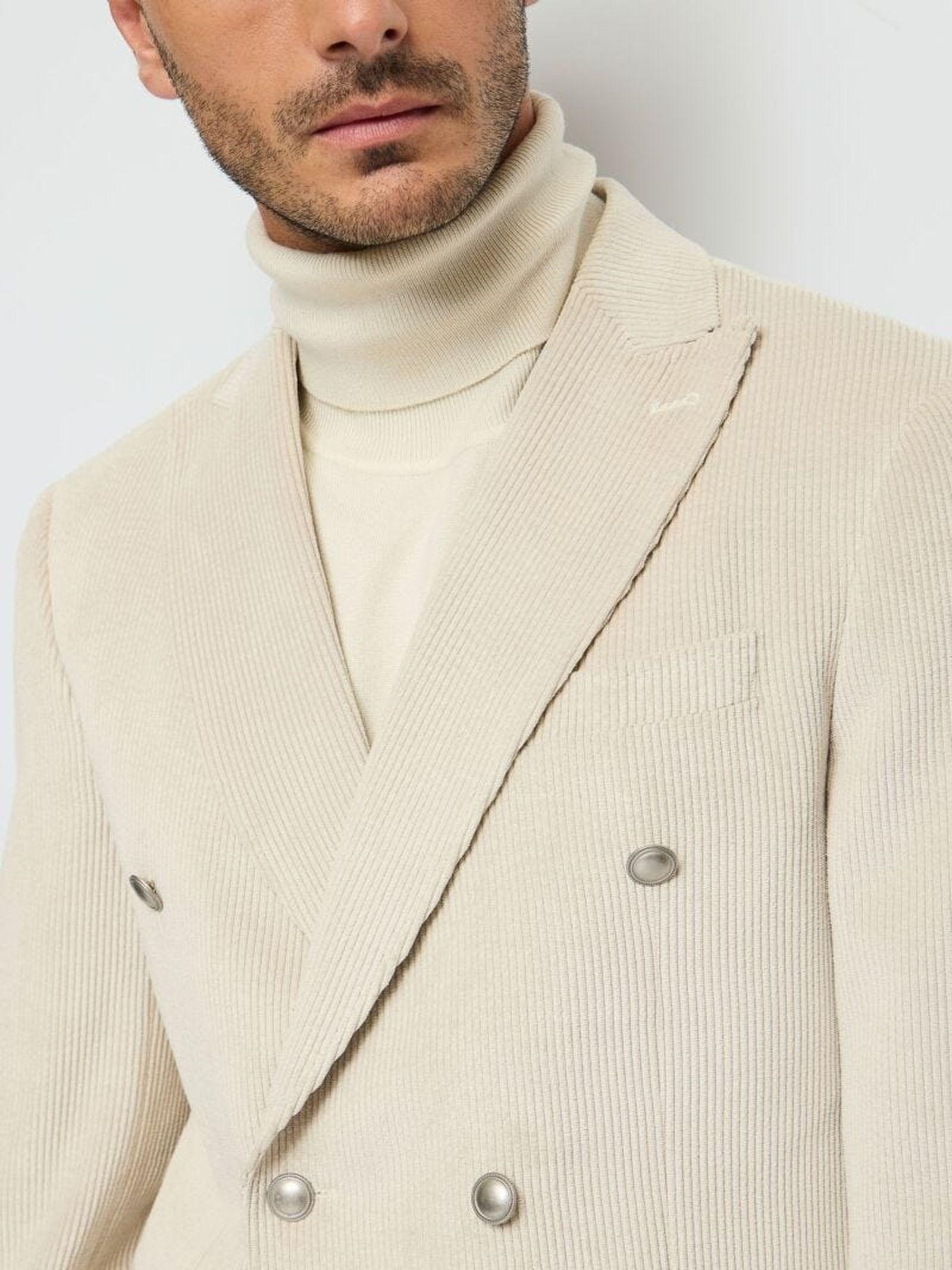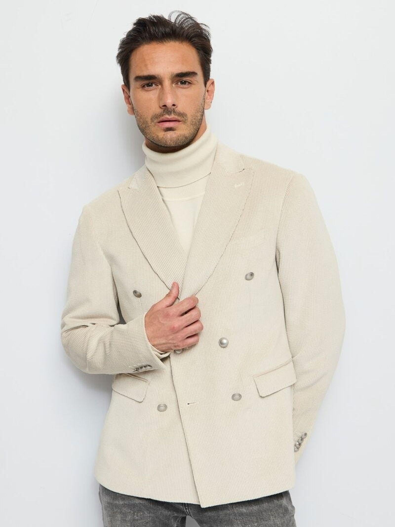 Giacca realizzata in velluto elasticizzato, caratterizzata da collo con revers a lancia, taschino a filetto sul petto, due tasche con patta sui lati, chiusura doppiopetto con bottoni, fodera interna.