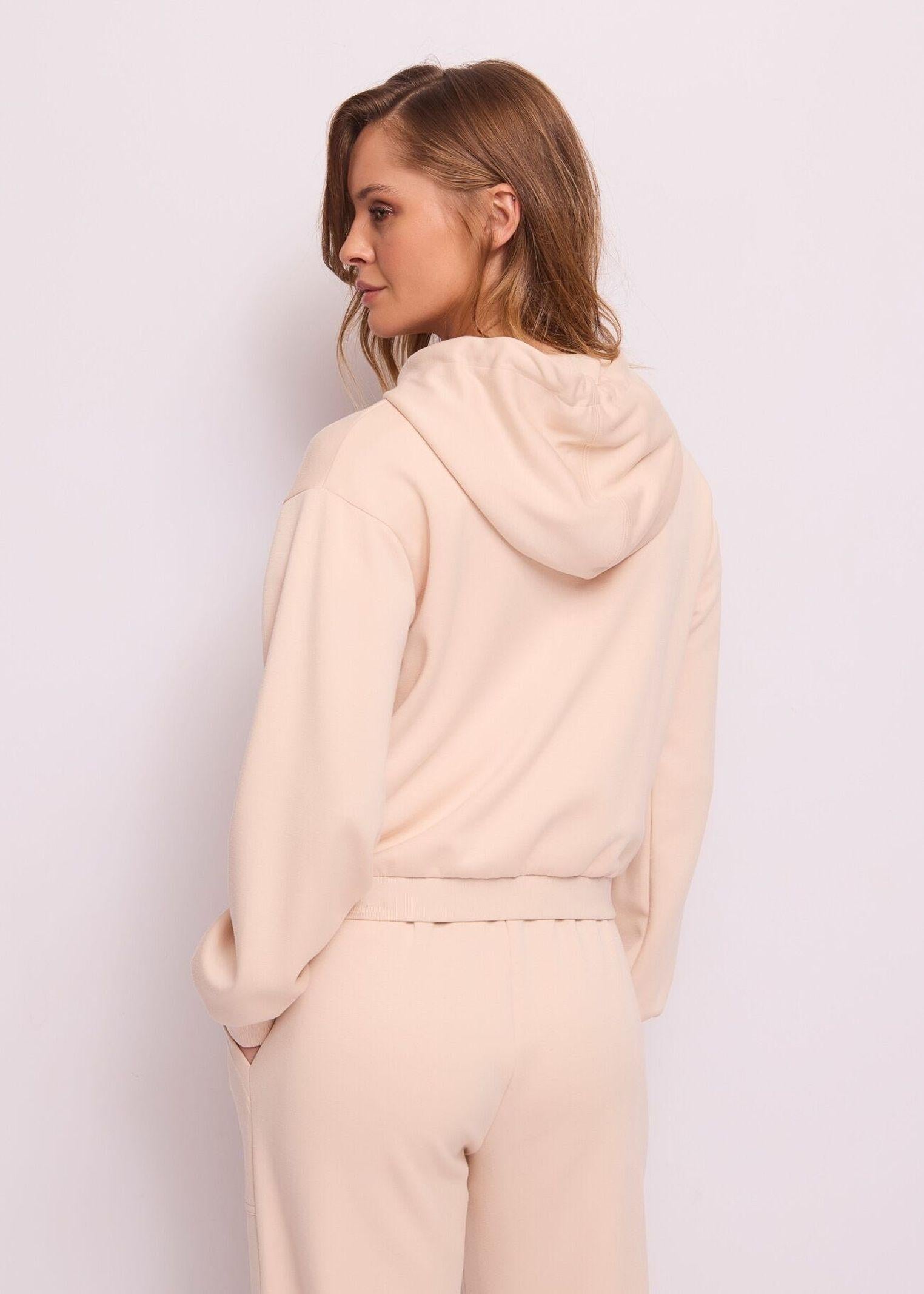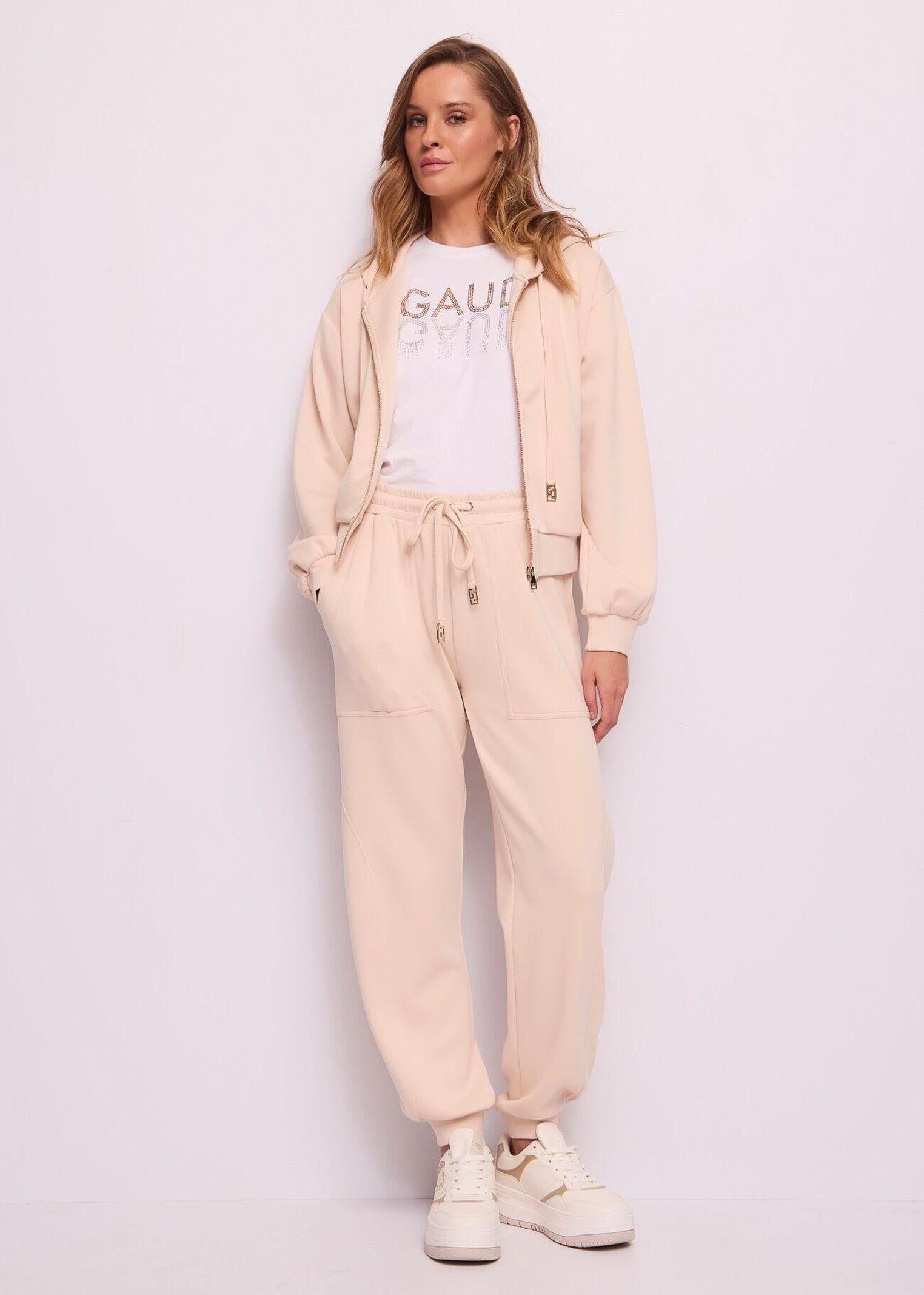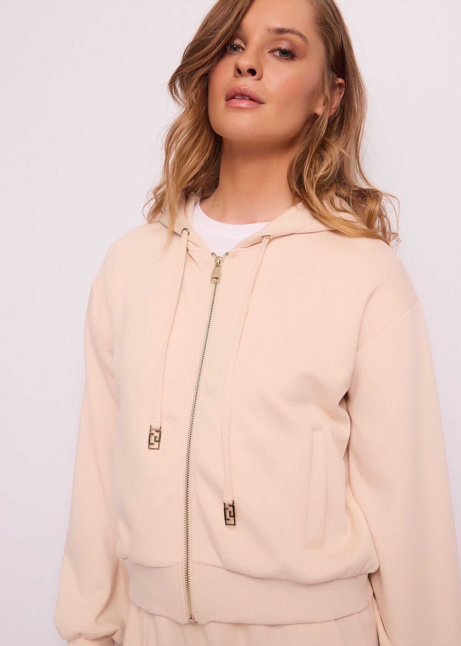 Maglia felpa aperta, con cappuccio e coulisse con occhielli e logo in metallo dorato e due tasche laterali. Ideale per un outfit moderno e distintivo abbinandola al pantalone jogging coordinato.