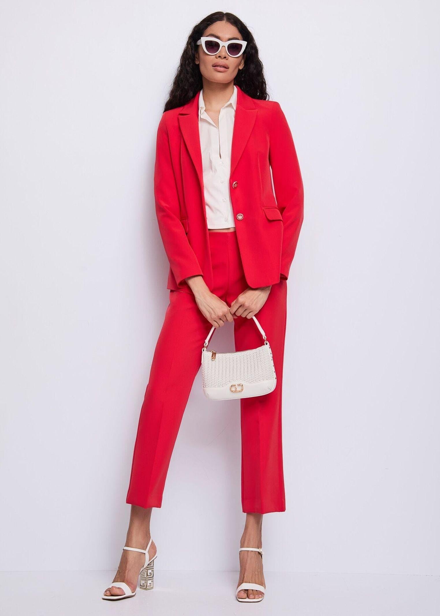 Pantalone senza tasche con piega centrale sulle gambe, cerniera laterale nascosta, e applicazioni fibbia color oro in vita, vestibilità aderente con gamba più ampia al fondo.