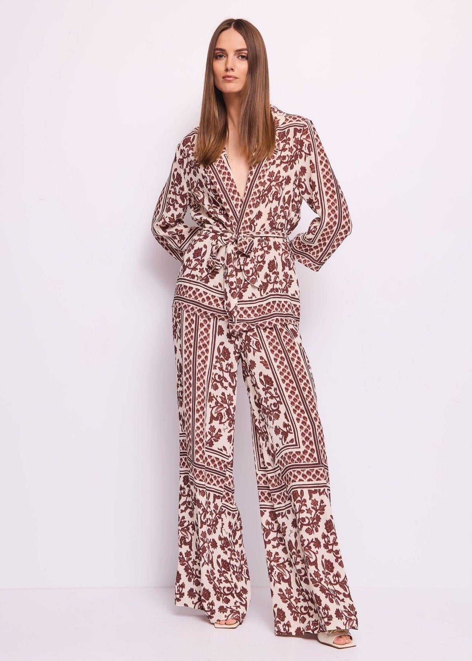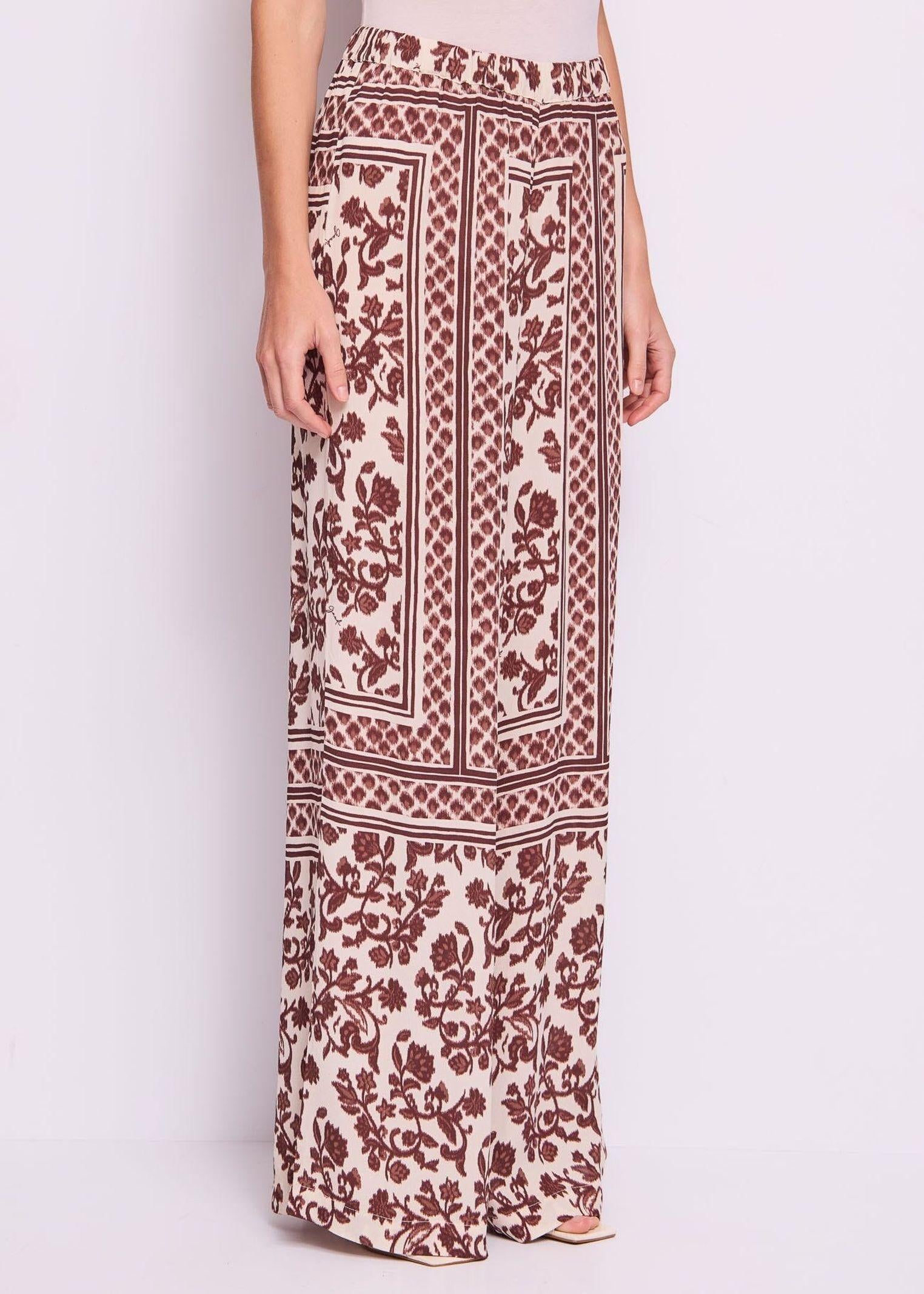 Pantalone leggero e fluido in tessuto crêpe, caratterizzato da una vivace stampa floreale all-over. L’inserto elastico in vita garantisce una vestibilità comoda e versatile, adattandosi facilmente alla silhouette. Perfetto per look estivi femminili e rilassati, da giorno o da sera.