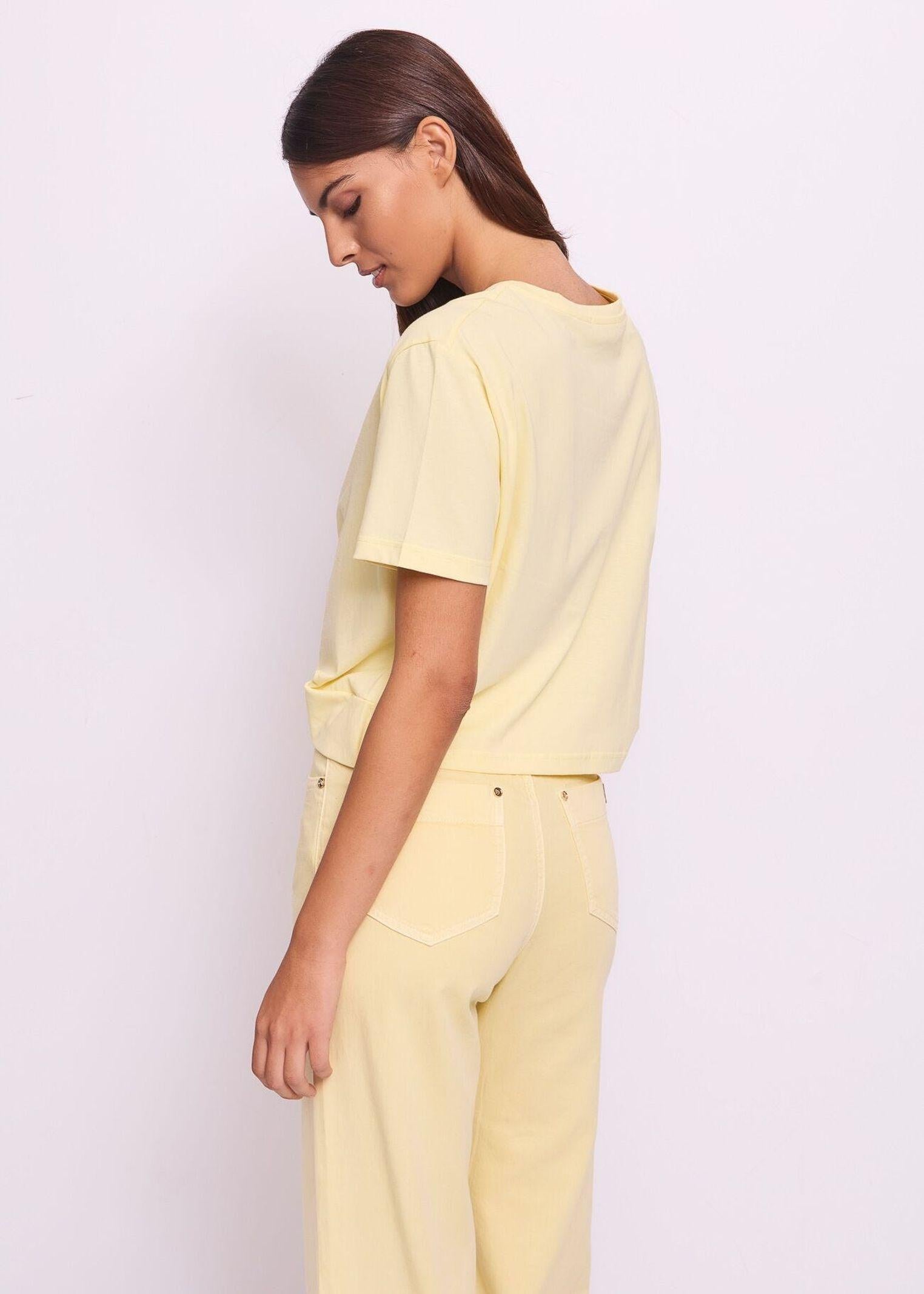 T-shirt in jersey di cotone elasticizzato con logo stampato sul petto e dettaglio a nodo sul davanti. Il taglio cropped dona un tocco moderno e femminile, ideale per look casual e versatili.