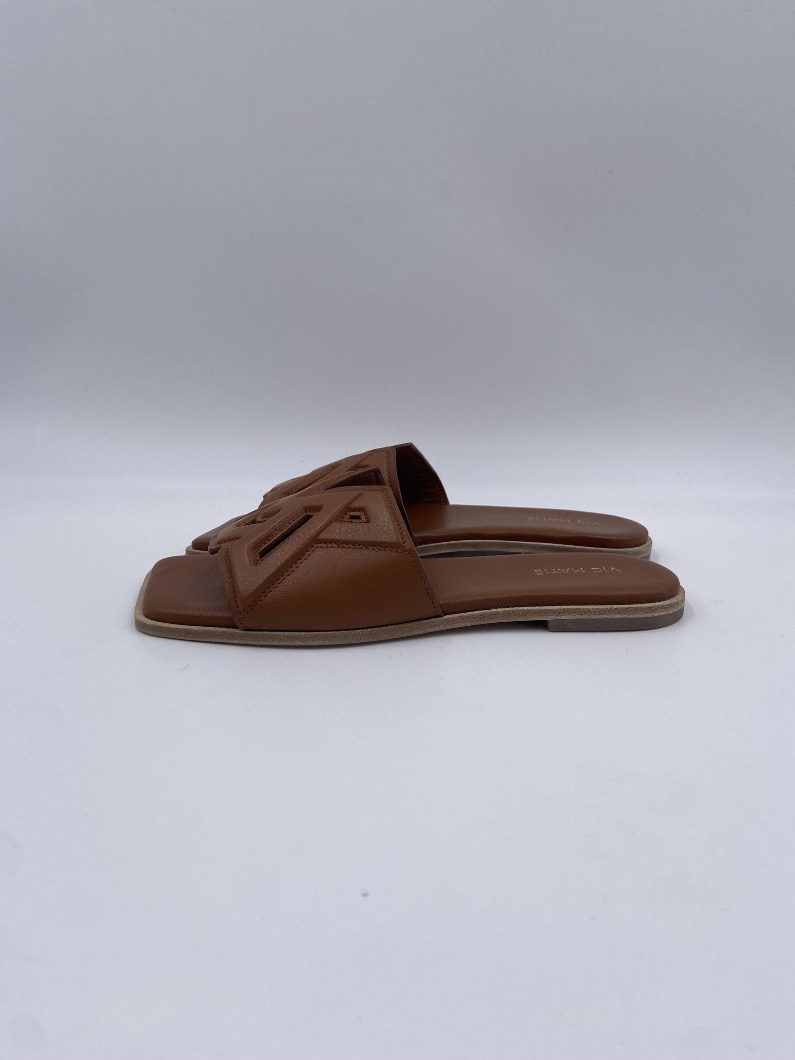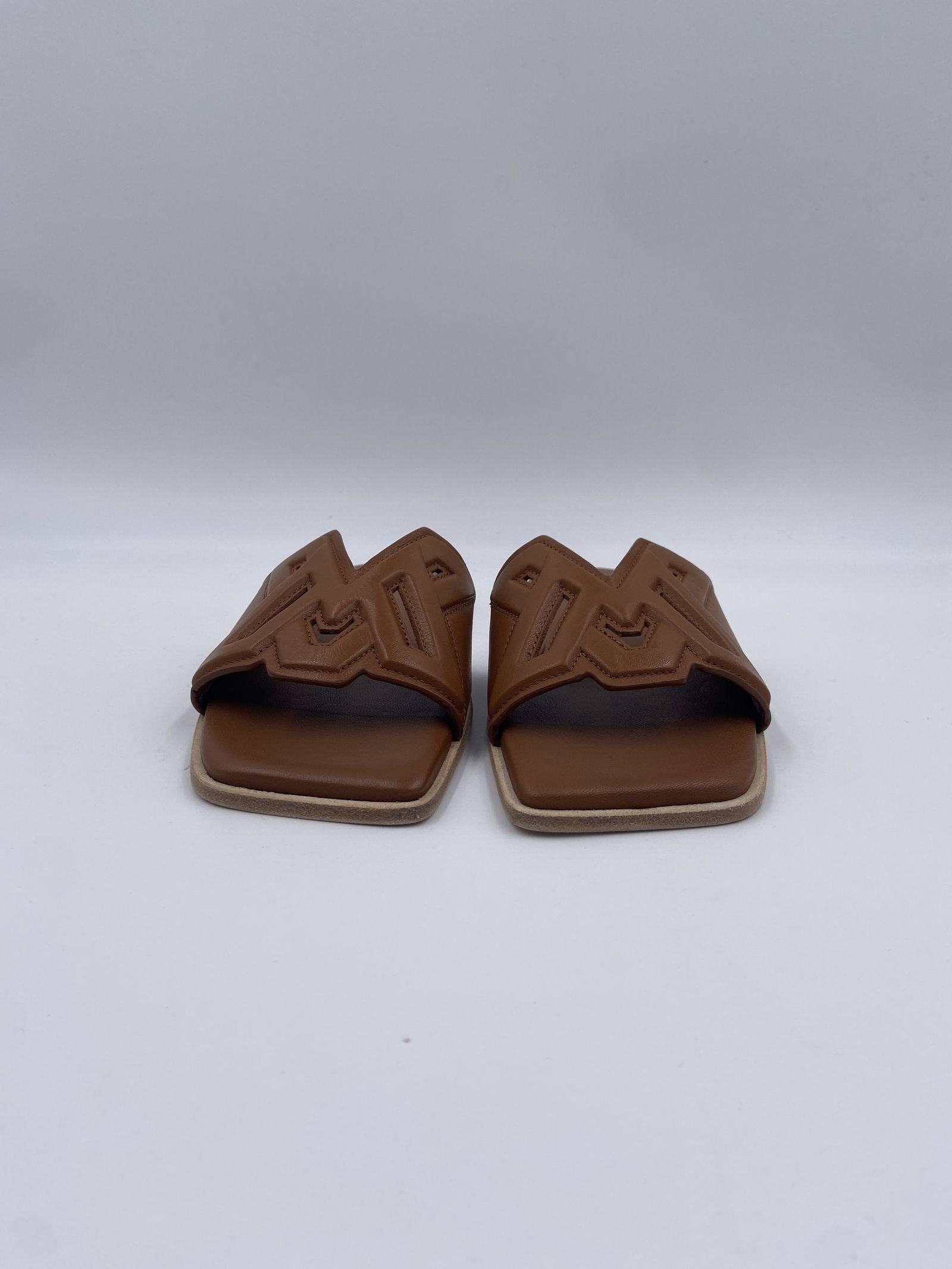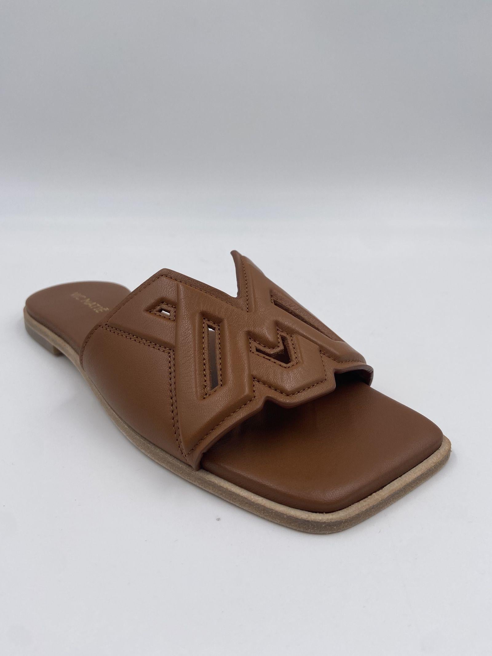 Ciabatta monogram realizzata in nappa di vitello con logo in rilievo, cucito e traforato. Ha una suola in cuoio con tacco flat antiscivolo in gomma e un sottopiede leggermente imbottito e rivestito in pelle.