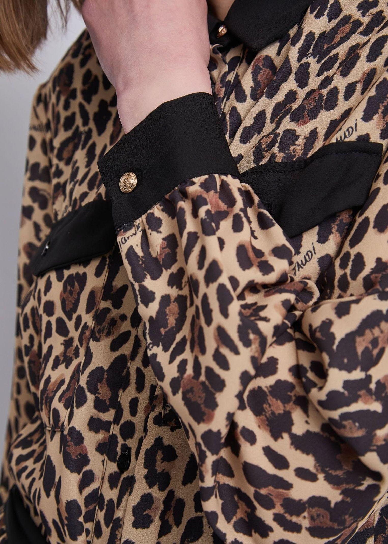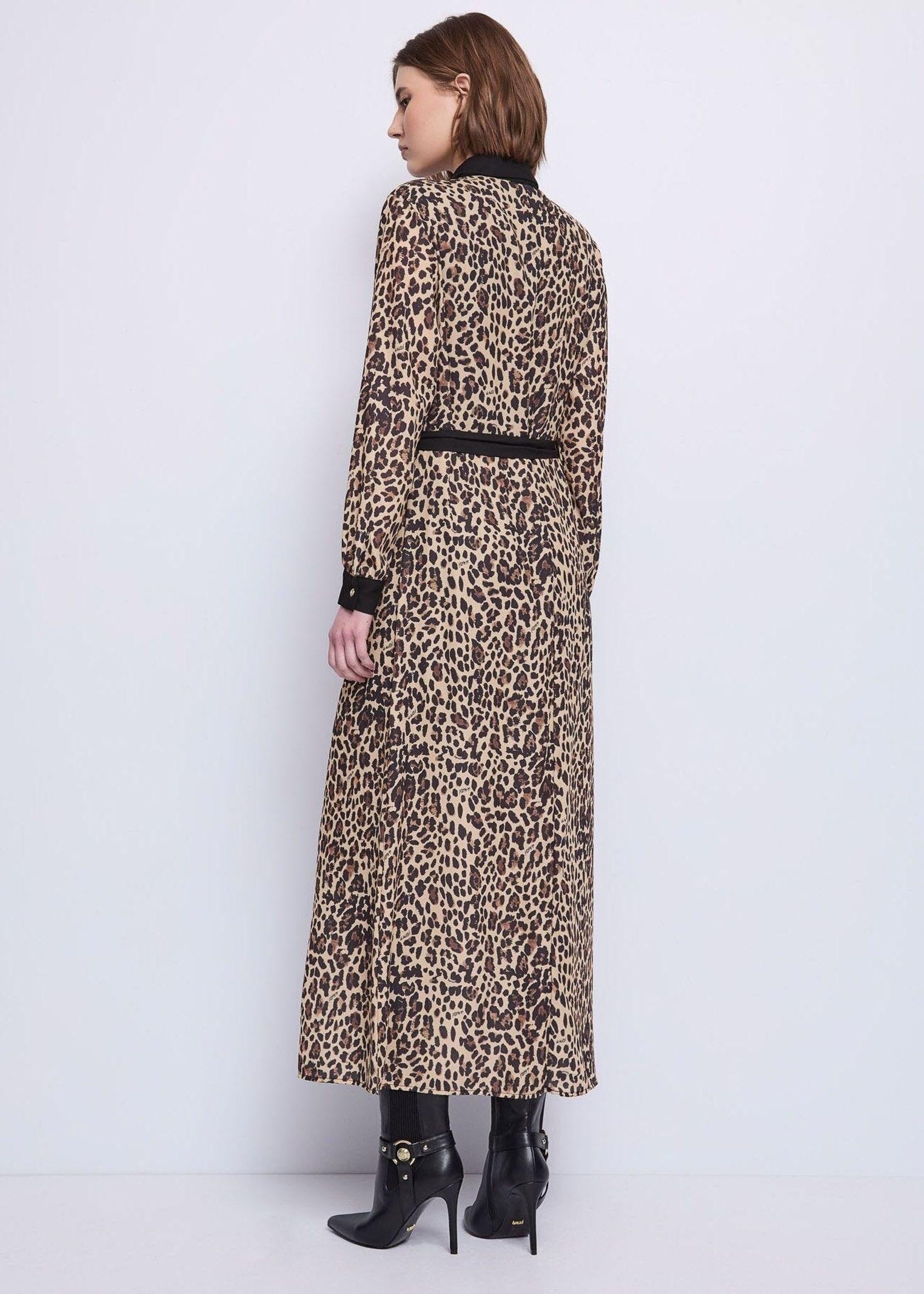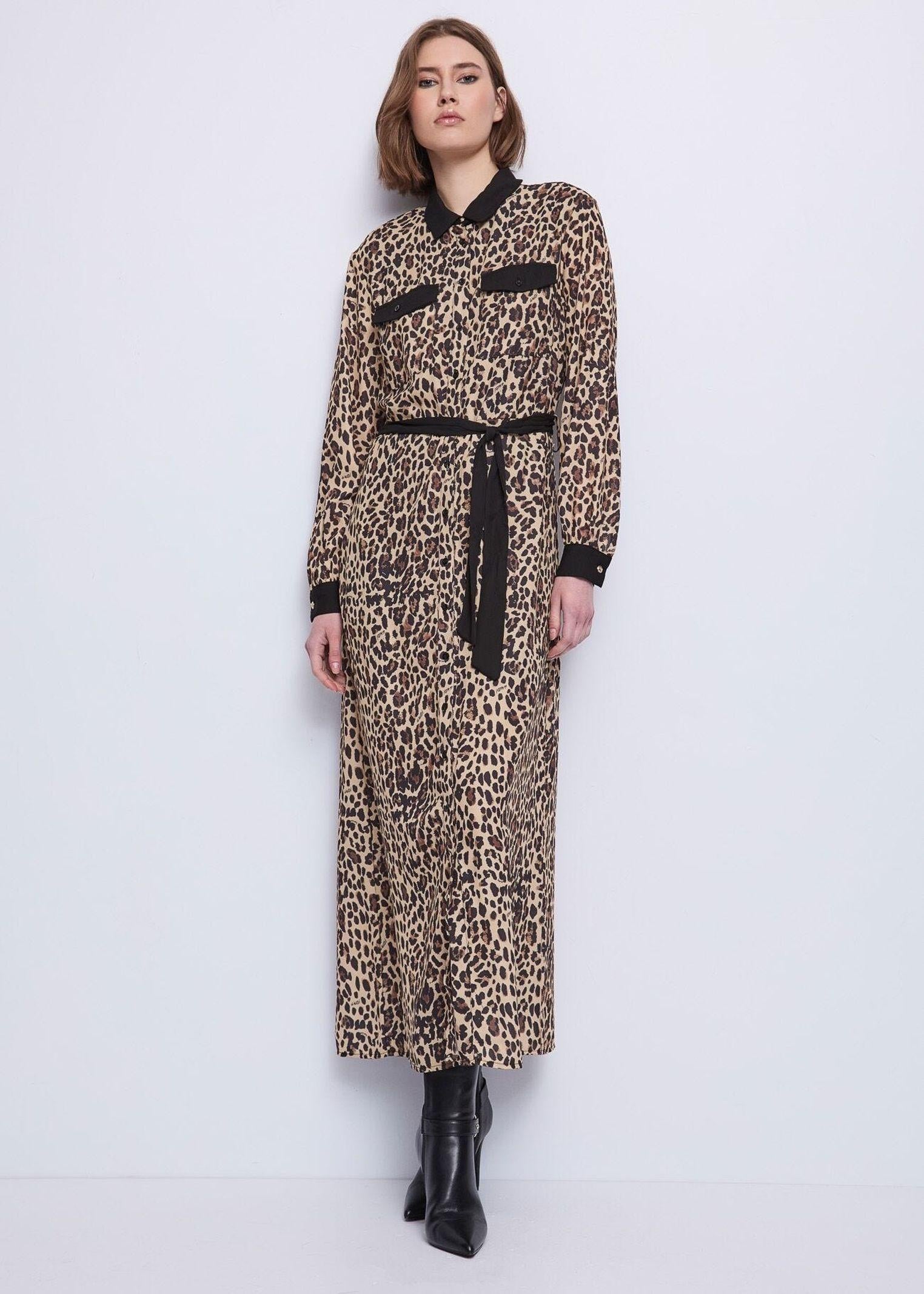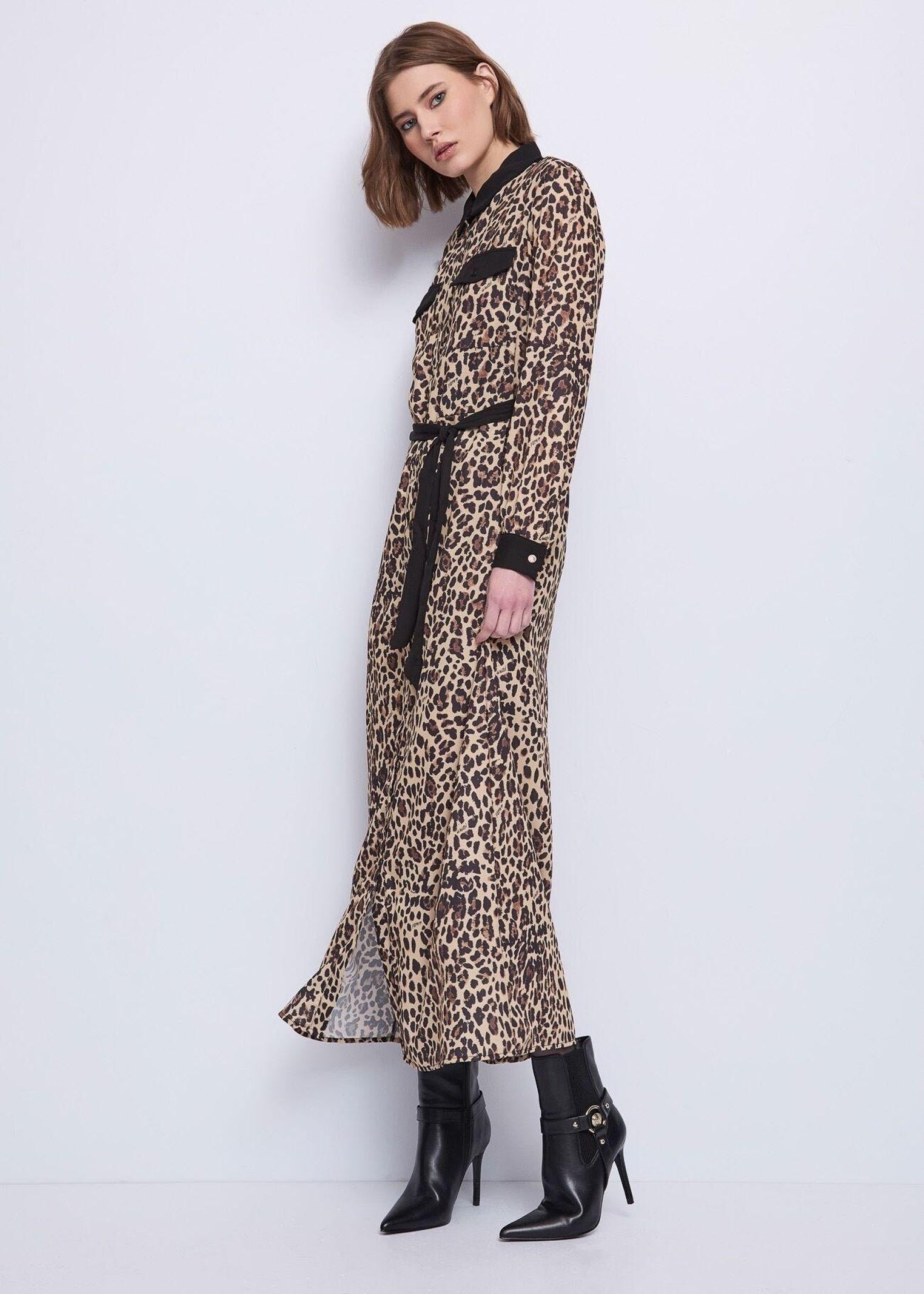 Abito lungo chemisier realizzato in georgette con stampa animalier, bottoni GJ dorati e cintura al punto vita, pensato per valorizzare la silhouette con eleganza. Il tessuto leggero e fluido conferisce movimento e comfort, mentre i dettagli metallici aggiungono un tocco raffinato. Perfetto per un look sofisticato e grintoso, ideale da giorno o da sera con uno stile distintivo e moderno.