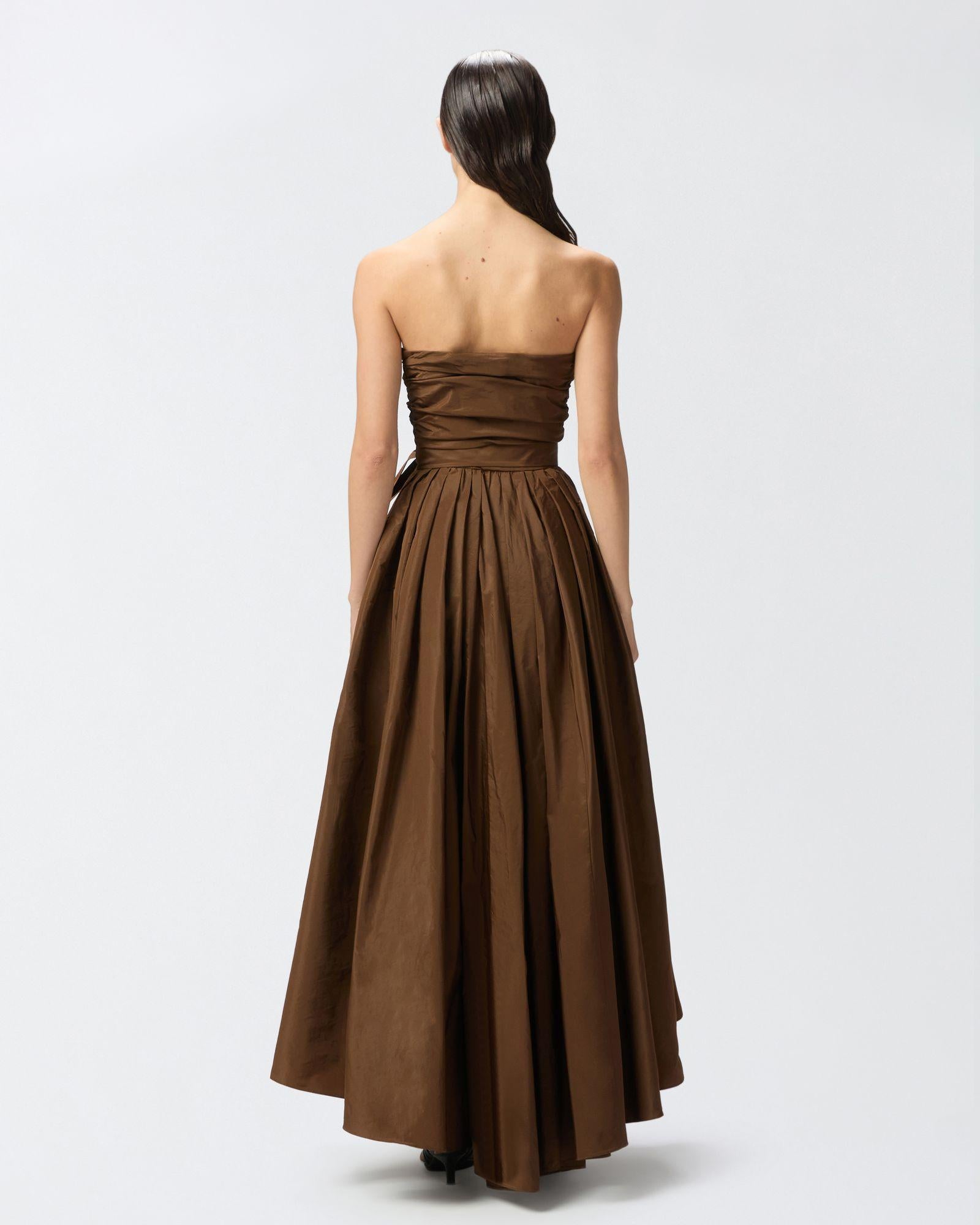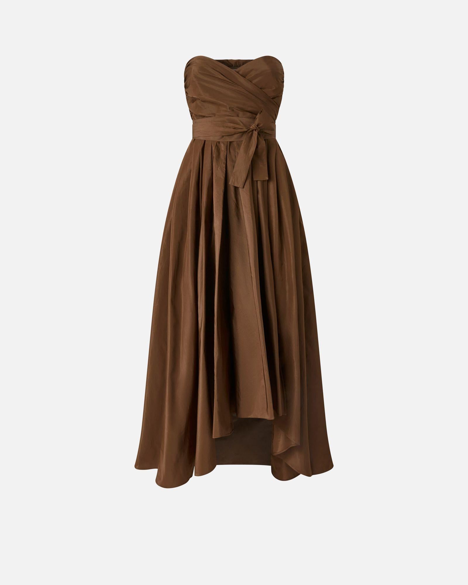 Abito midi senza maniche realizzato in tessuto taffetà, un tessuto che si presta molto alla costruzione di volumi geometrici ed effetti speciali. Questo abito è caratterizzato da bustino senza spalline con scollo a cuore incrociato e gonna voluminosa a pieghe morbide, leggermente più corta davanti, e una cintura a fusciacca da annodare alta sul bustino per enfatizzare la silhouette, tasche inserite sui fianchi.
