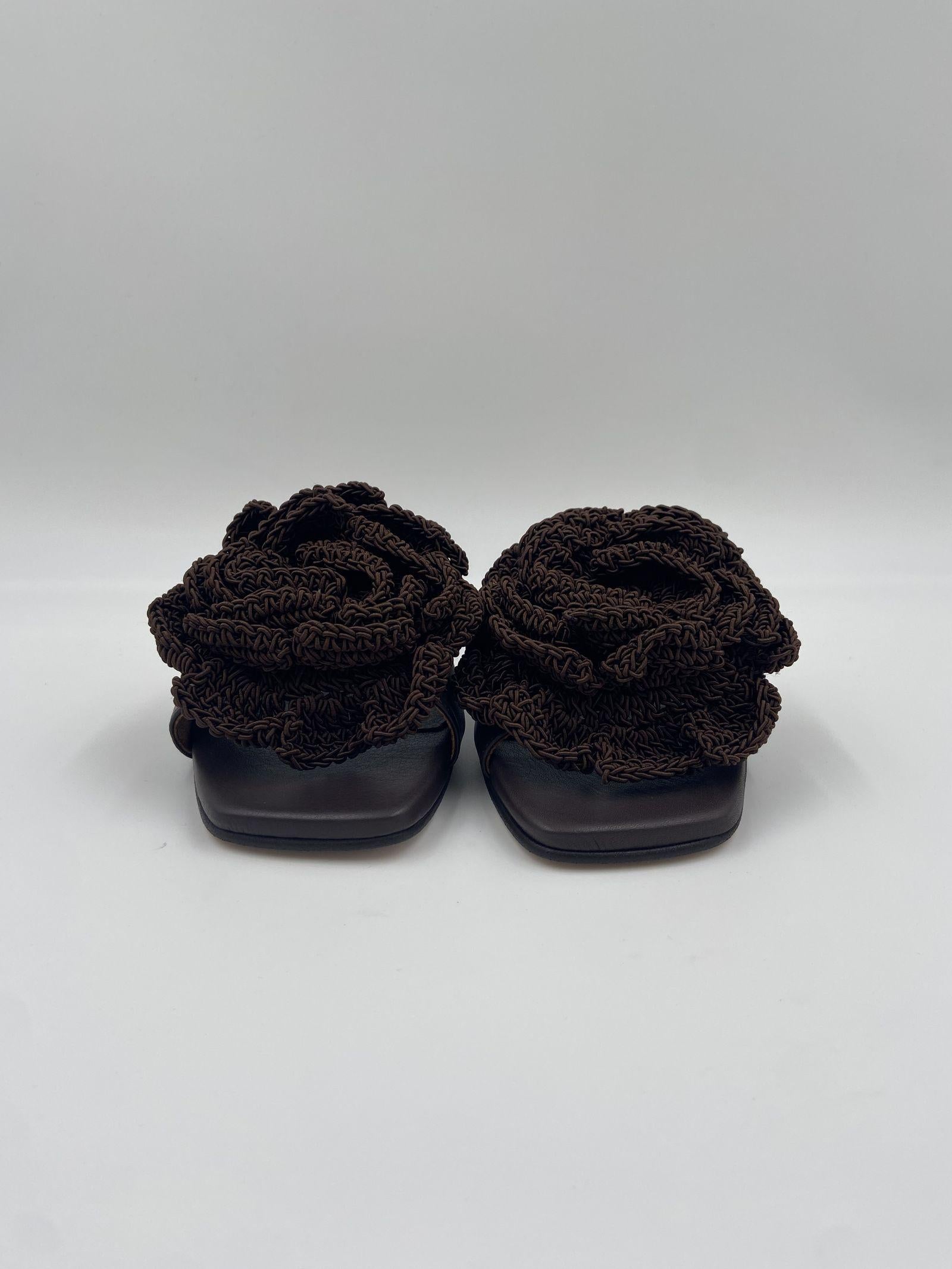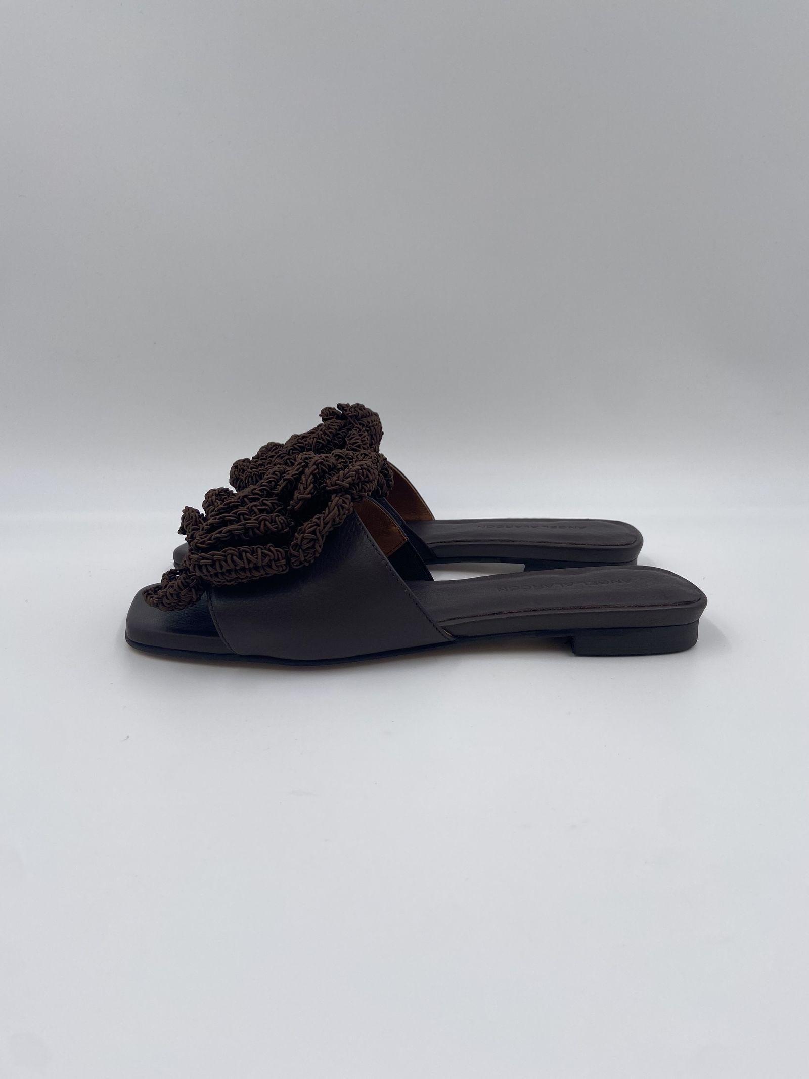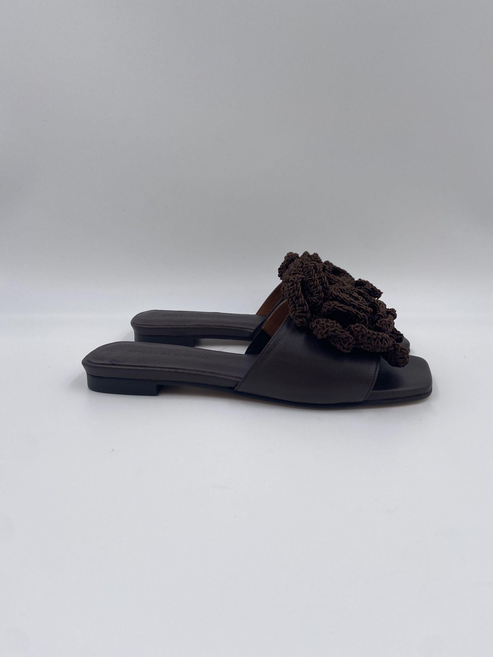 Sandalo ciabatta realizzato in pelle caratterizzato da un design a punta quadrata e una fascia sul collo del piede con un accessorio a maglia a forma di fiore, una morbida soletta in pelle che insieme al fondo in gomma alzano il tallone dal suolo di 2 cm.