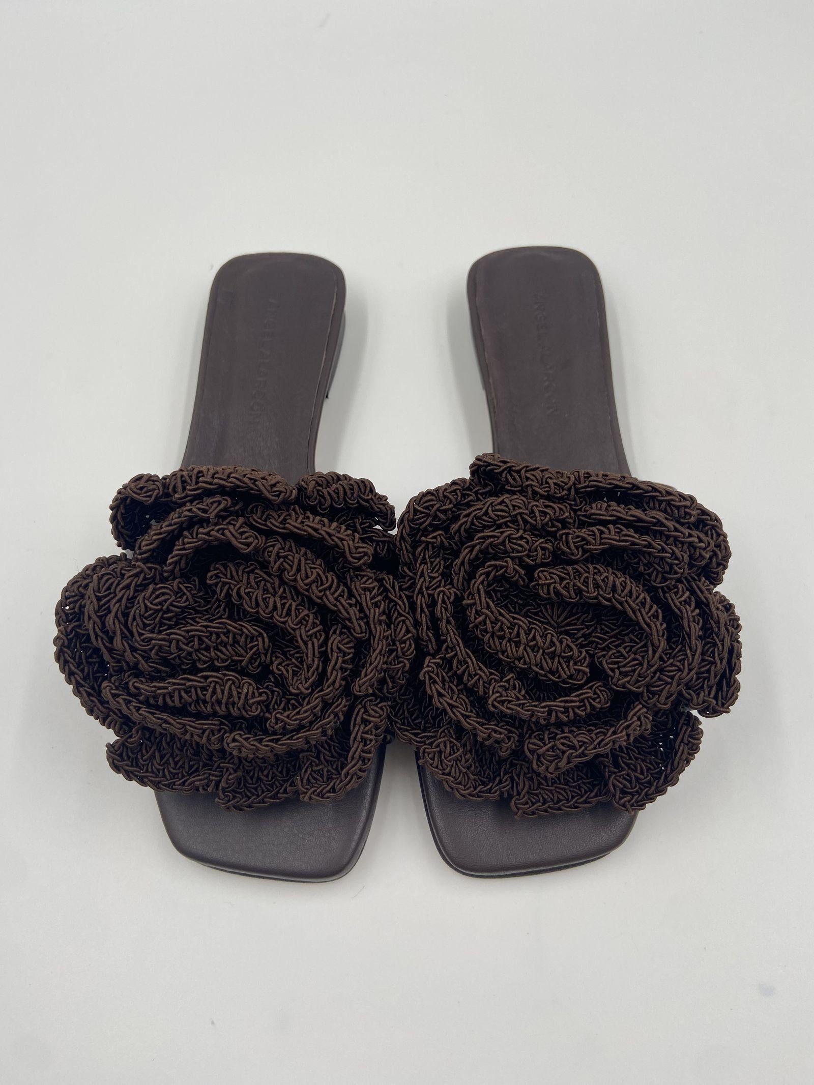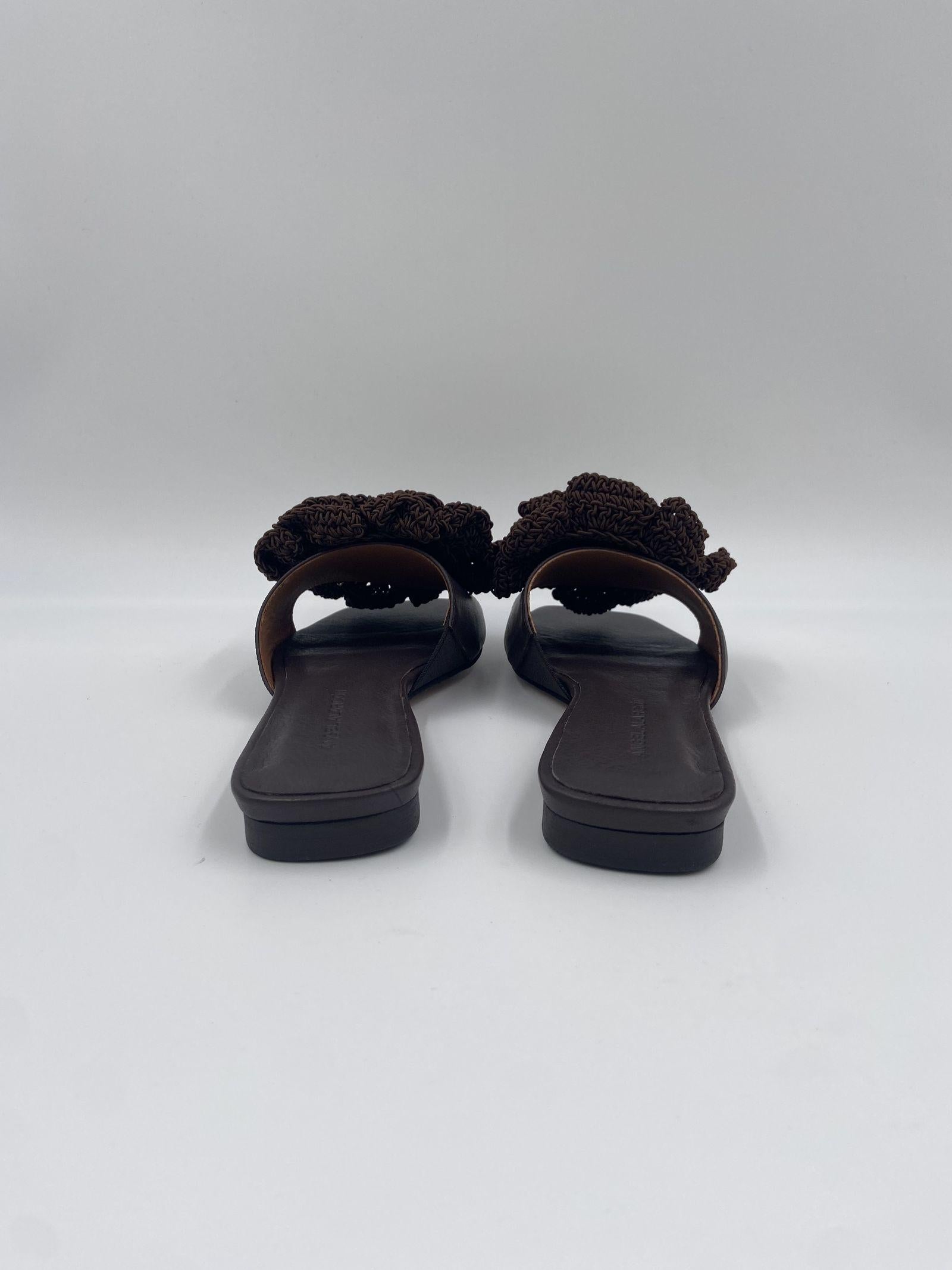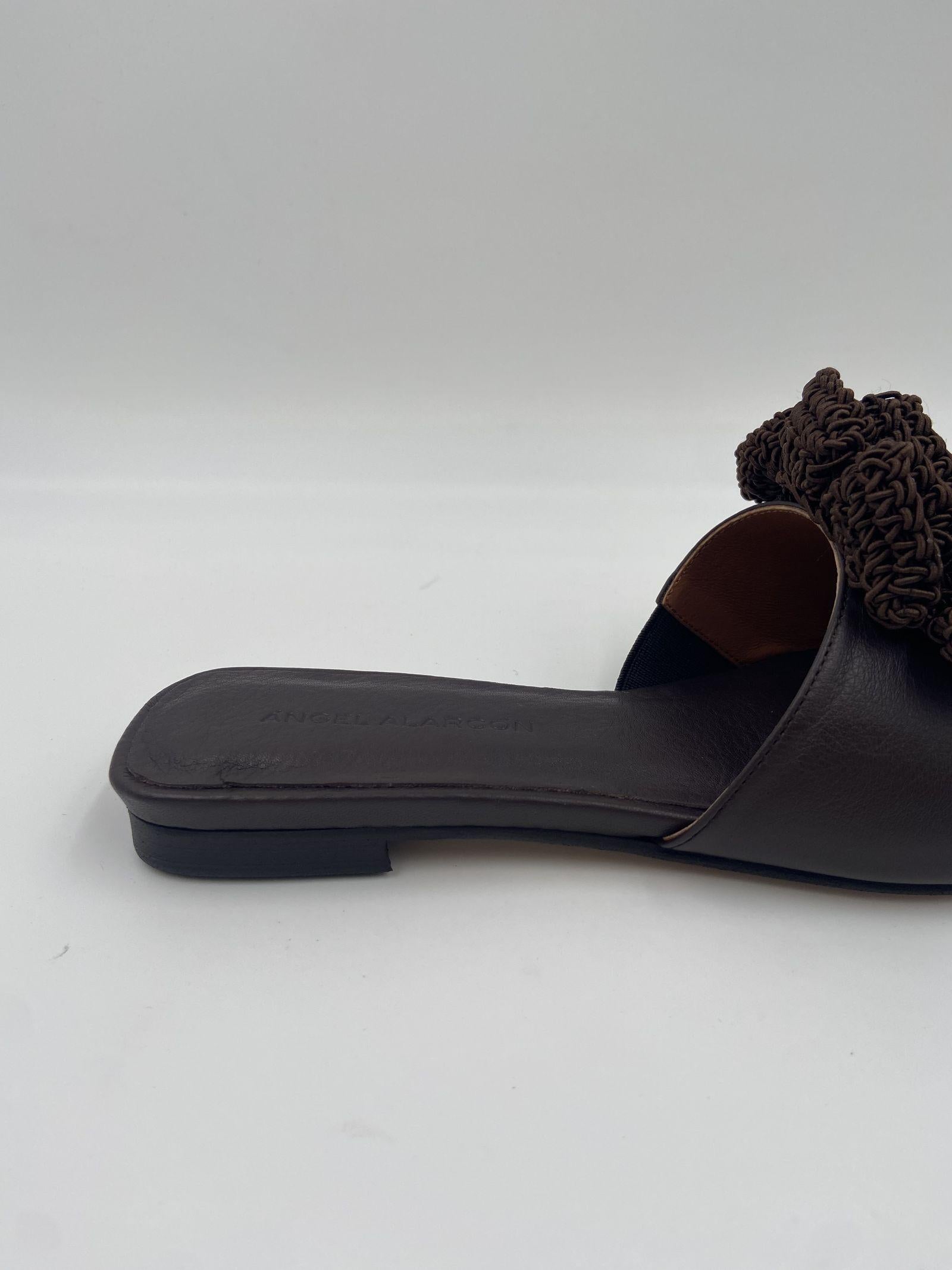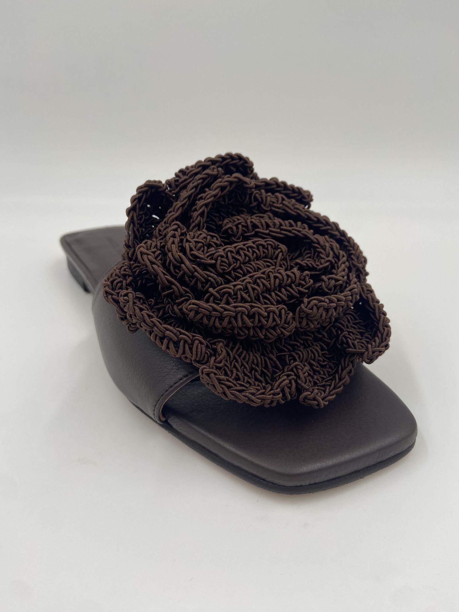 Sandalo ciabatta realizzato in pelle caratterizzato da un design a punta quadrata e una fascia sul collo del piede con un accessorio a maglia a forma di fiore, una morbida soletta in pelle che insieme al fondo in gomma alzano il tallone dal suolo di 2 cm.