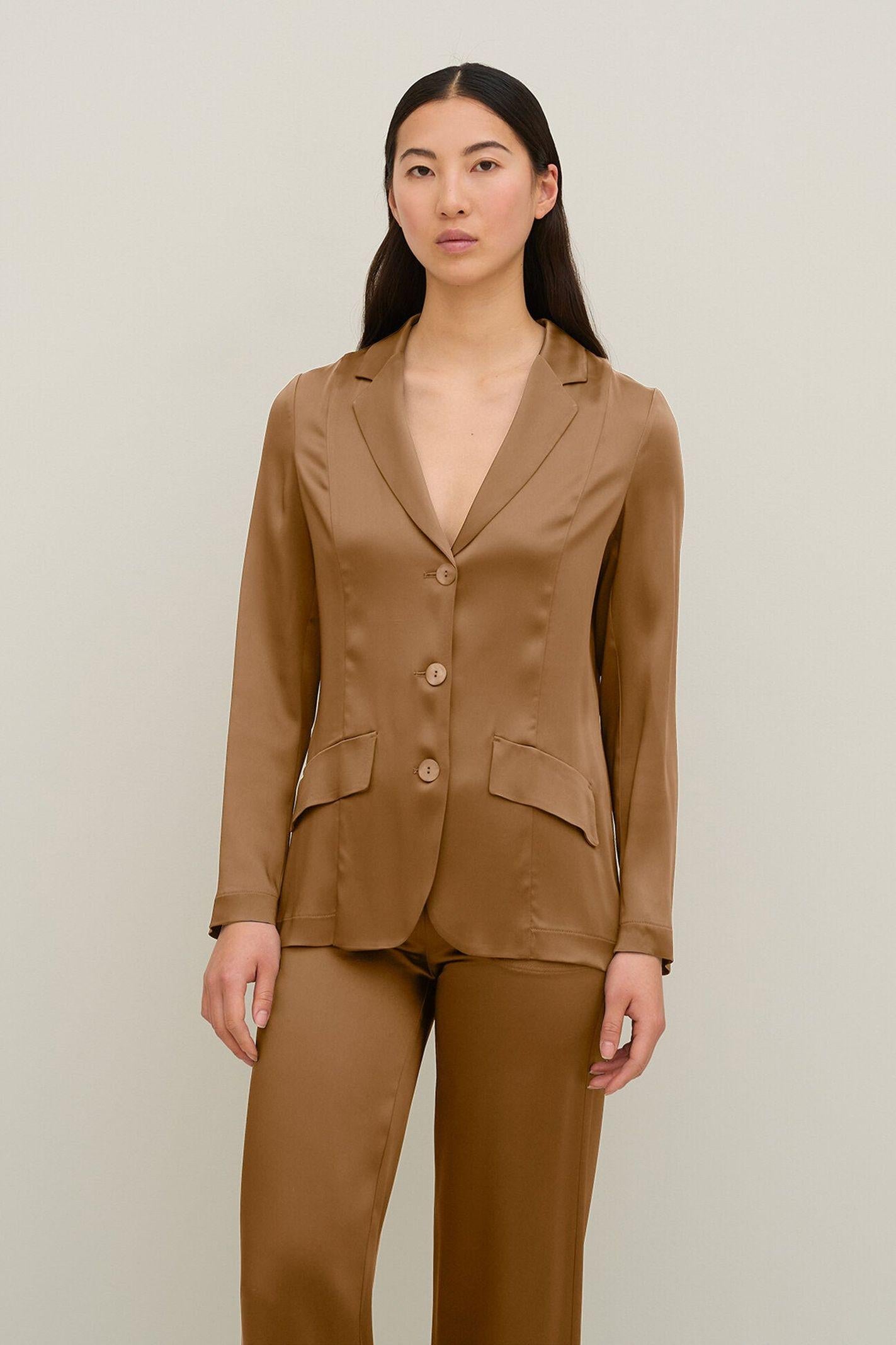 Giacca sfoderata monopetto realizzata in tessuto satin, allacciatura a tre bottoni in madreperla, con collo a revers. Ha tasche davanti con patta, e una lunghezza sotto ai fianchi.
