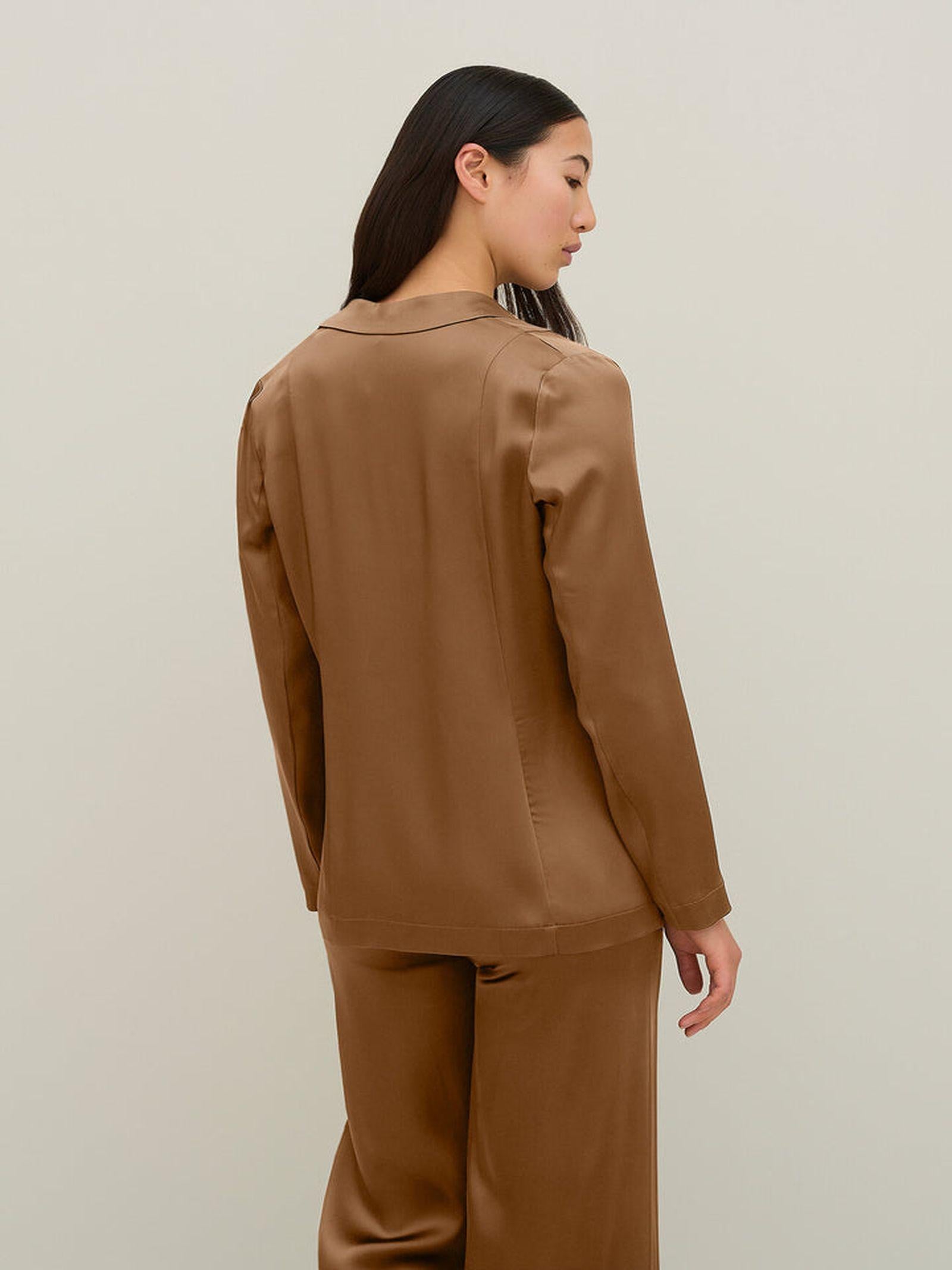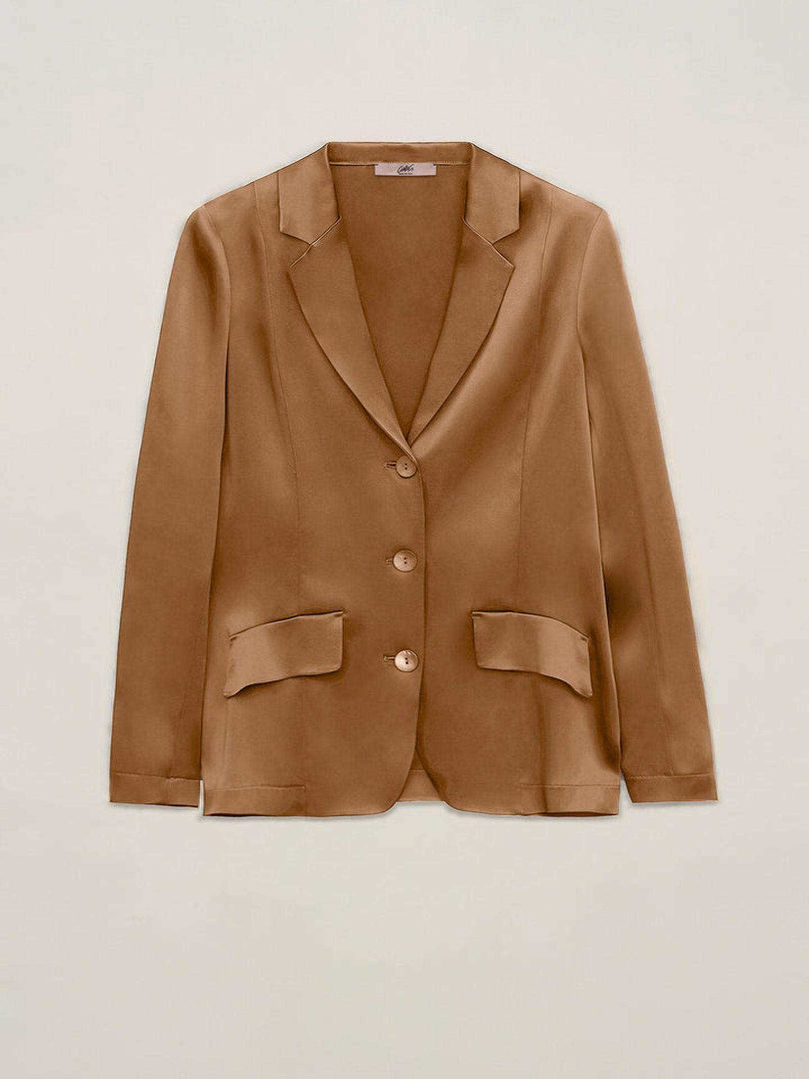 Giacca sfoderata monopetto realizzata in tessuto satin, allacciatura a tre bottoni in madreperla, con collo a revers. Ha tasche davanti con patta, e una lunghezza sotto ai fianchi.