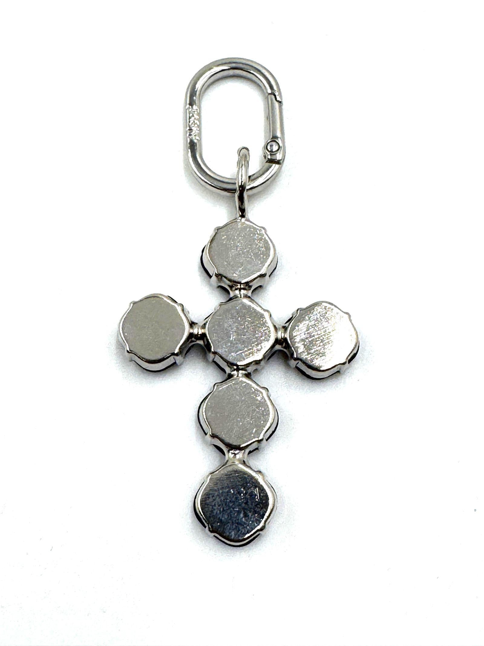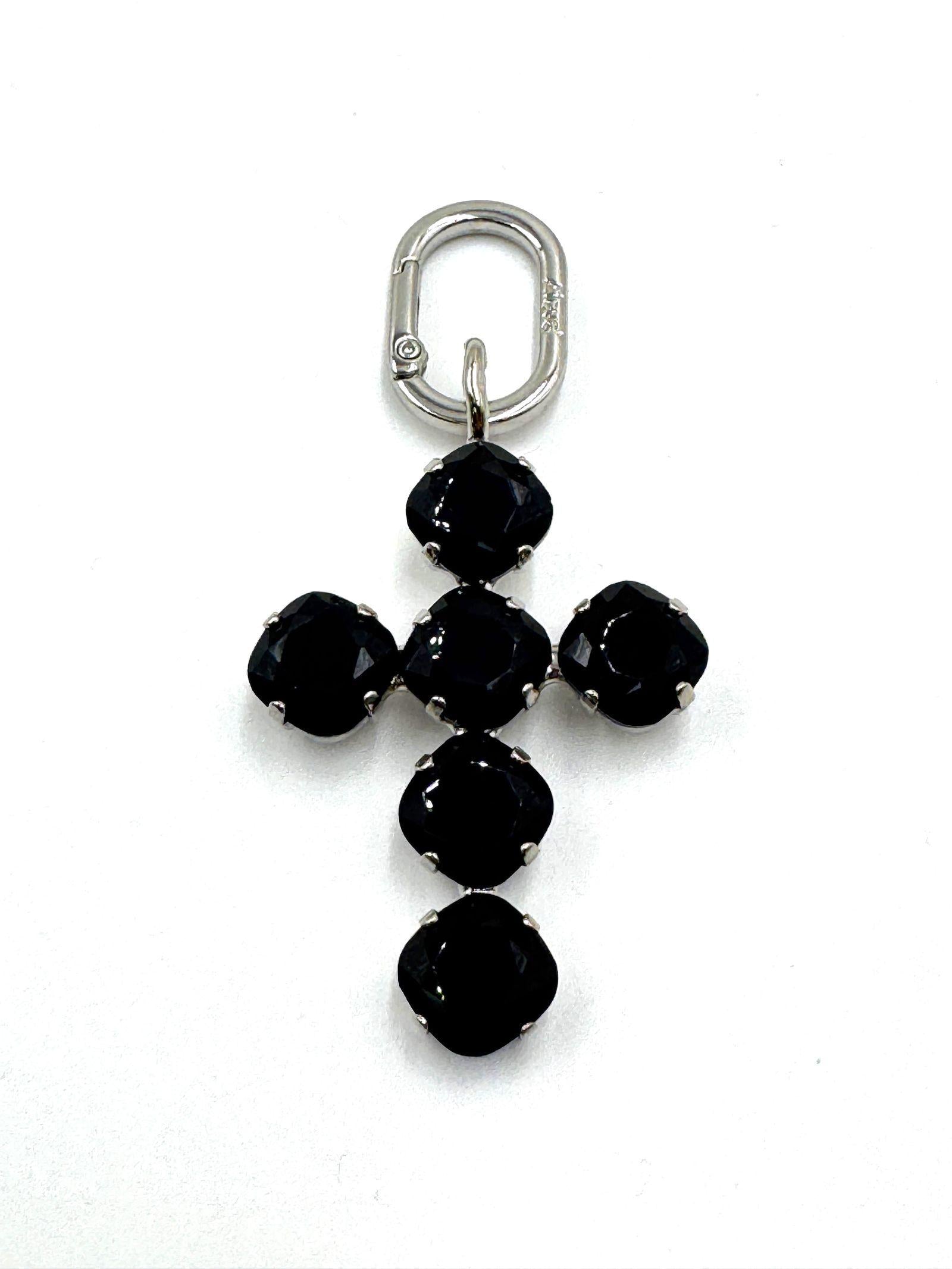 Ciondolo Princess a forma di croce mini, misura 5cm, realizzato a mano con materiale di alta qualità, in ottone, colore argento satinato, con moschettone colore argento satinato, che garantisce chiusura e apertura sicura del gioiello. La croce impreziosita da cristalli colore nero.