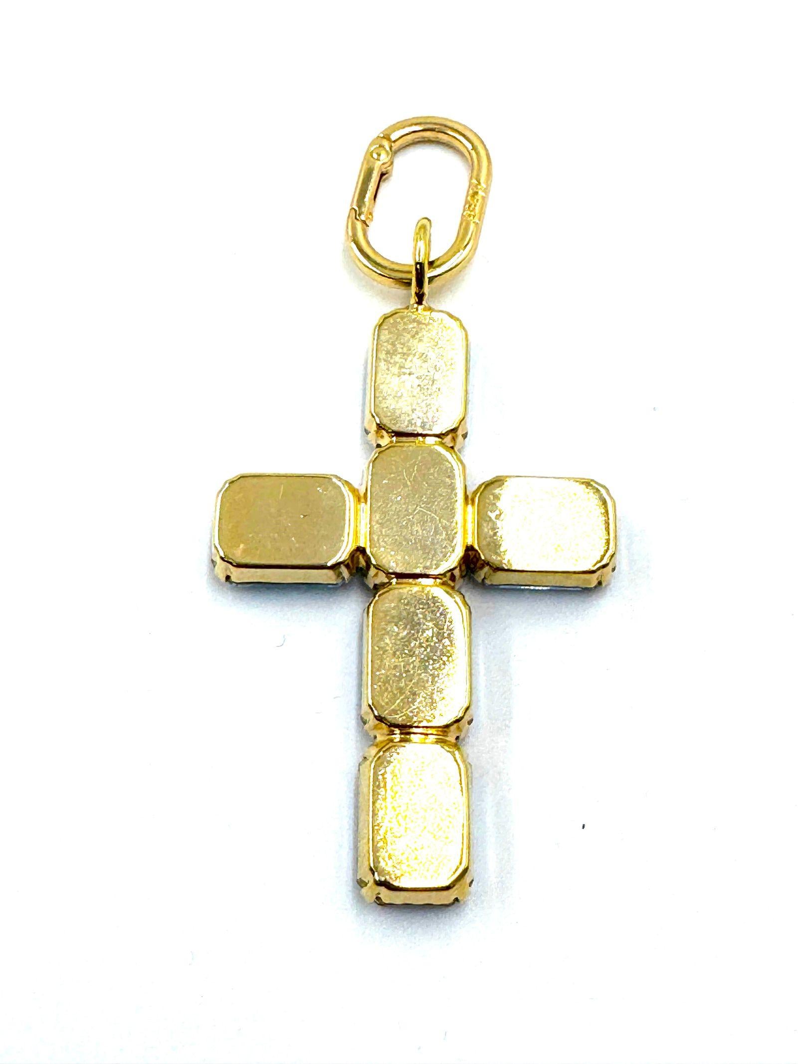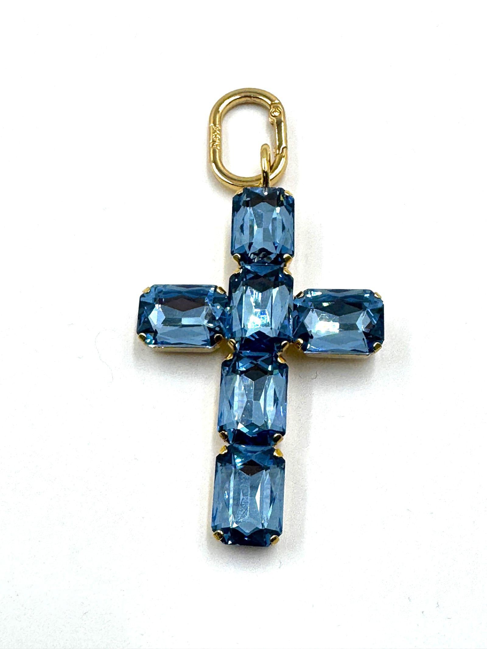 Ciondolo Princess a forma di croce grande, misura 7 cm, realizzato a mano con materiale di alta qualità, in ottone, colore oro satinato, con moschettone oro satinato, che garantisce chiusura e apertura sicura del gioiello. La croce impreziosita da cristalli colore acquamarine.