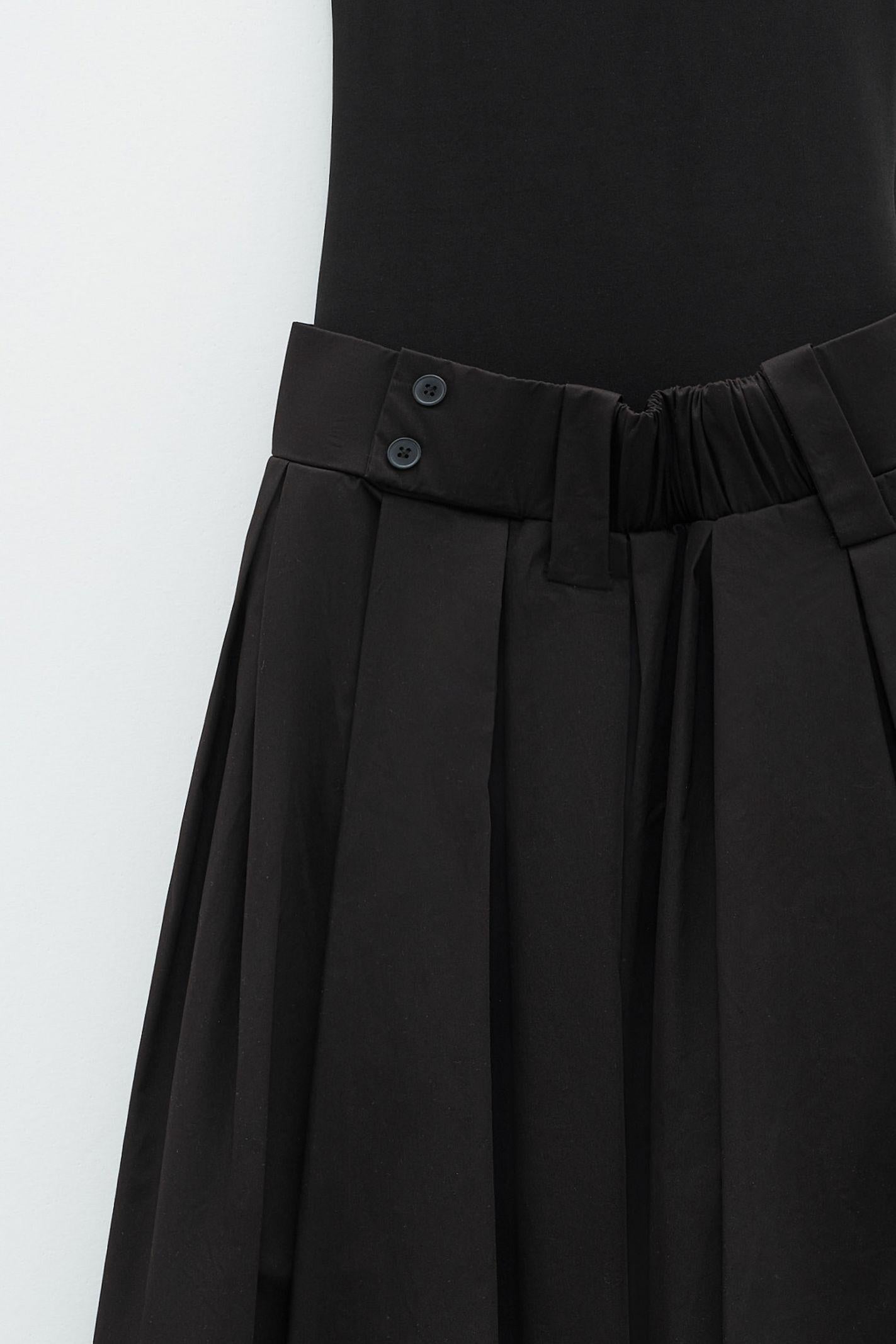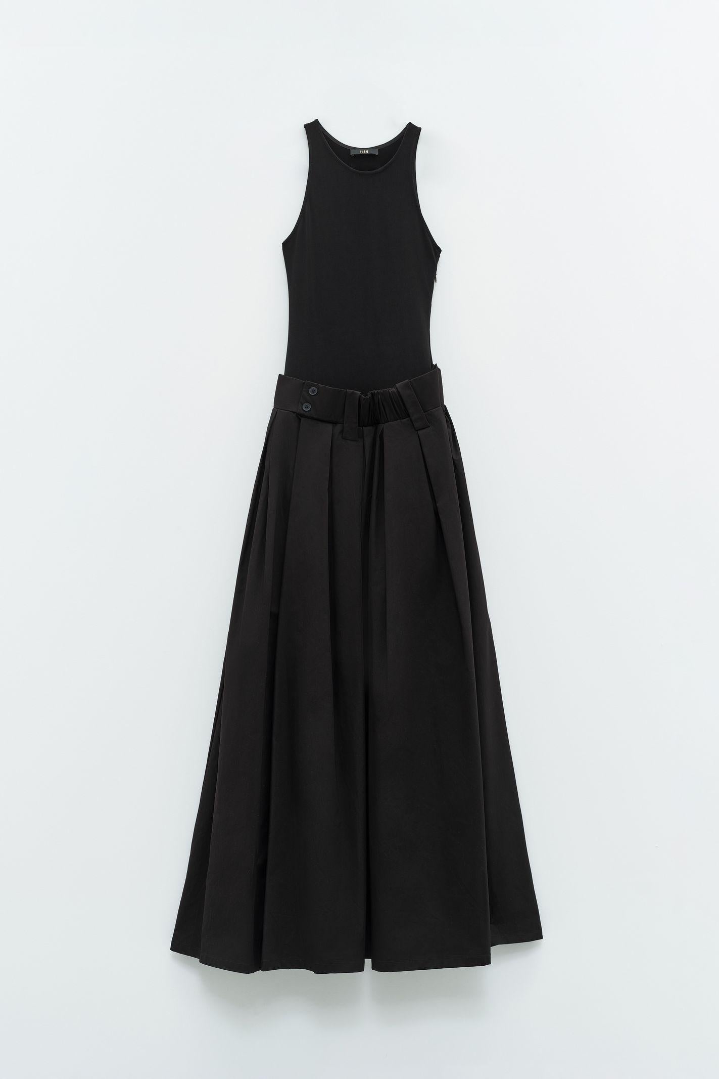 Abito lungo in tessuto tipo taffetà leggero, con effetto semi-opaco e mano leggermente croccante, ideale per l'uso quotidiano. Il design è composto da un corpino stile canotta, con spalline sottili e scollo dritto. La parte inferiore caratterizzata da una gonna a vita alta, plisssè ampia e strutturata, che garantisce libertà di movimento, con tasche laterali a filo inserite nei fianchi, pratiche ma discrete.