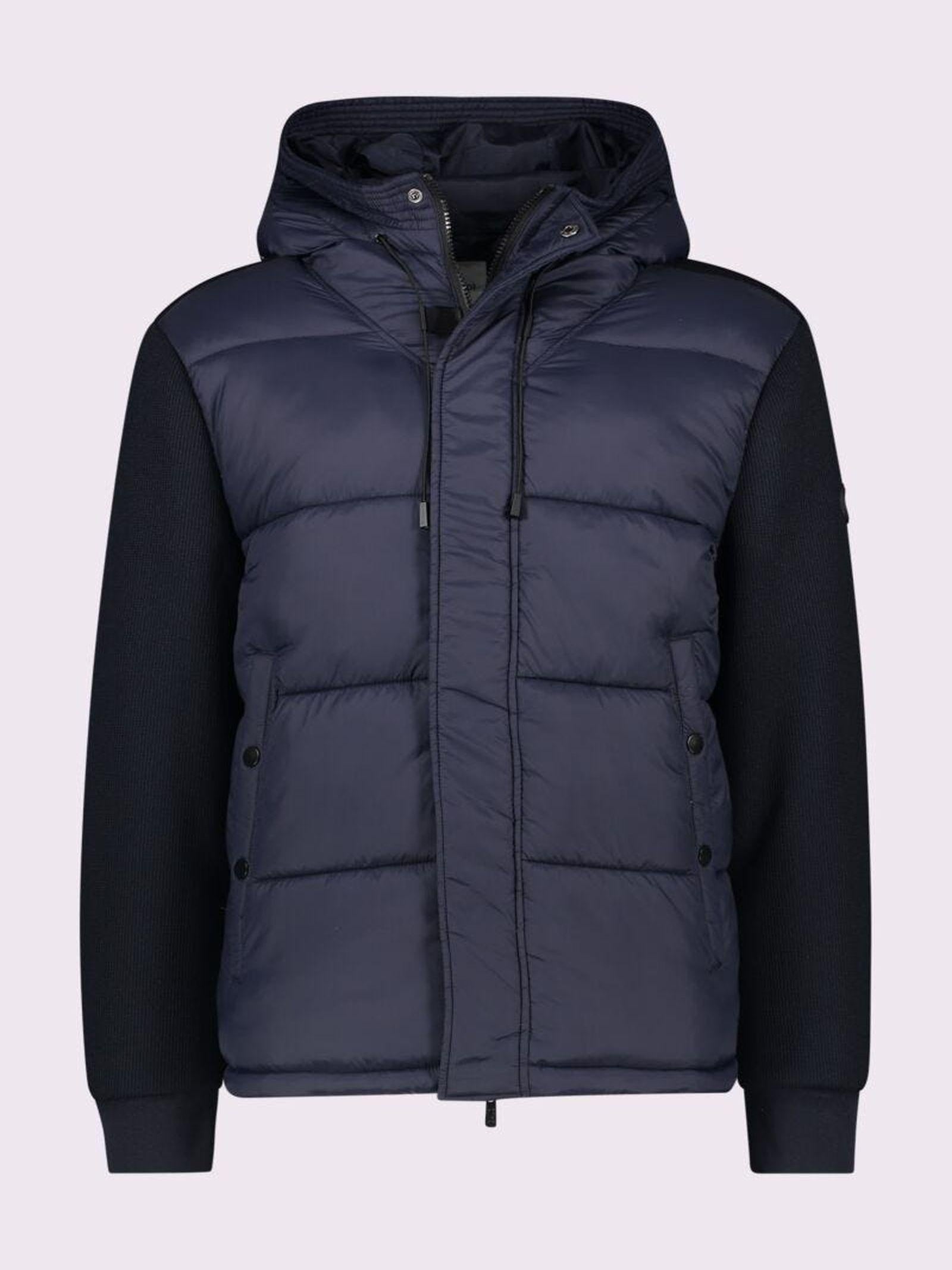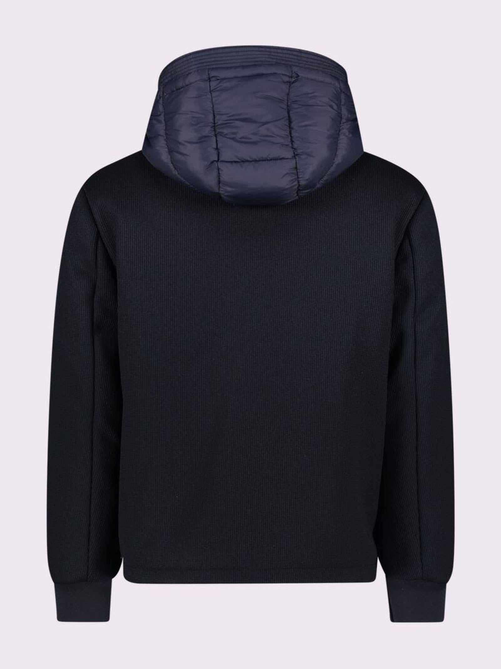Piumino in nylon con trapuntatura a righe, caratterizzato da cappuccio con coulisse e maniche in maglia a coste elasticizzata, tasche laterali con bottoni a pressione, logo sulla manica, chiusura coperta con bottoni a pressione euna zip, fodera interna.