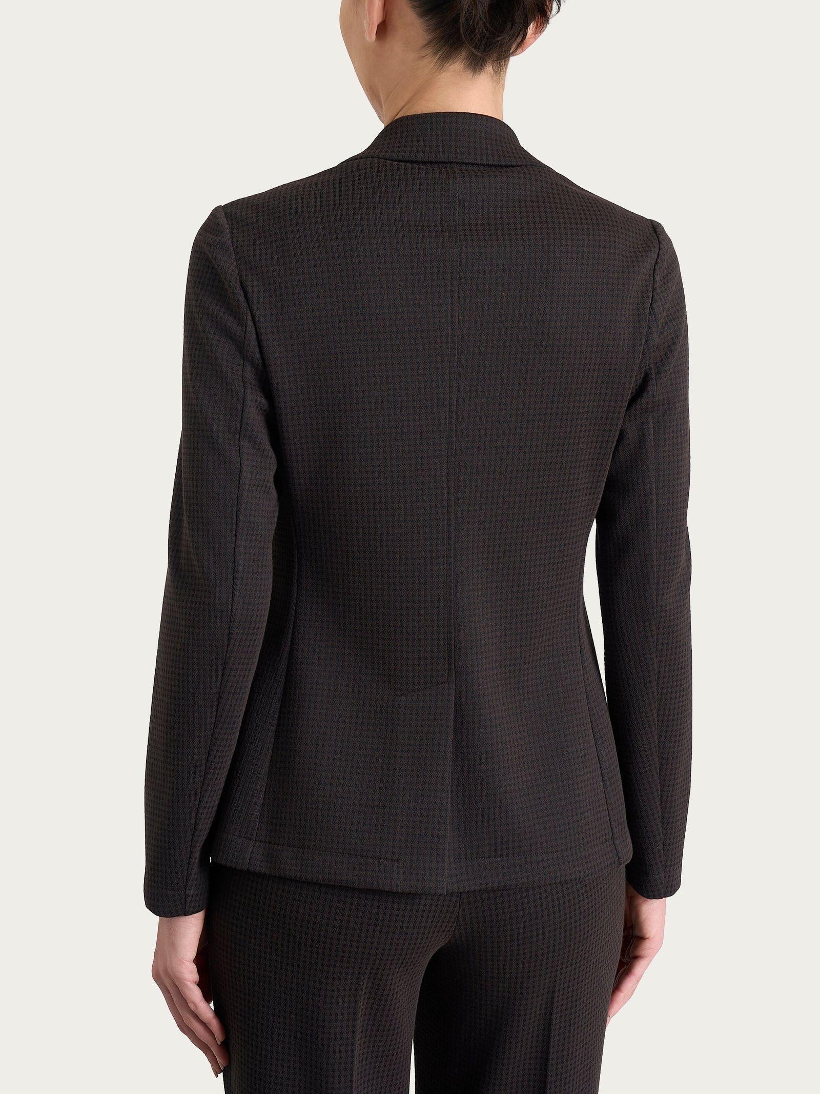 Blazer corto costruito con chiusura a due bottoni e collo rever classico. Ha una vestibilità regular pensata per valorizzare ogni silhouette e offrire comfort. Le tasche applicate oltre ad essere un importante dettaglio di stile, aggiungono praticità al capo. Caratterizzato da una fantasia micro check, motivo a quadretti di dimensioni ridotte, ordinati e regolari, che donano al tessuto un aspetto sobrio ma ricercato ed elegante. Realizzato in Eco Jacquard, un punto Milano elasticizzato che unisce la stabilità dei tessuti navetta con la flessibilità della maglia, permettendo la creazione di eleganti disegni tinto filo grazie alla tessitura jacquard. Ideale per ogni momento della giornata, si adatta con disinvoltura dall’ambiente professionale alle serate più raffinate, unendo stile e comodità.